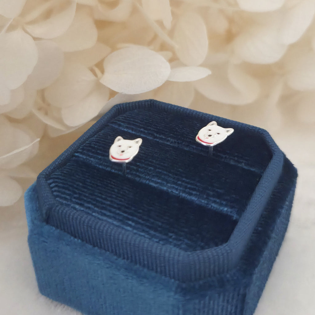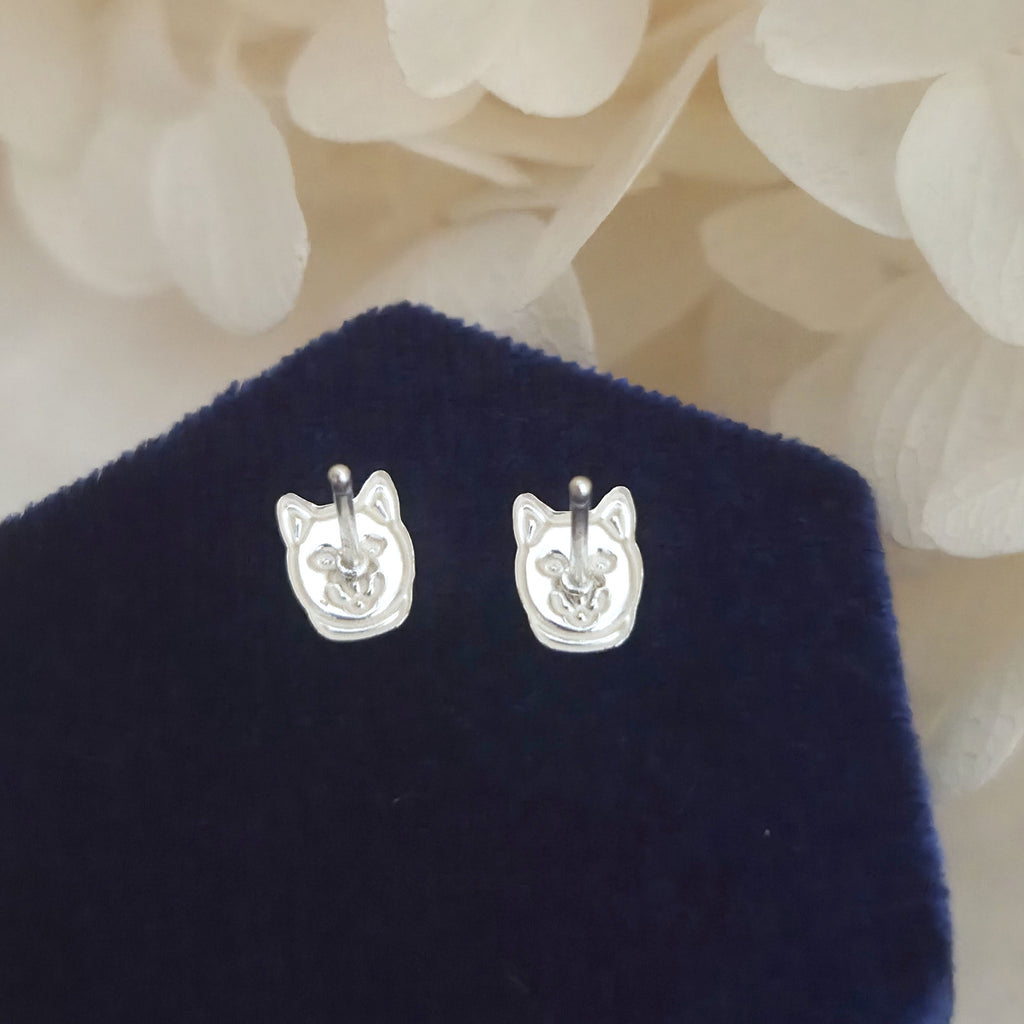 Adorable husky dog stud earrings in solid 925 sterling silver, detailed with enamel for a playful look. A sweet gift idea for pet and dog lovers.
