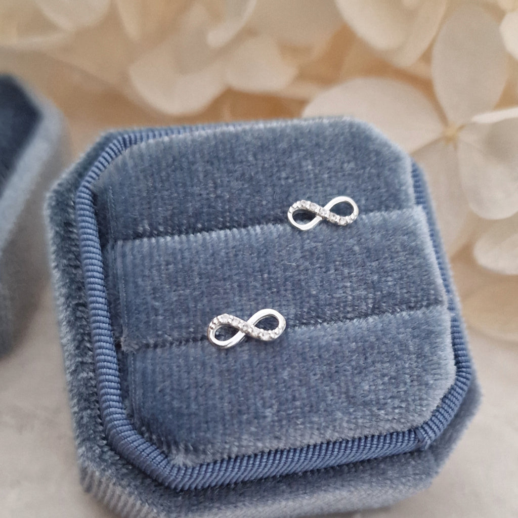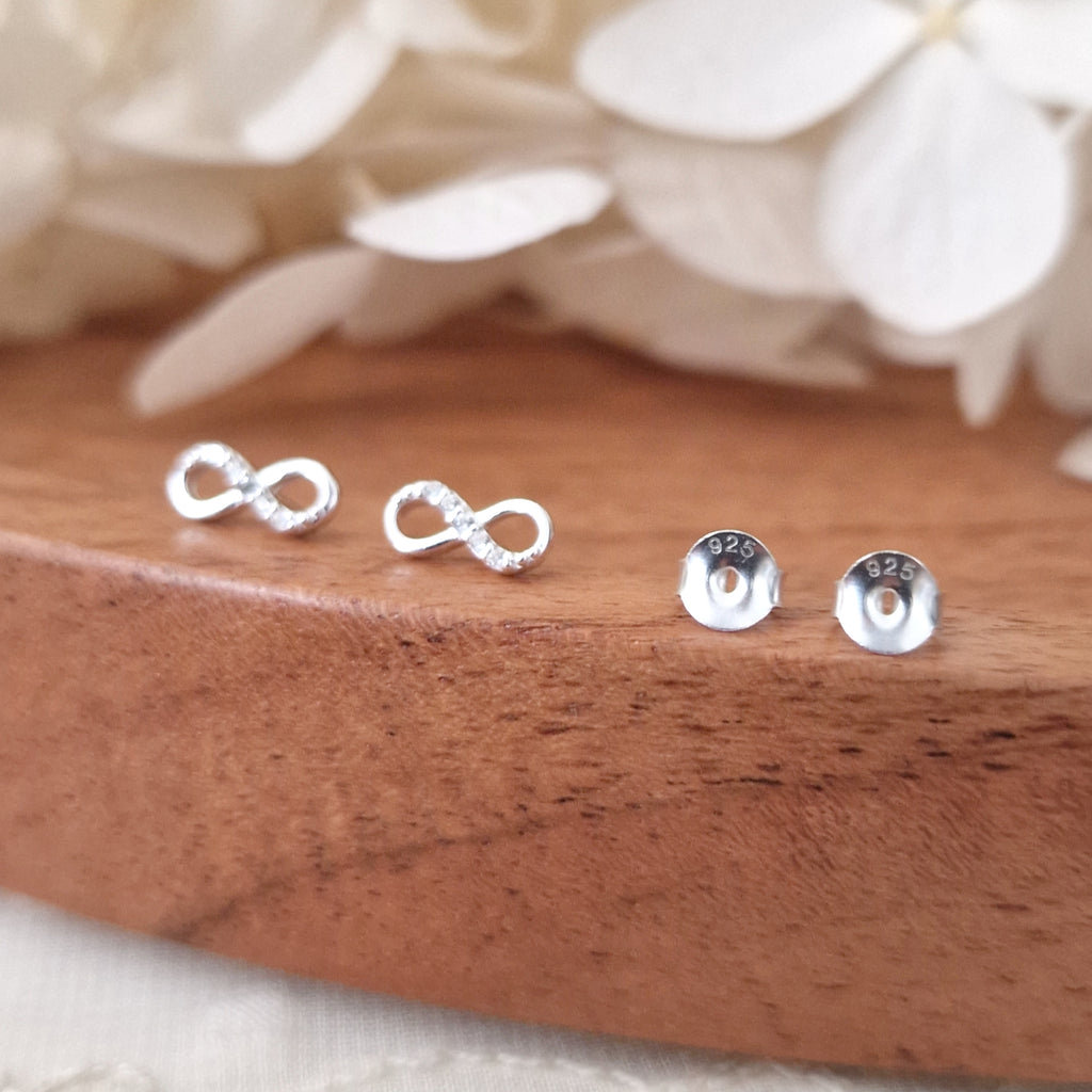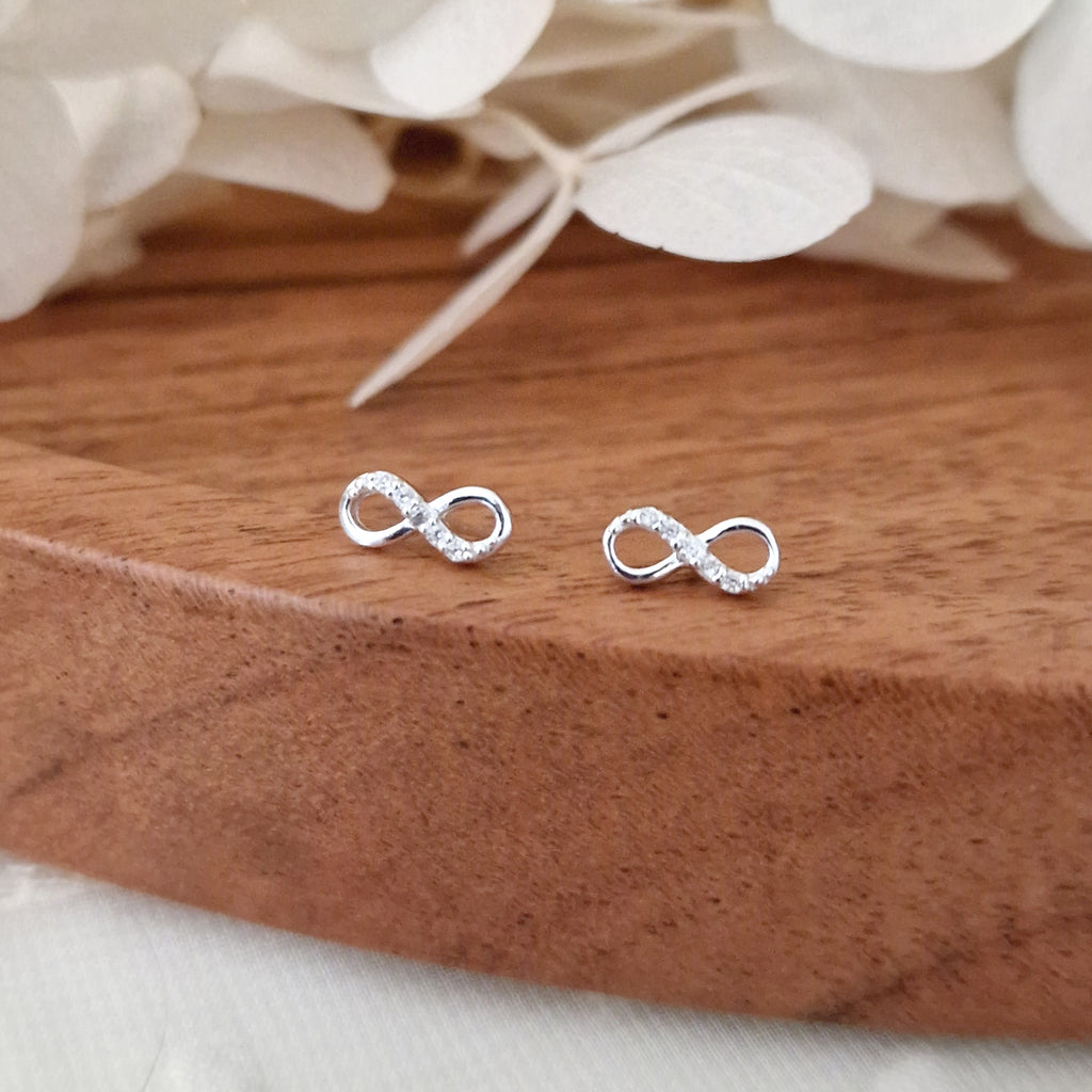 Infinity Stud Earrings in 925 Sterling Silver – Solid Silver Infinity Symbol Studs with White CZ Cubic Zirconia