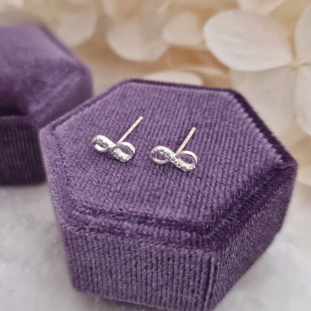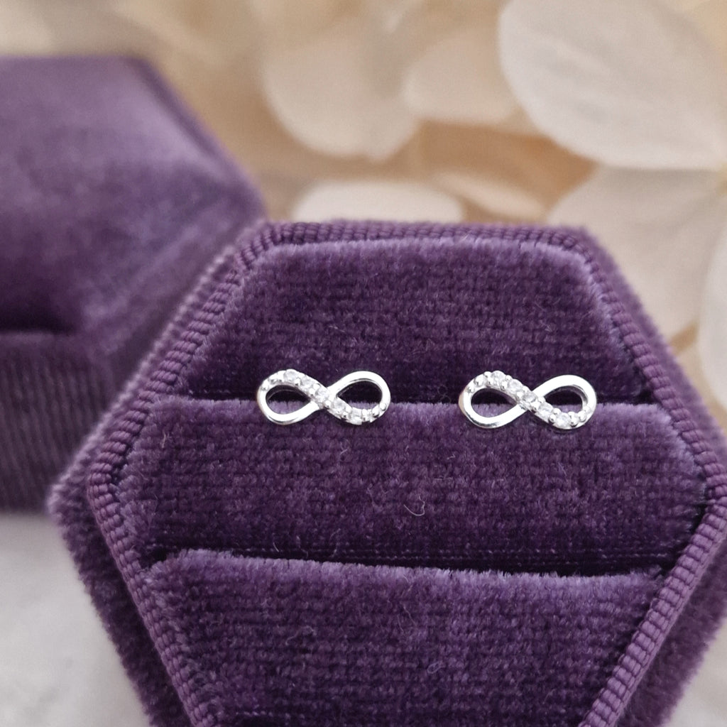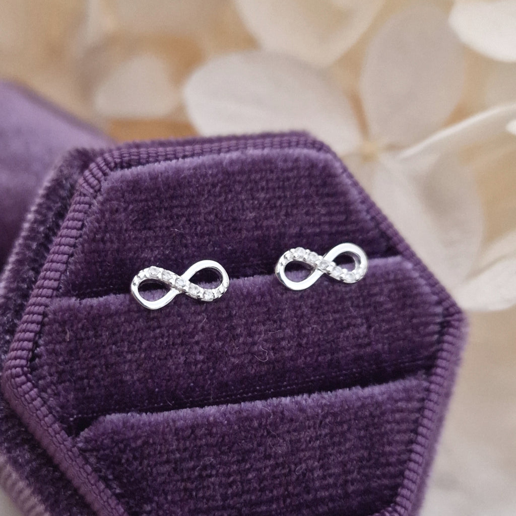Infinity Stud Earrings in 925 Sterling Silver – Solid Silver Infinity Symbol Studs with White CZ Cubic Zirconia