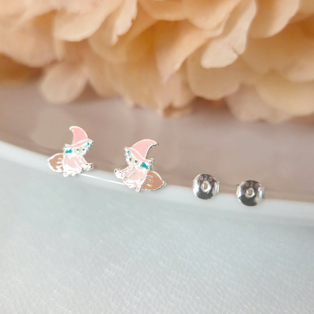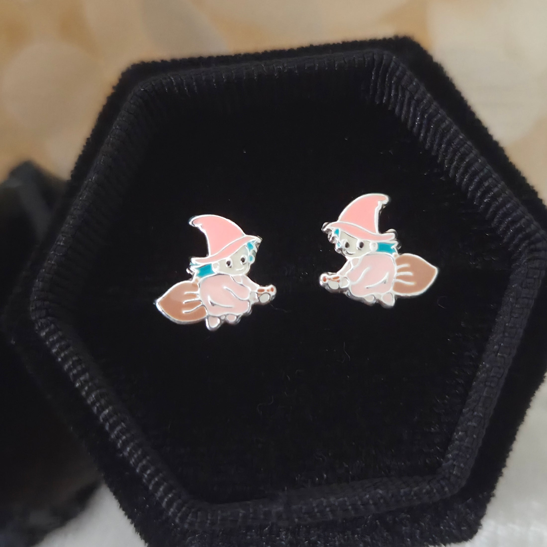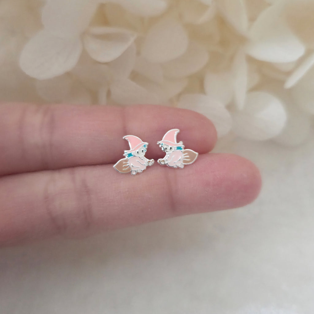 Light Pink Witch on Broom Stud Earrings in 925 Sterling Silver – Solid Silver Halloween Studs