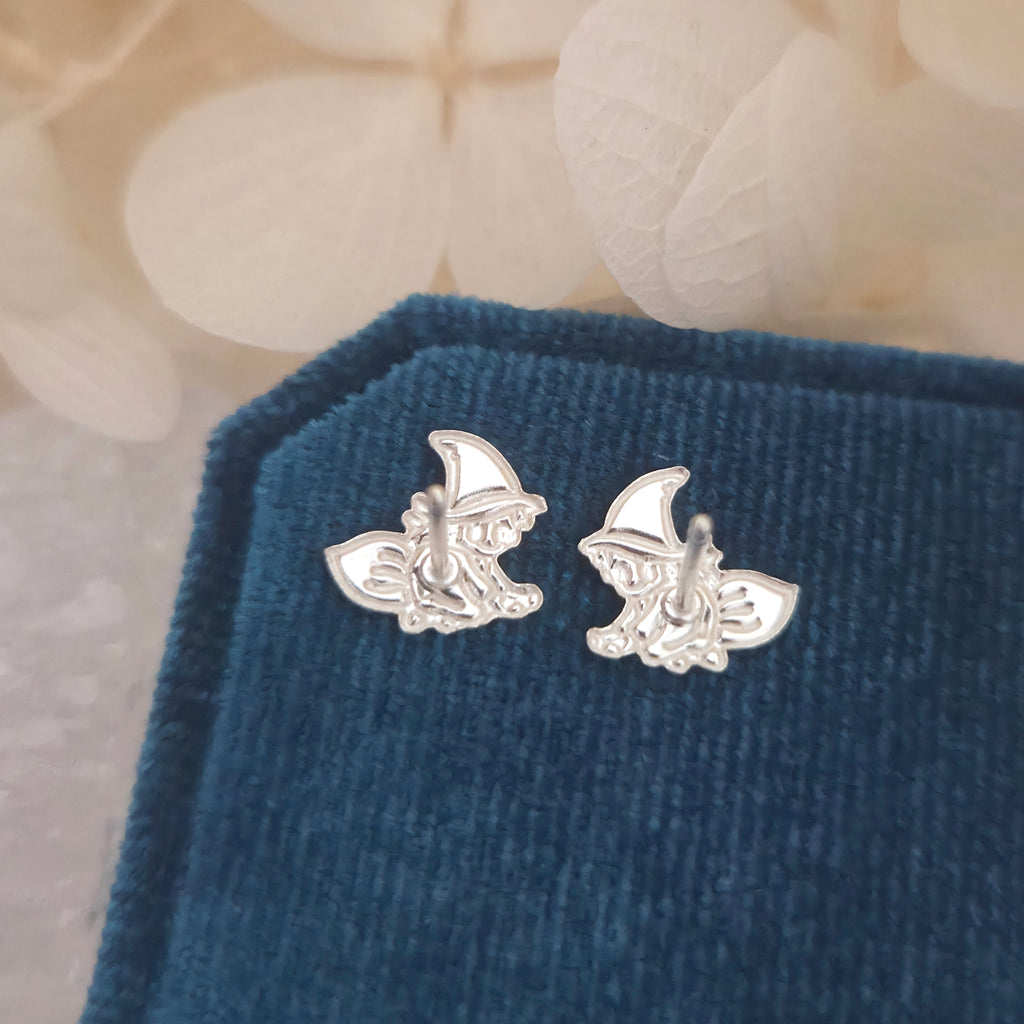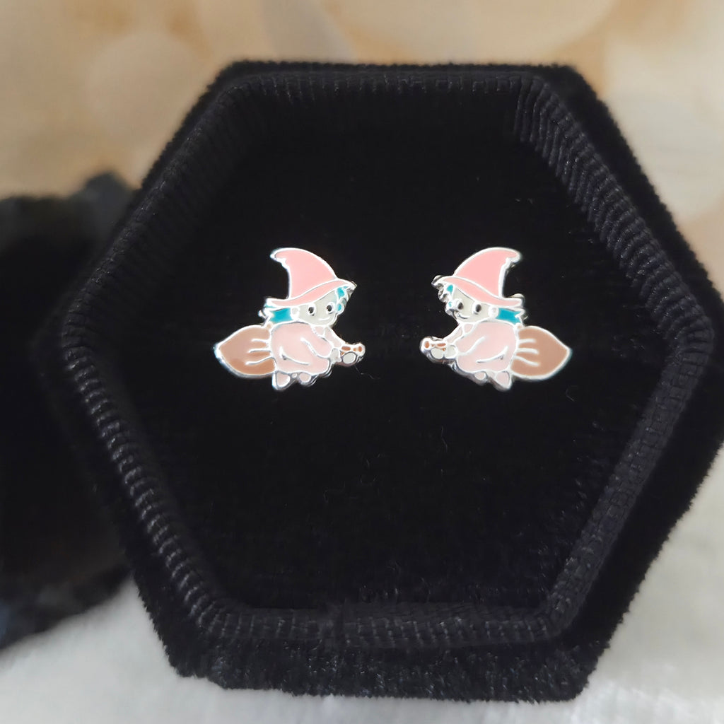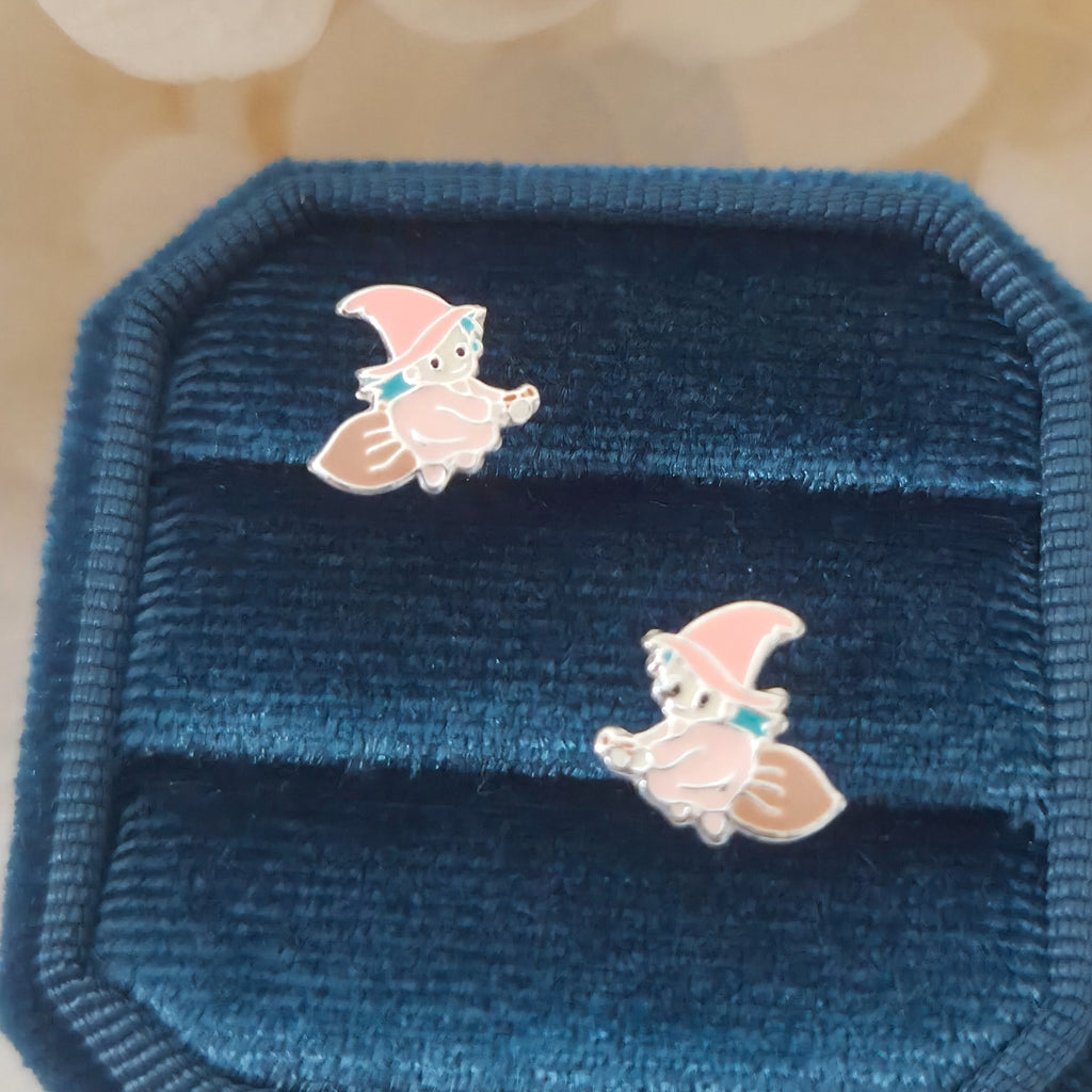 Light Pink Witch on Broom Stud Earrings in 925 Sterling Silver – Solid Silver Halloween Studs