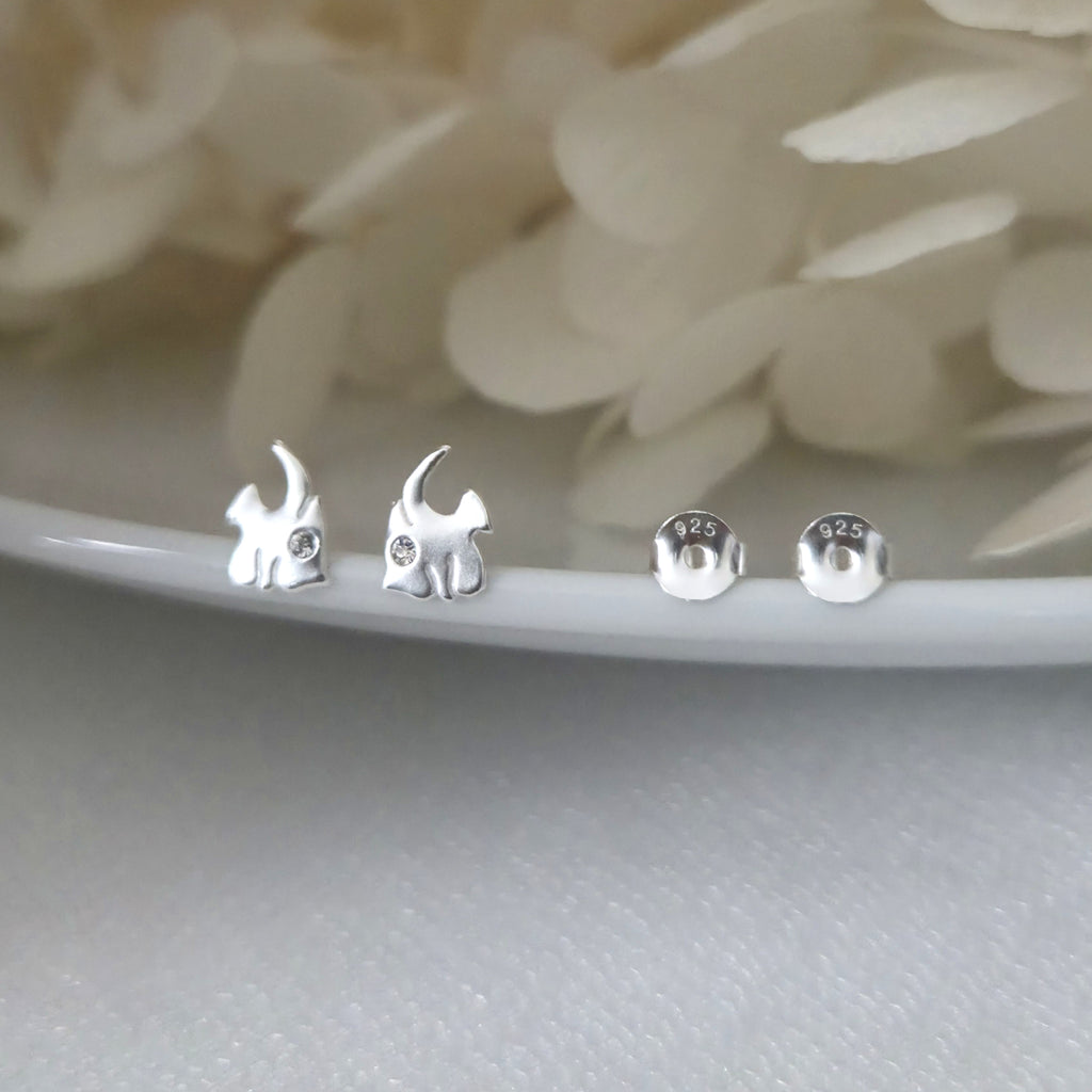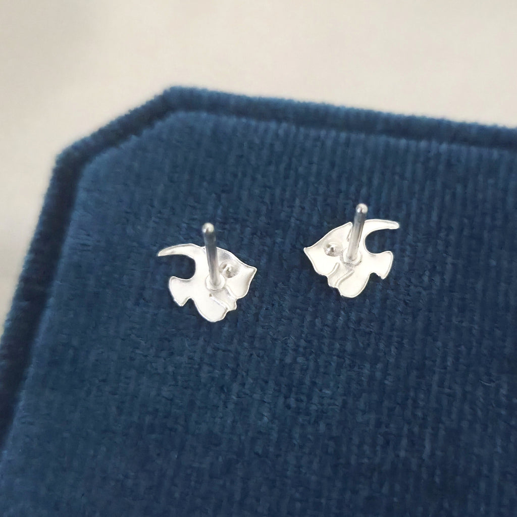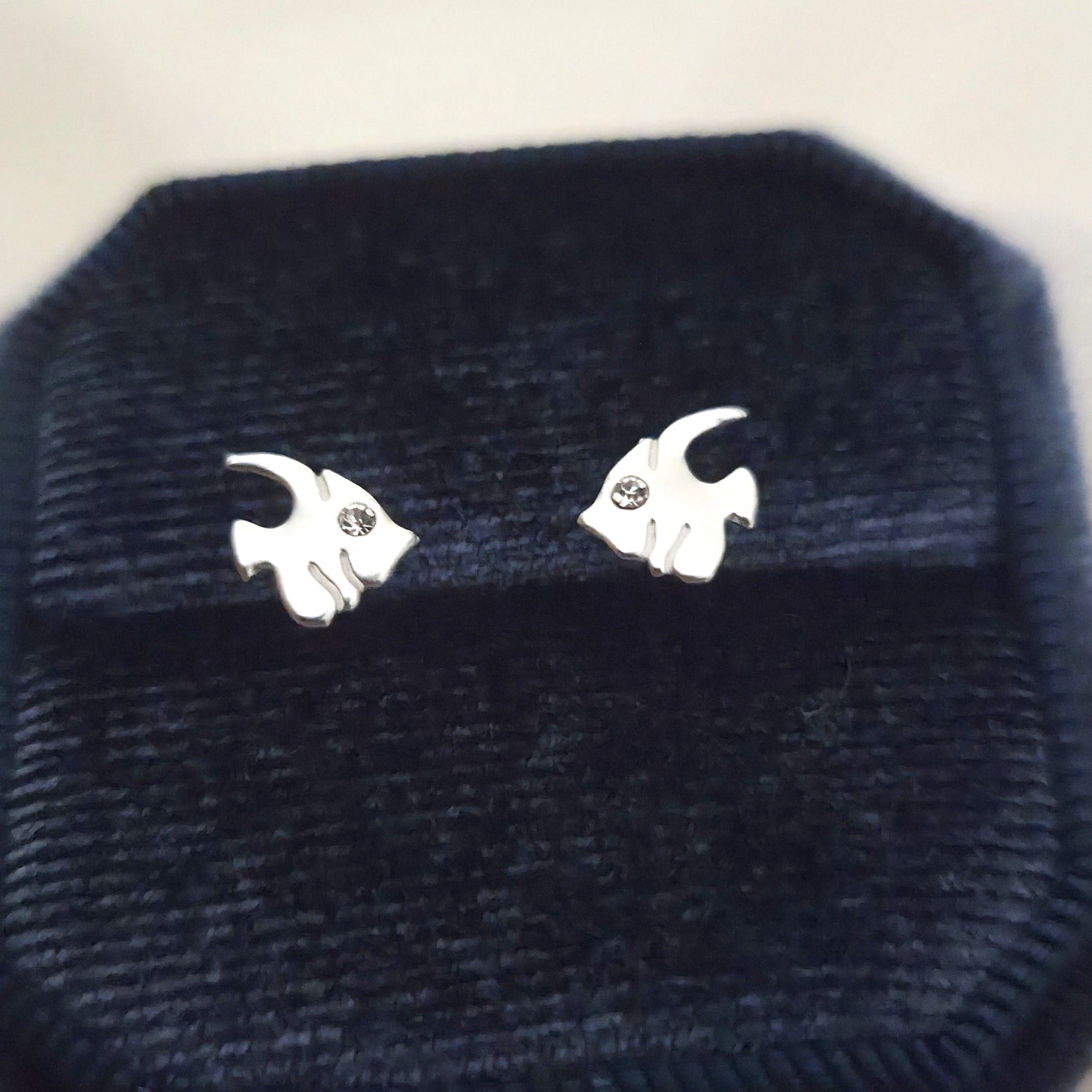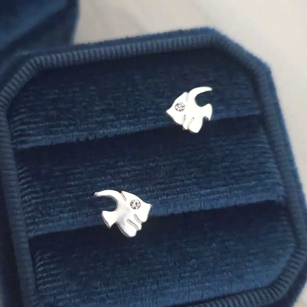 Adorable tiny fish-shaped studs in solid 925 sterling silver, featuring a sparkling crystal eye. Perfect ocean-inspired jewelry for everyday wear or a beachy gift.