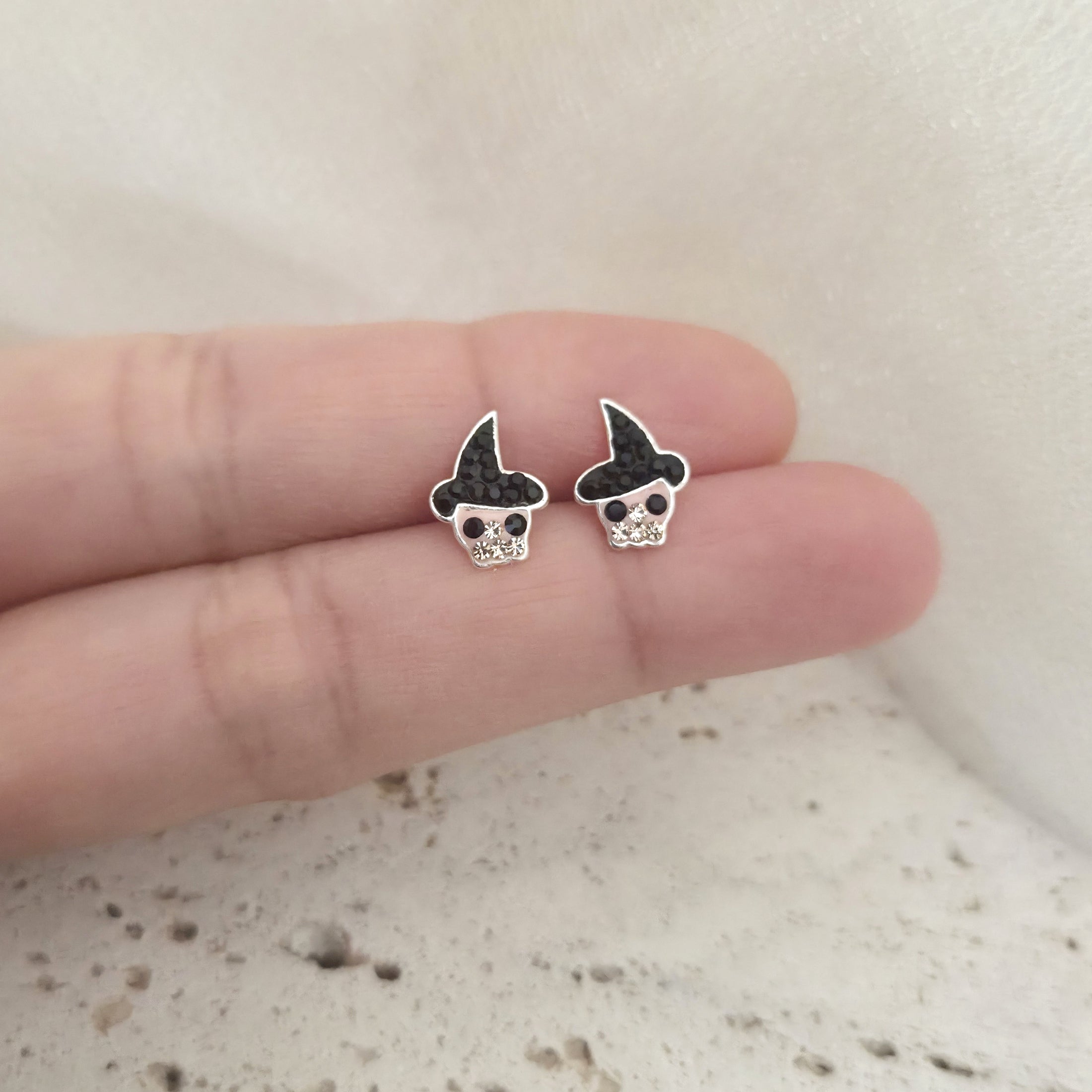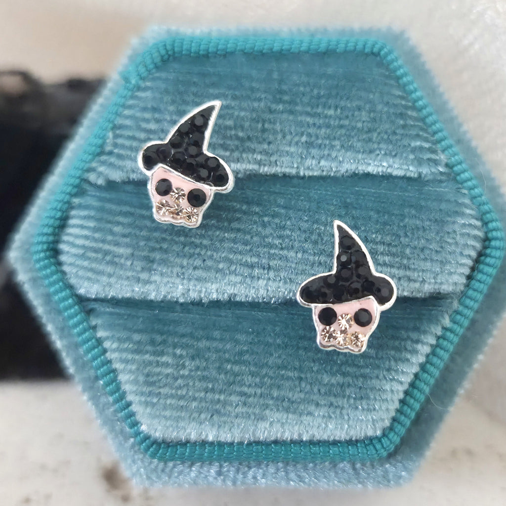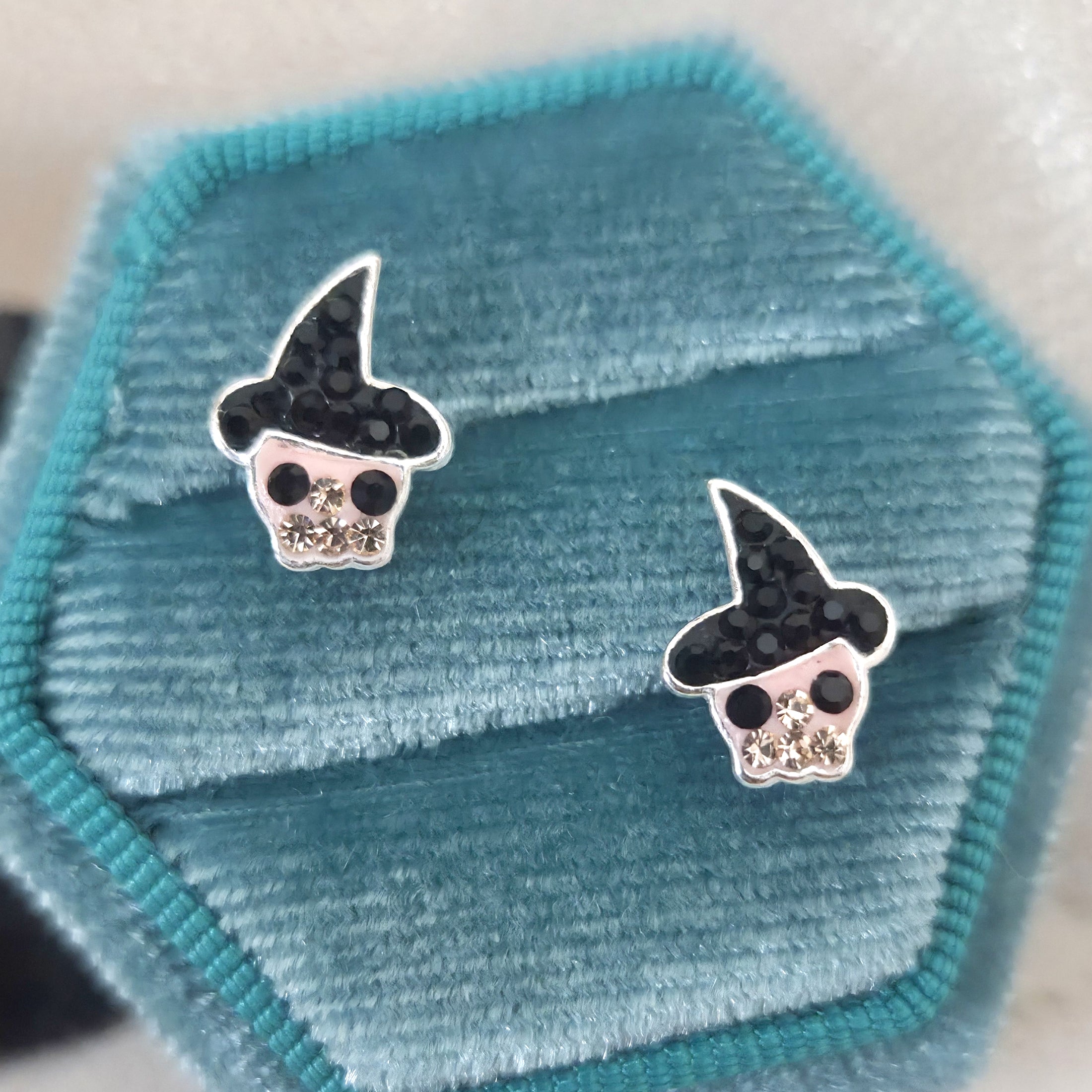 Mini cute skull stud earrings with black witch hats in solid 925 sterling silver, accented with crystals. A playful gothic accessory for Halloween.