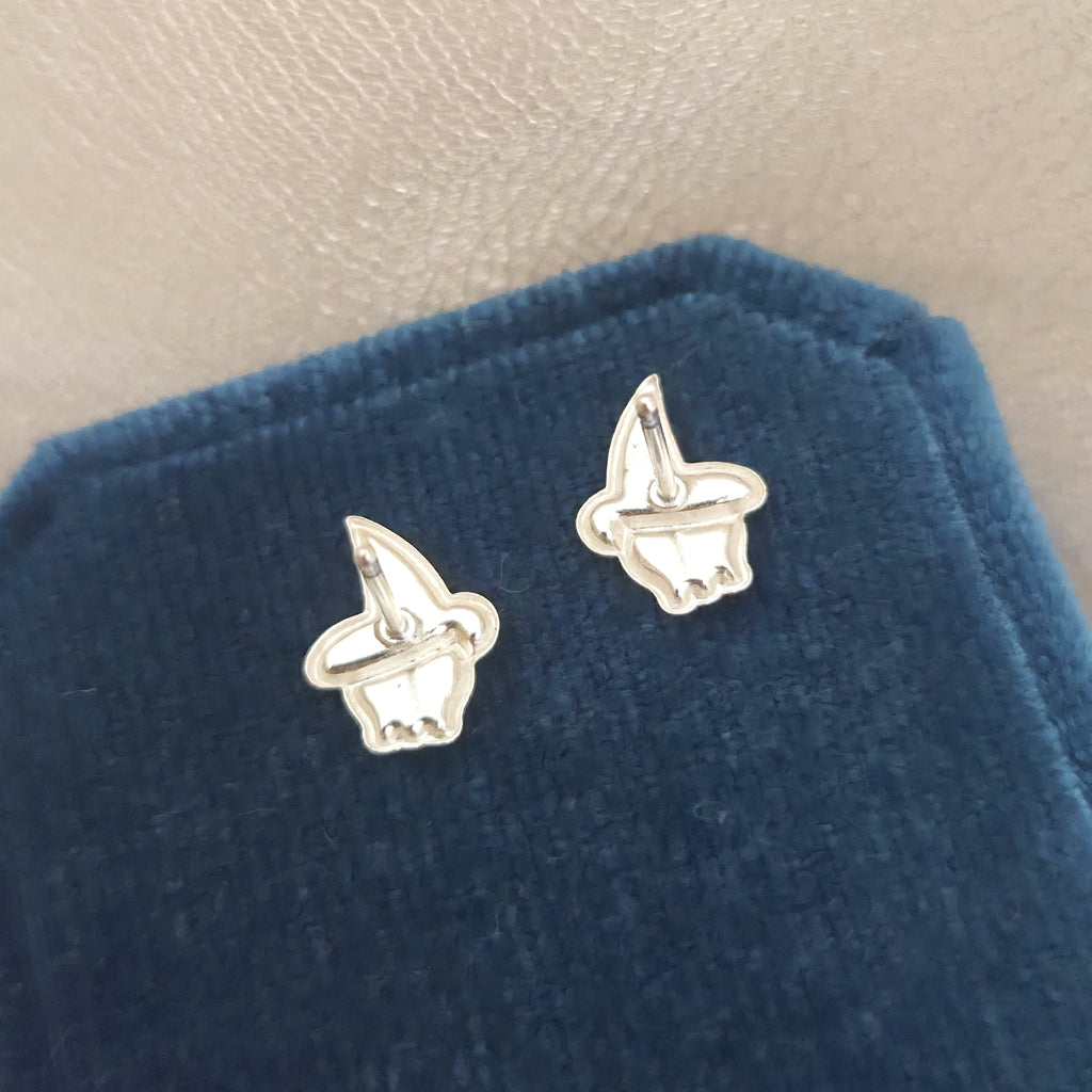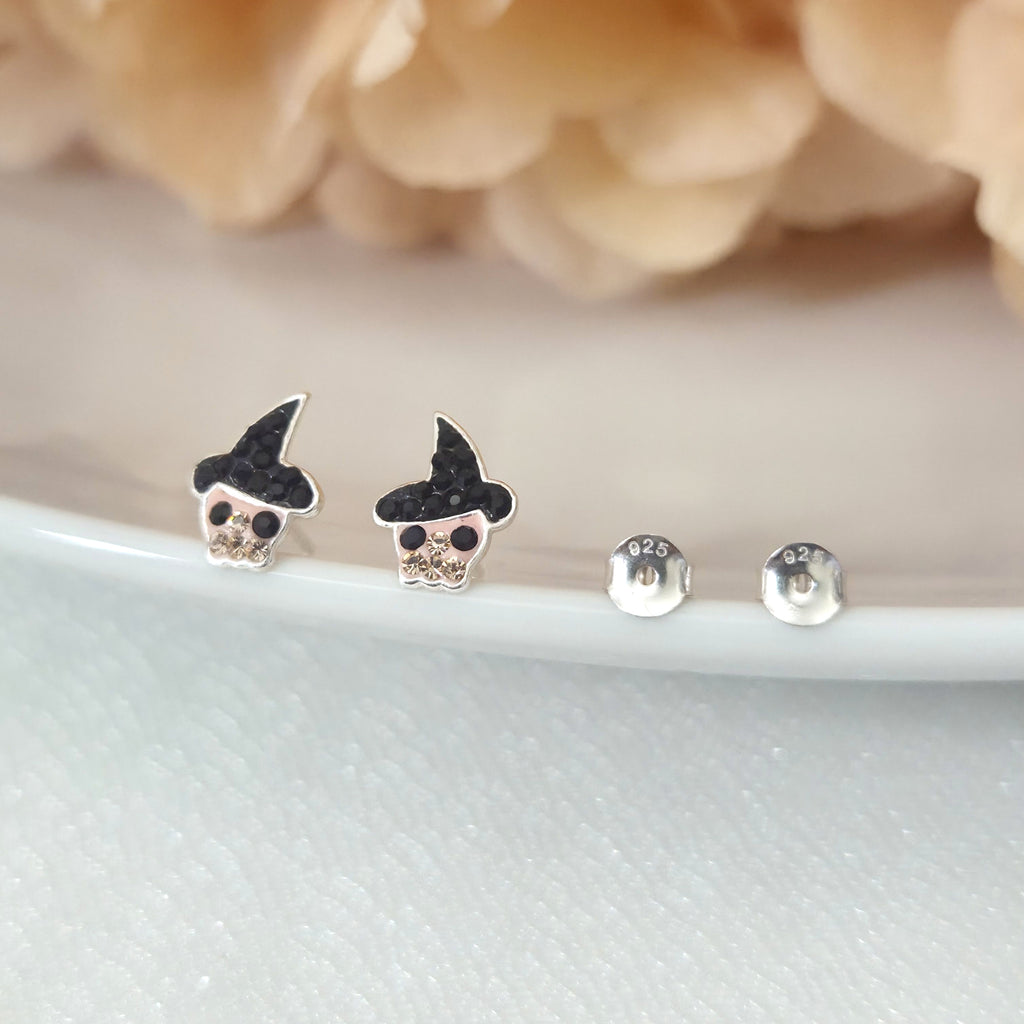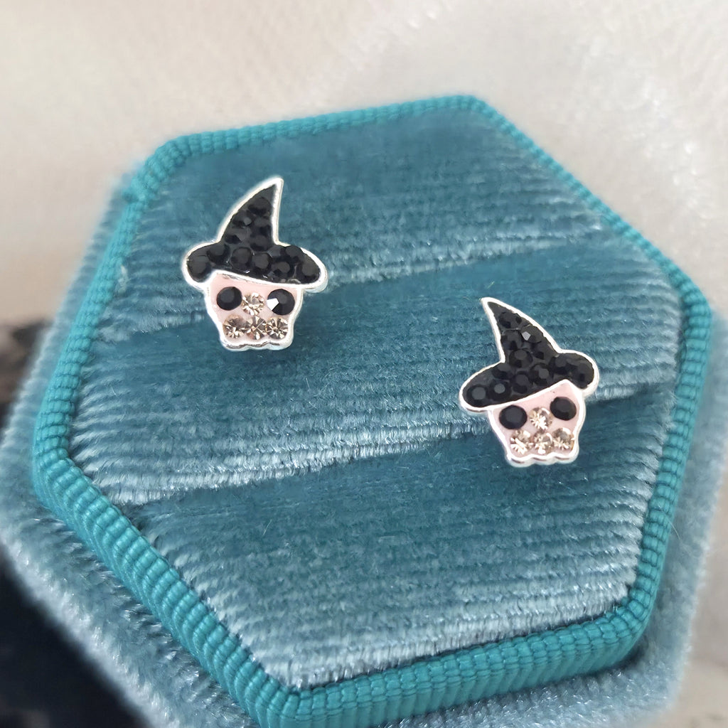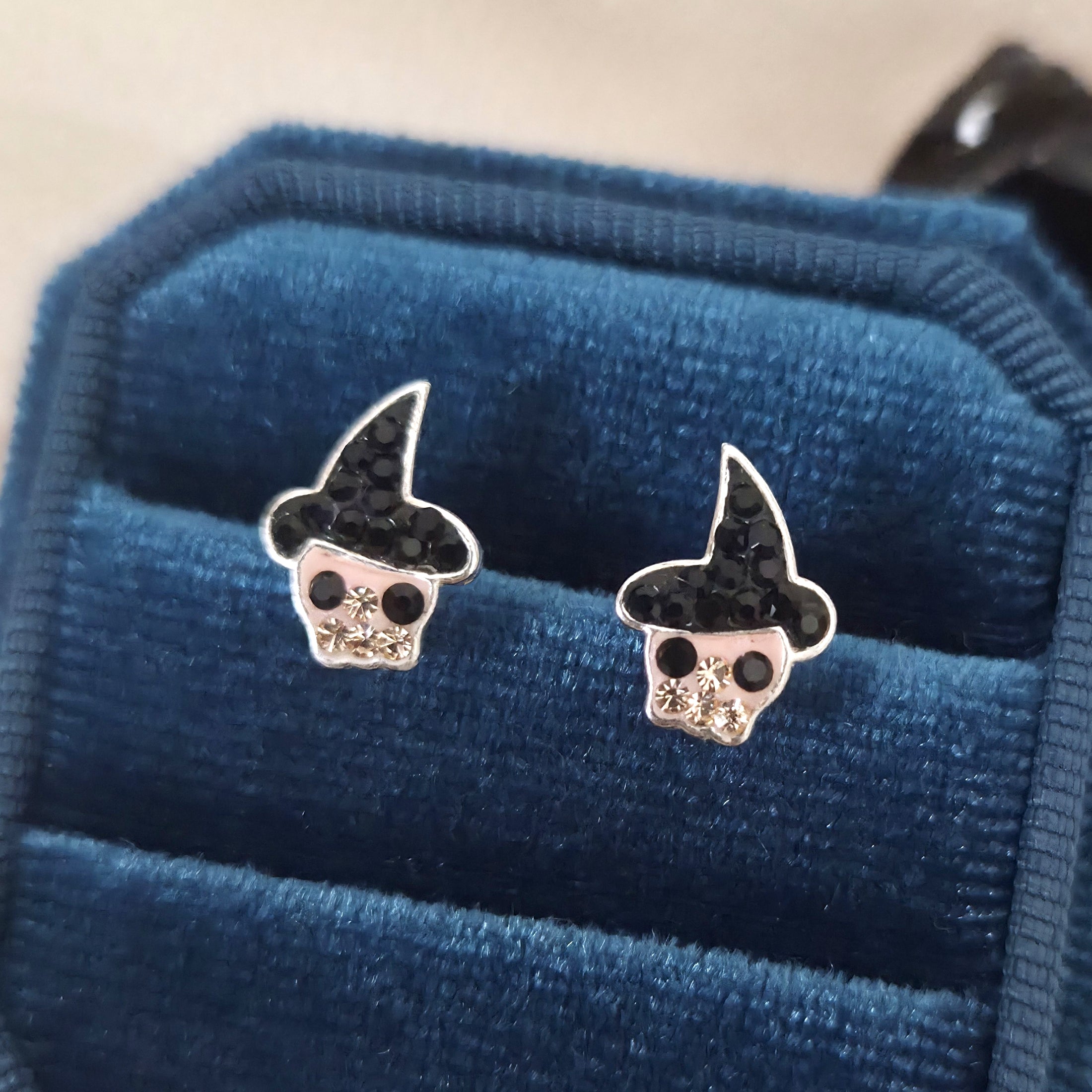 Mini cute skull stud earrings with black witch hats in solid 925 sterling silver, accented with crystals. A playful gothic accessory for Halloween.