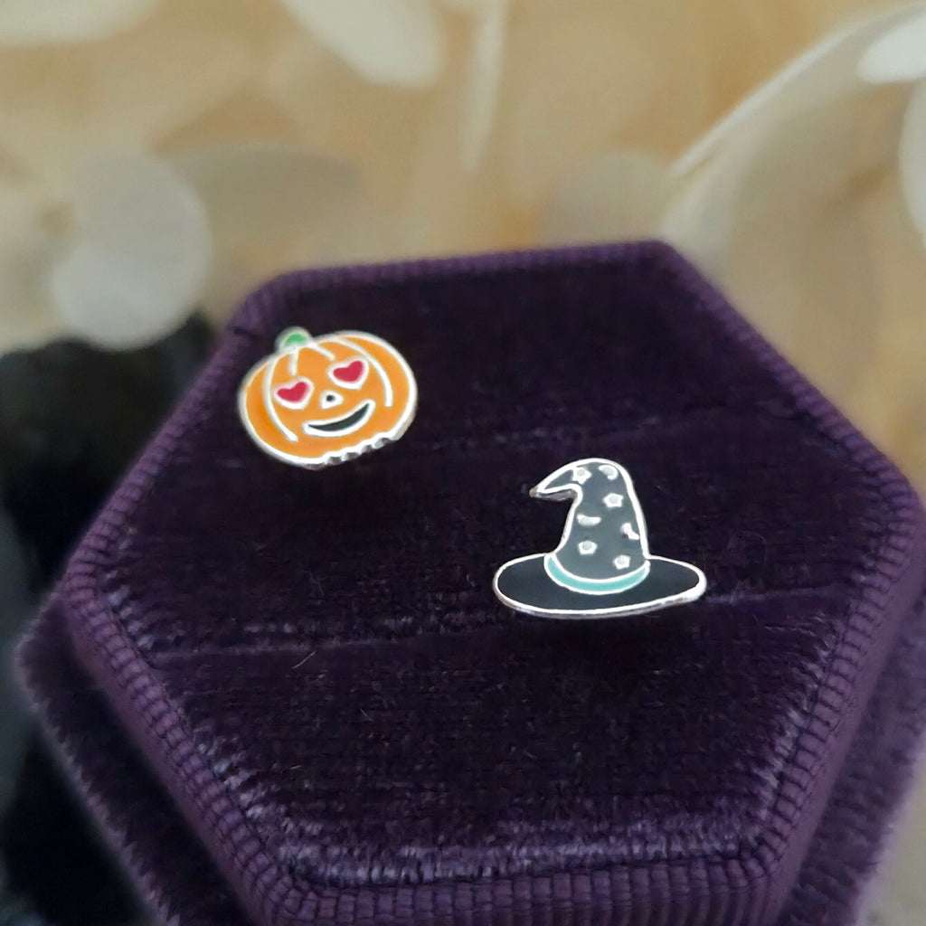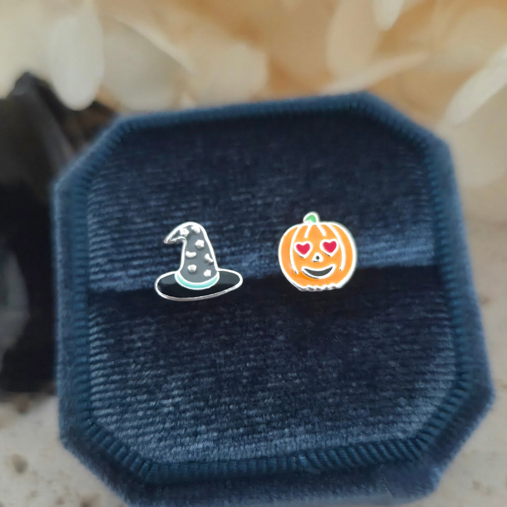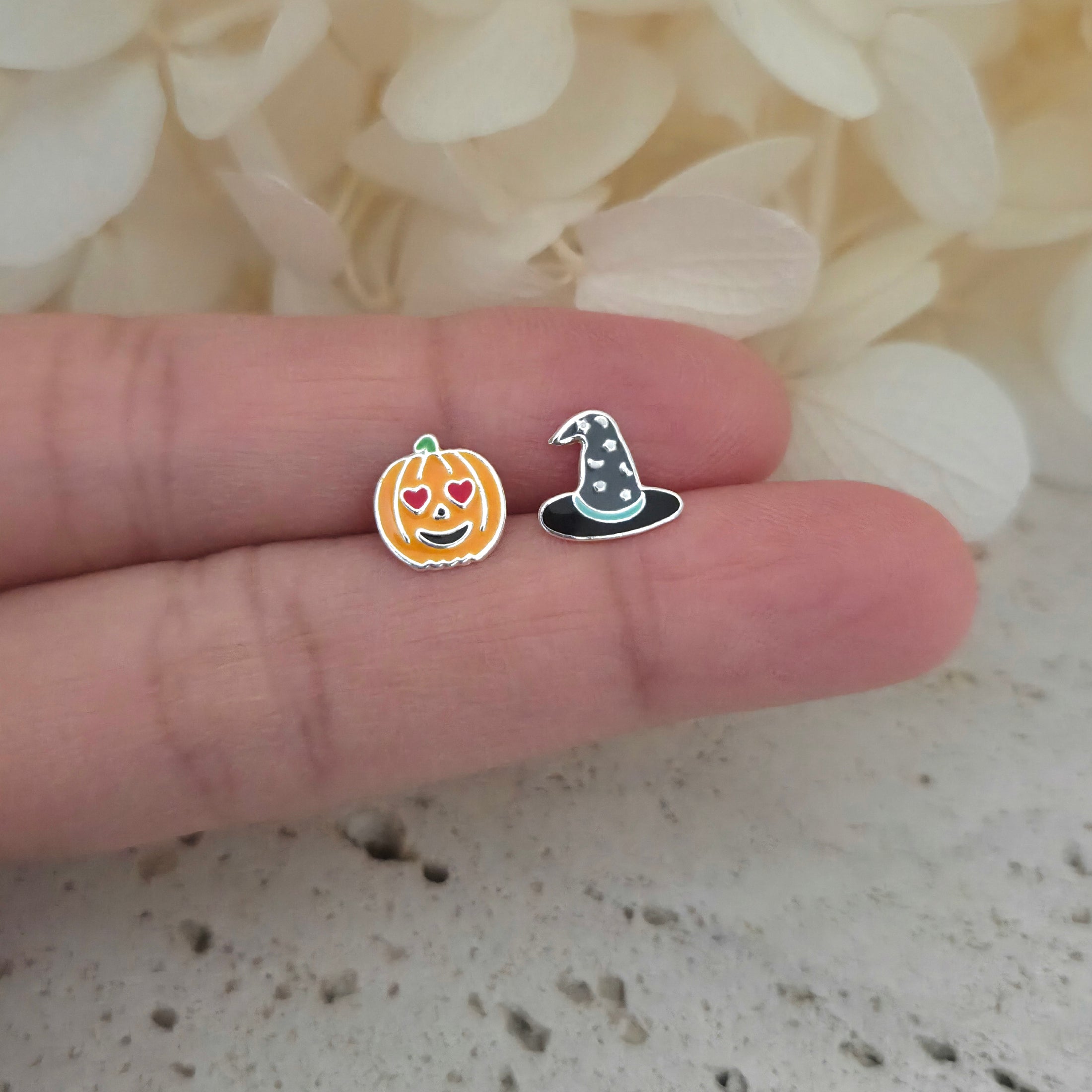 Mismatched Black Witch Hat and Orange Pumpkin Stud Earrings in 925 Sterling Silver – Solid Silver Halloween Studs