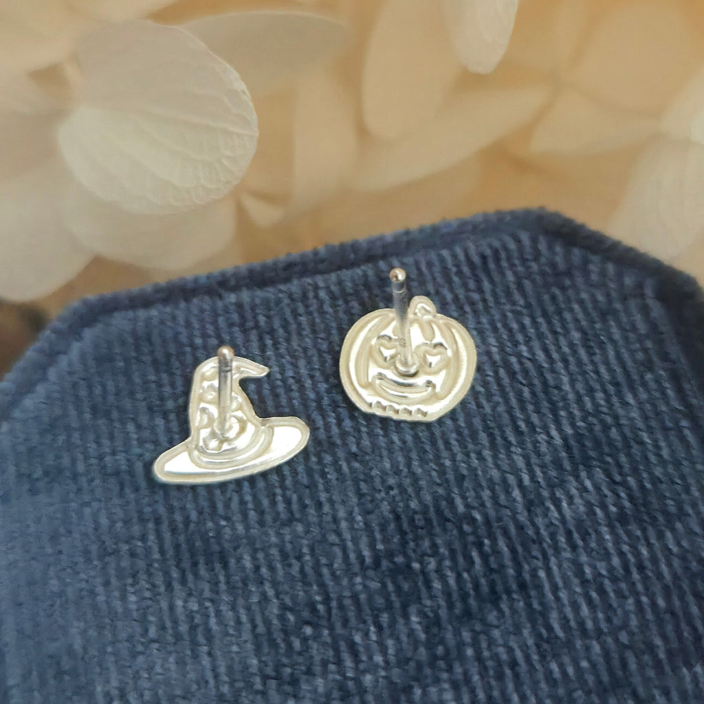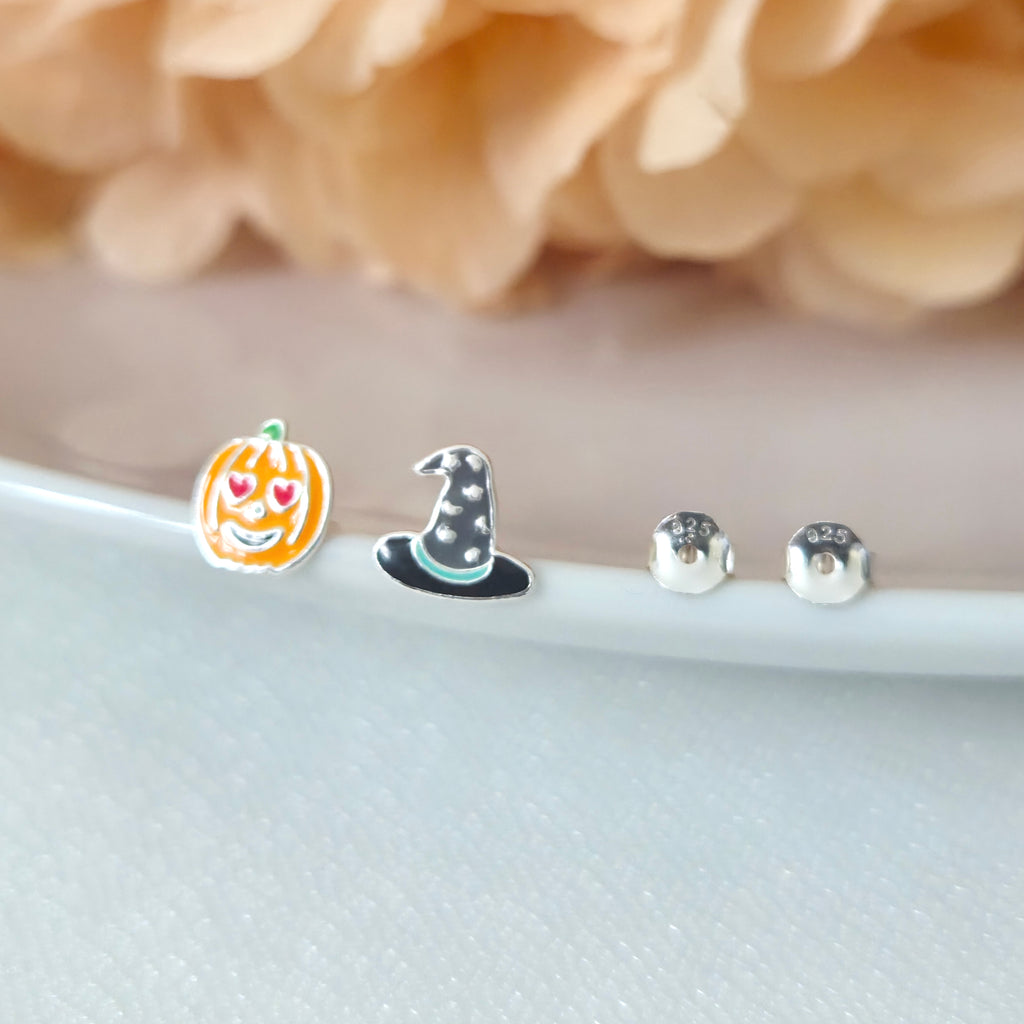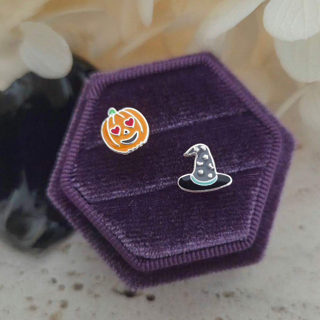 Mismatched Black Witch Hat and Orange Pumpkin Stud Earrings in 925 Sterling Silver – Solid Silver Halloween Studs