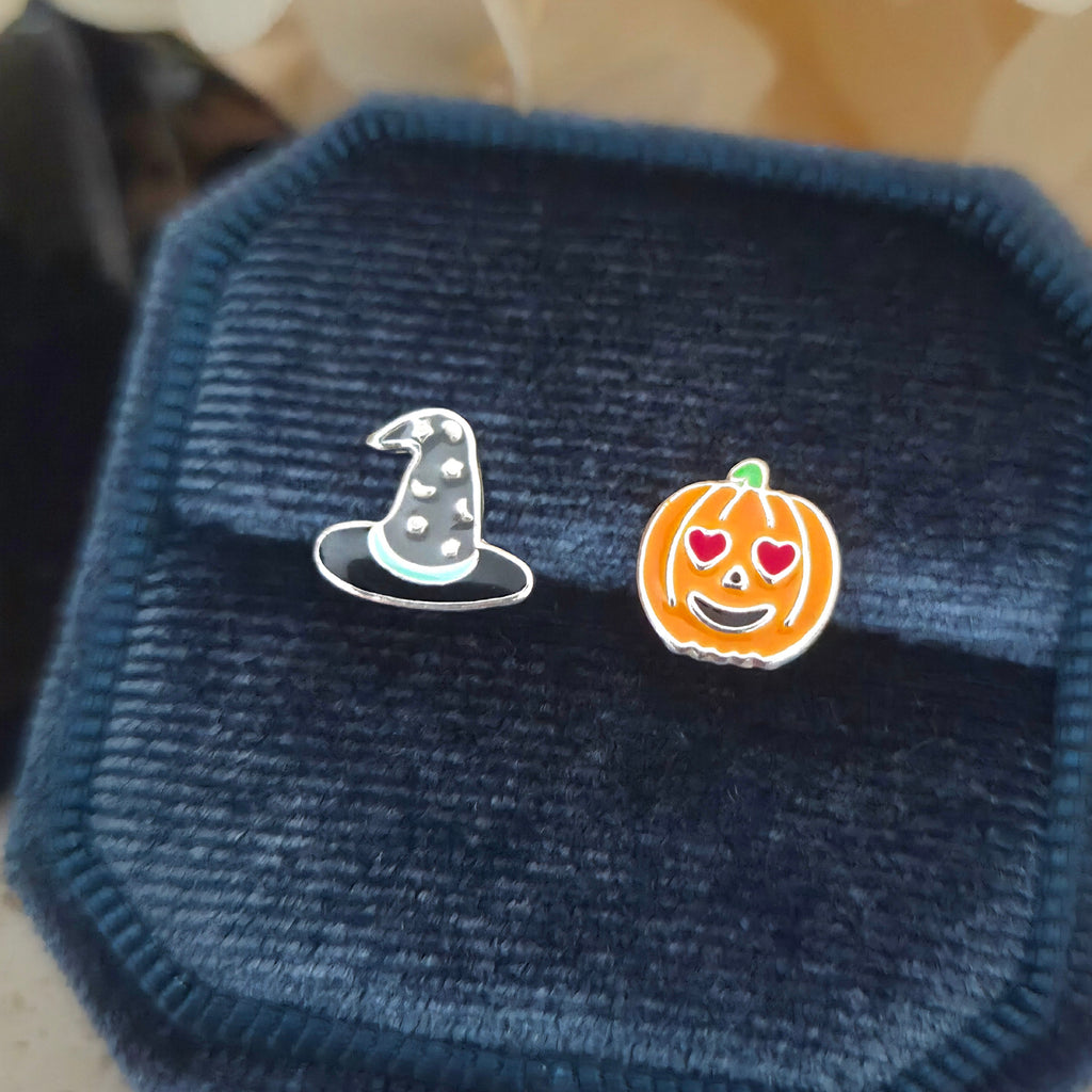 Fun and spooky, these mismatched earrings feature a black witch hat and an orange pumpkin with heart eyes. Crafted in solid 925 sterling silver with colorful enamel, they’re the perfect playful accessory to brighten your Halloween outfits.