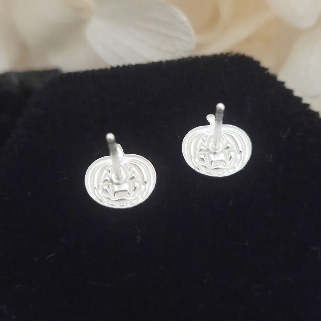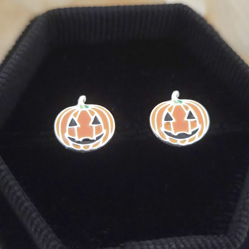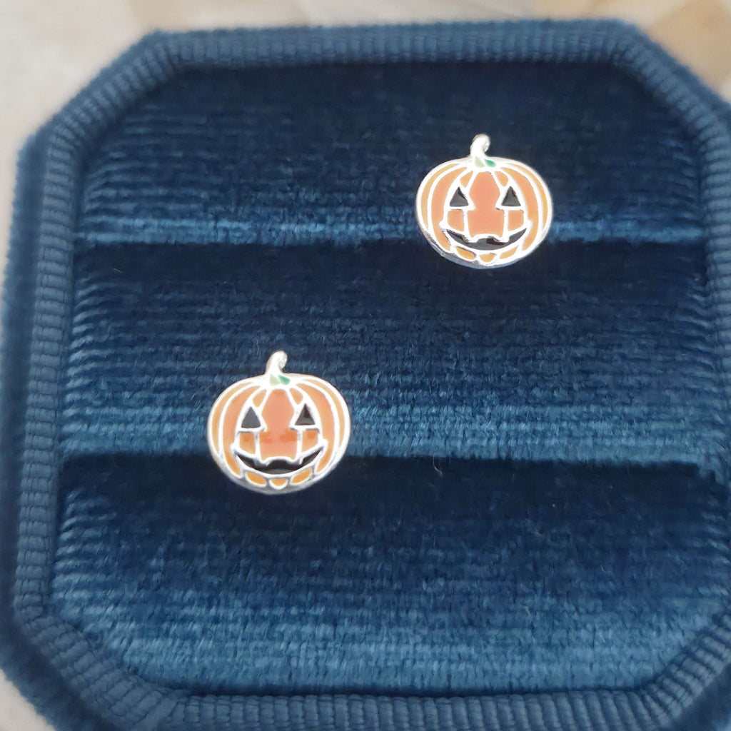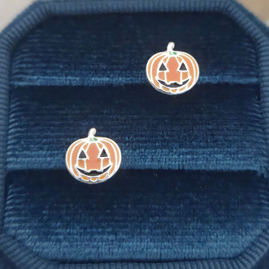 Orange ghost pumpkin stud earrings in solid 925 sterling silver, finished with bright enamel. Perfect Halloween jewelry to add a spooky yet playful touch to your look. A unique seasonal gift for pumpkin and autumn lovers.