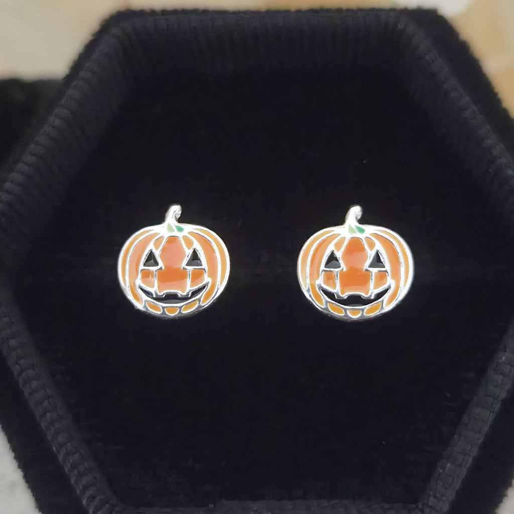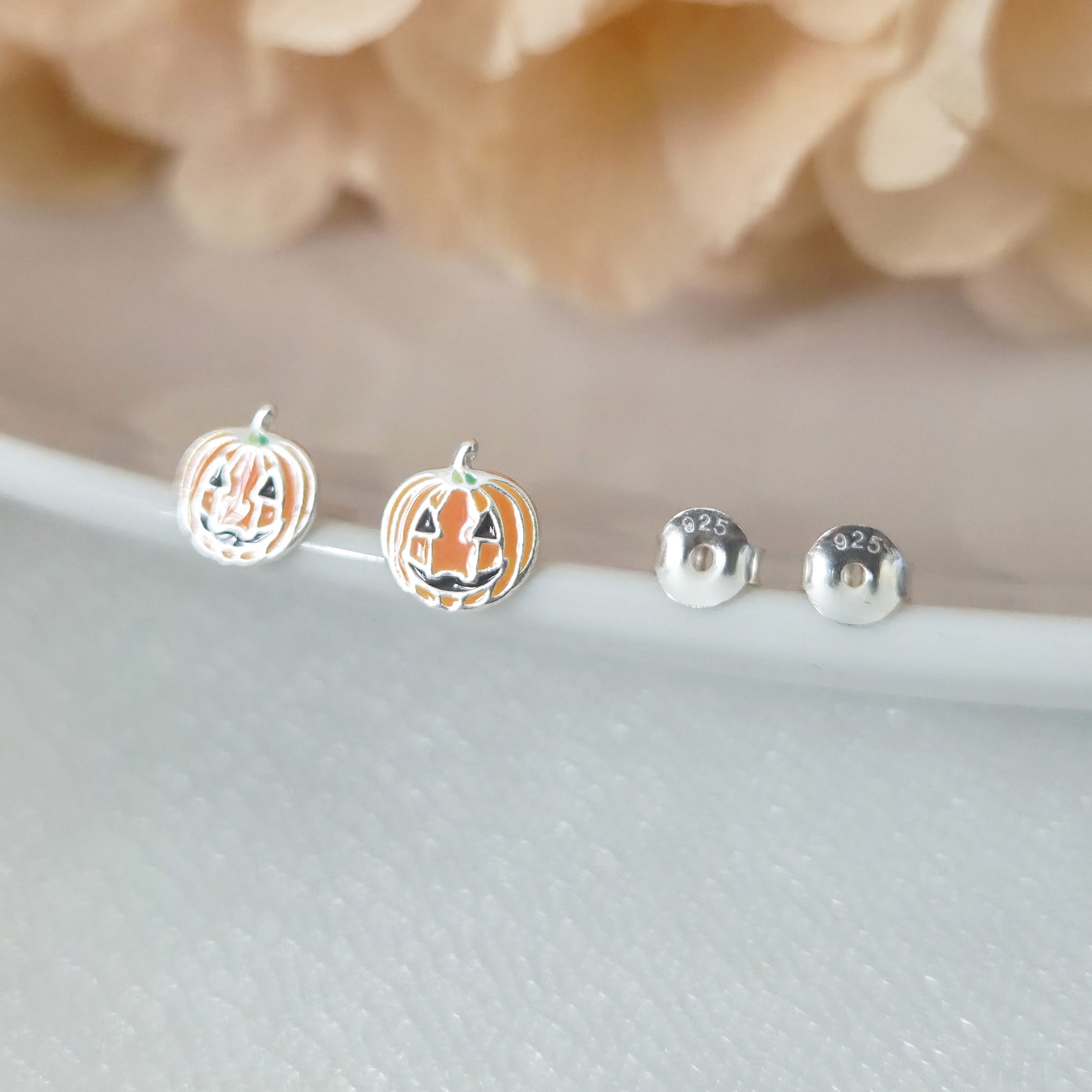 Orange Ghost Pumpkin Stud Earrings in 925 Sterling Silver – Solid Silver Halloween Studs with Enamel