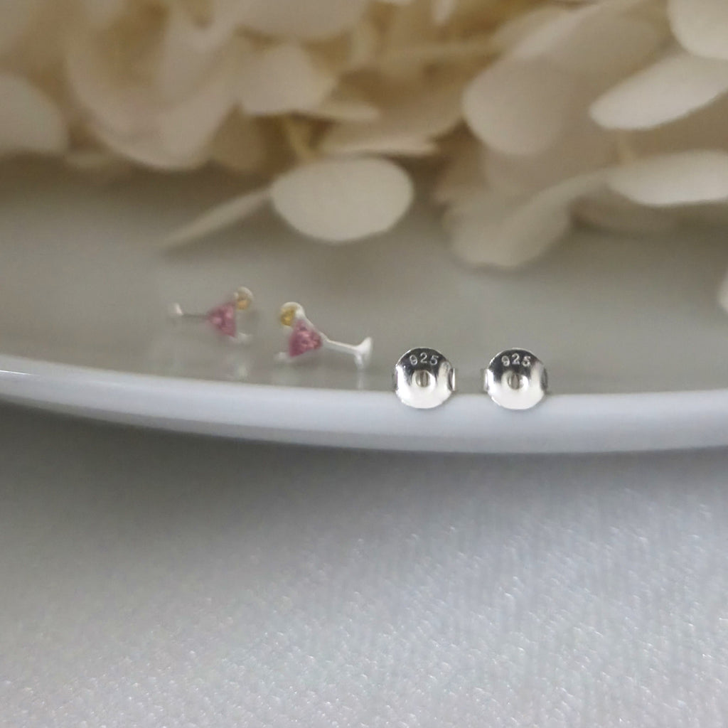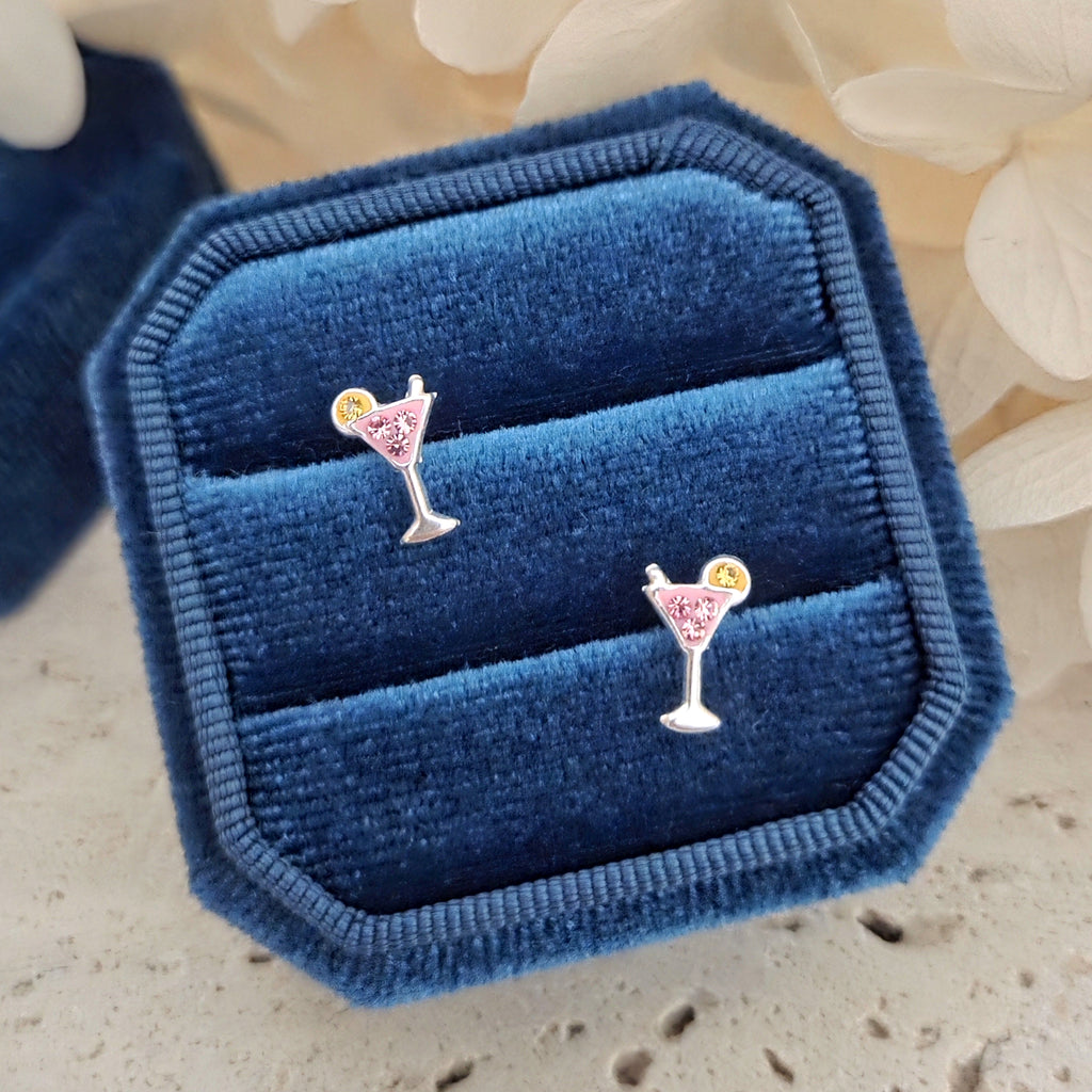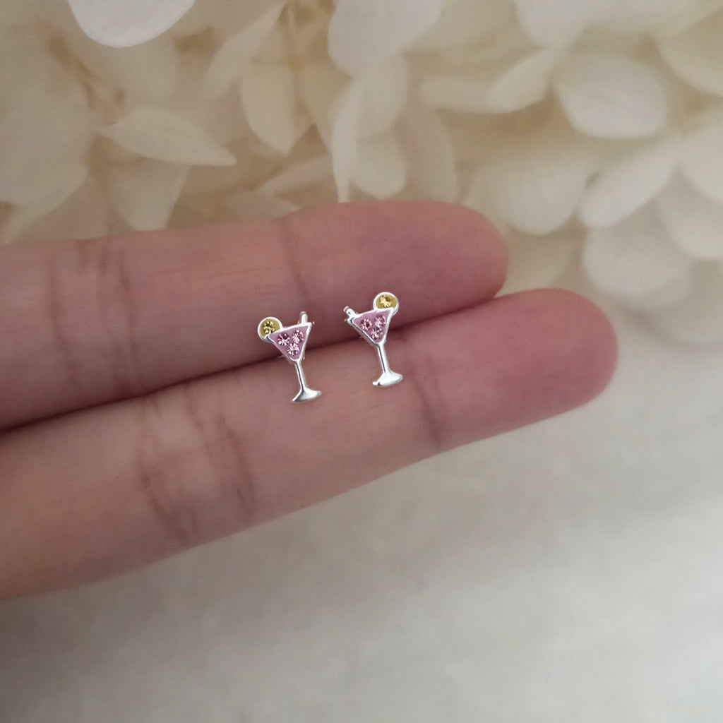 Pink Cocktail Glass Stud Earrings in 925 Sterling Silver – Summer Beach Drink Studs with Pink Enamel & Crystals