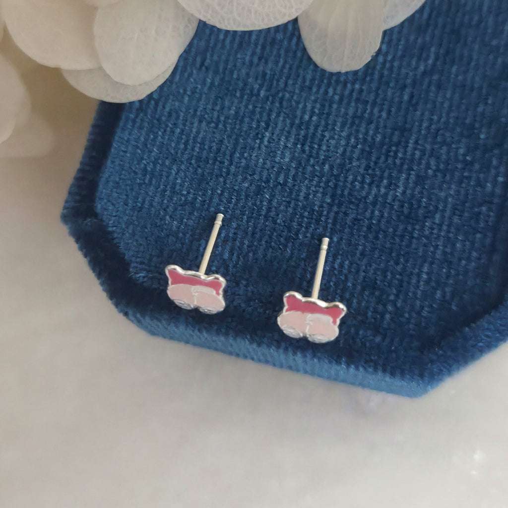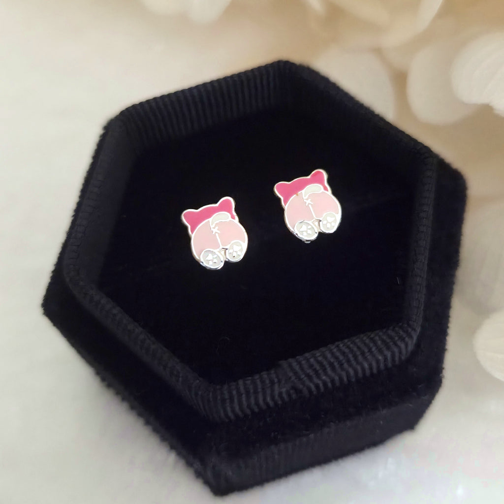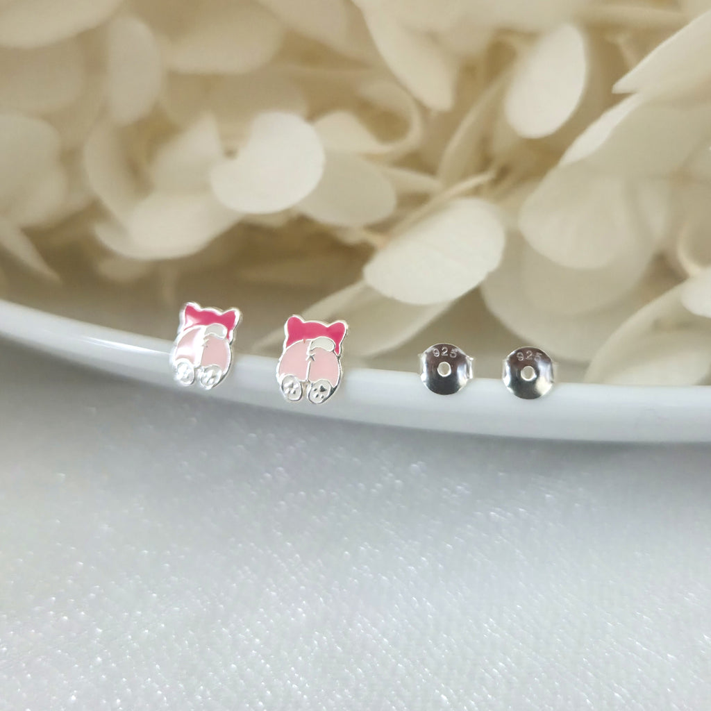 Charming pink dog stud earrings in solid 925 sterling silver, detailed with smooth enamel for a playful look. Perfect for pet lovers or as a sweet gift.