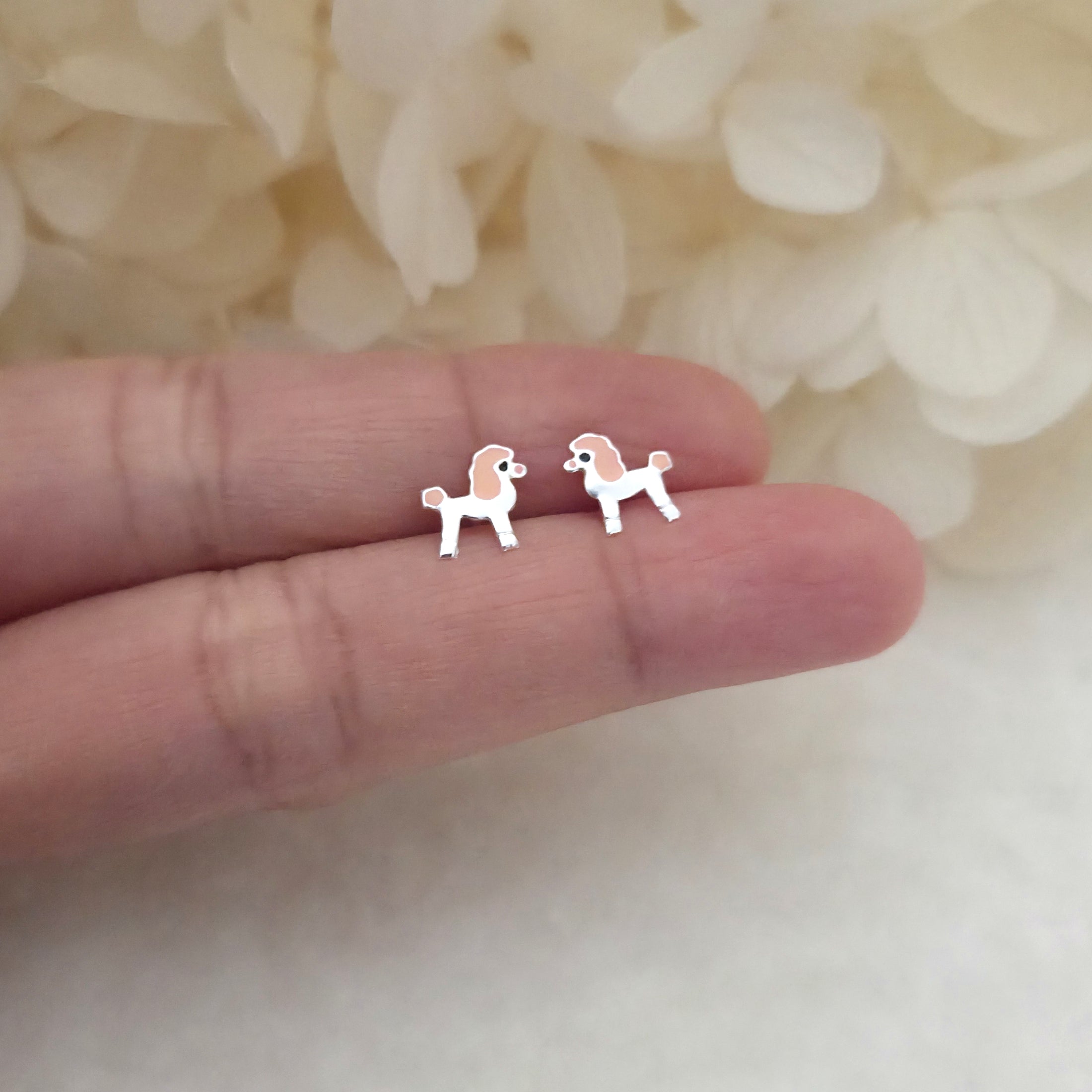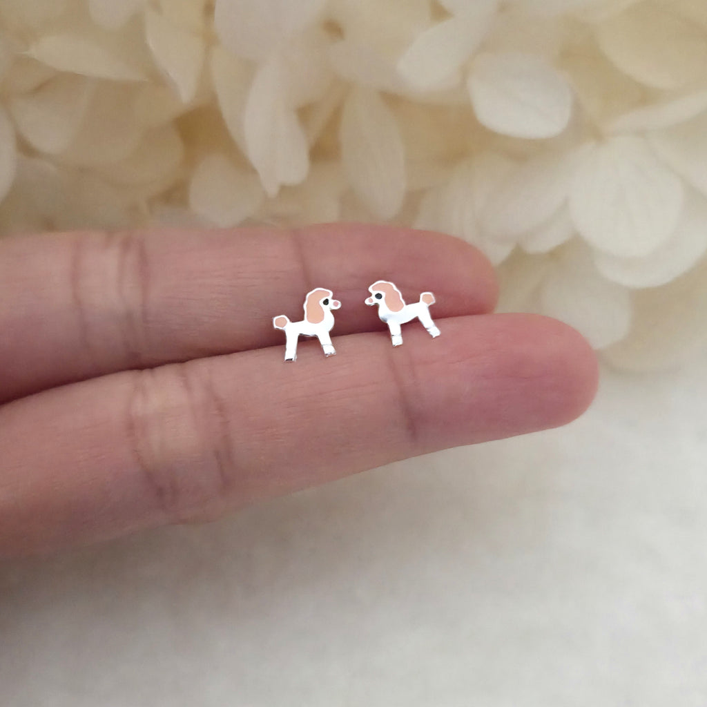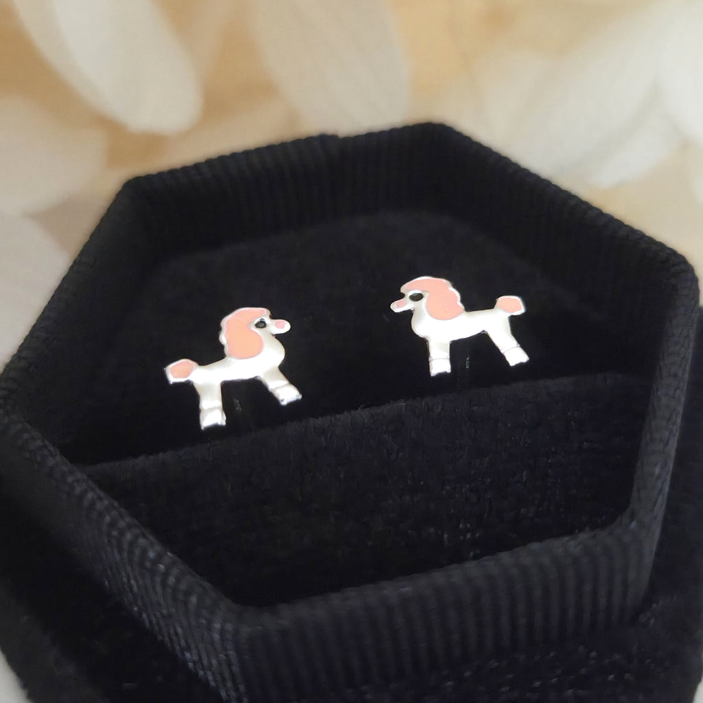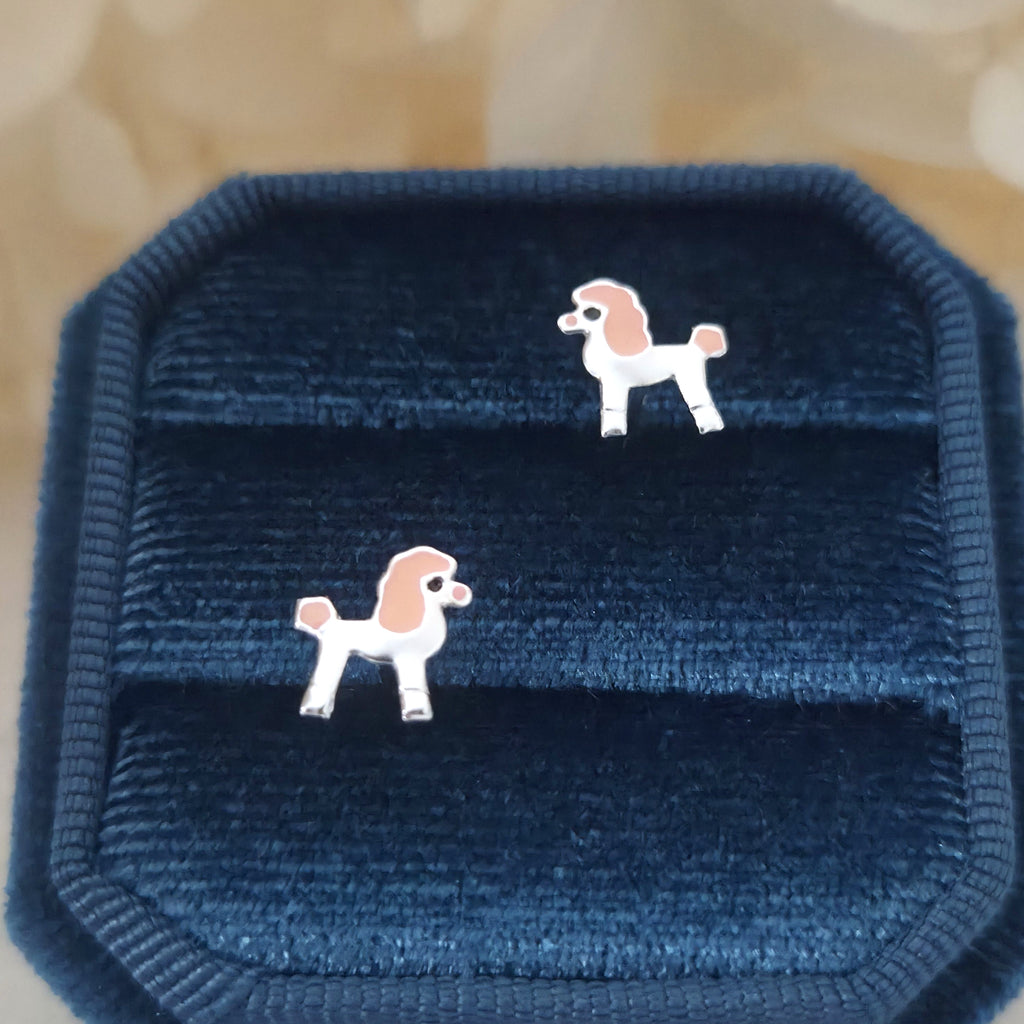 Charming poodle dog stud earrings in solid 925 sterling silver, detailed with pink enamel accents. A playful and elegant gift for dog lovers.