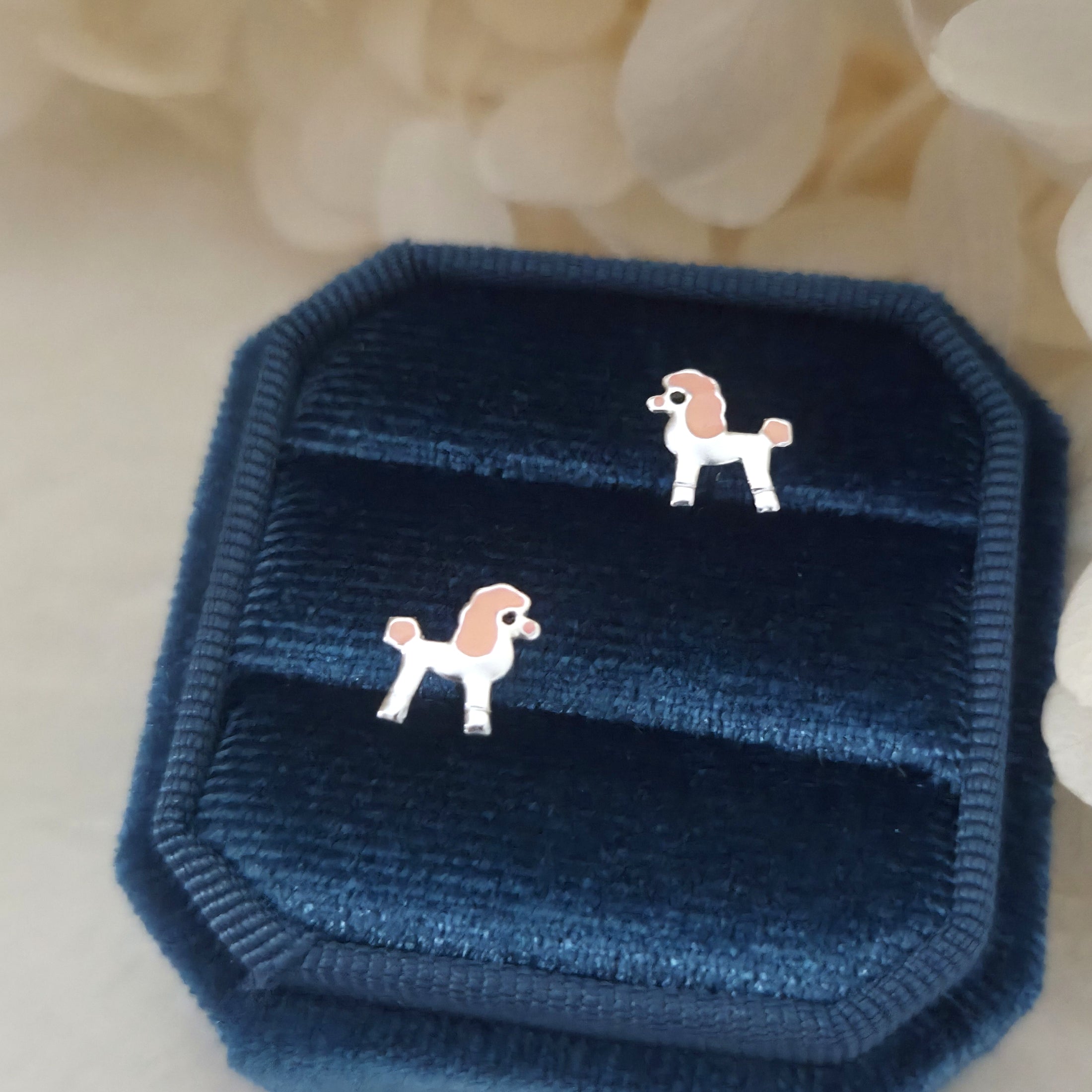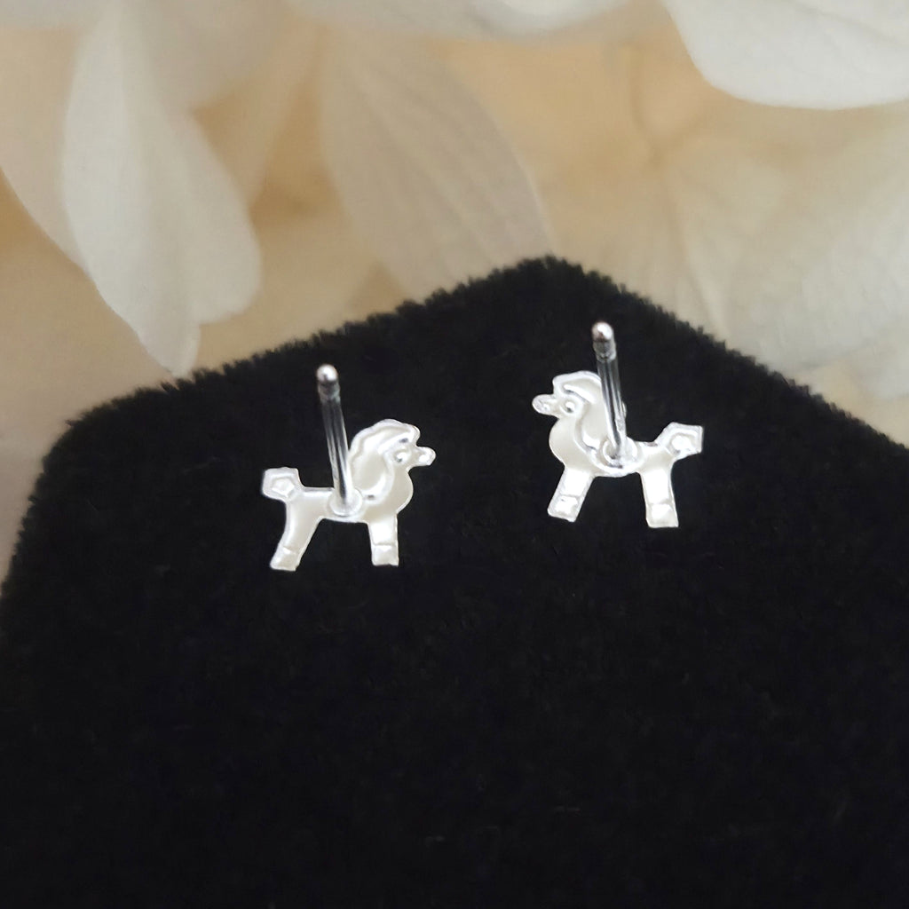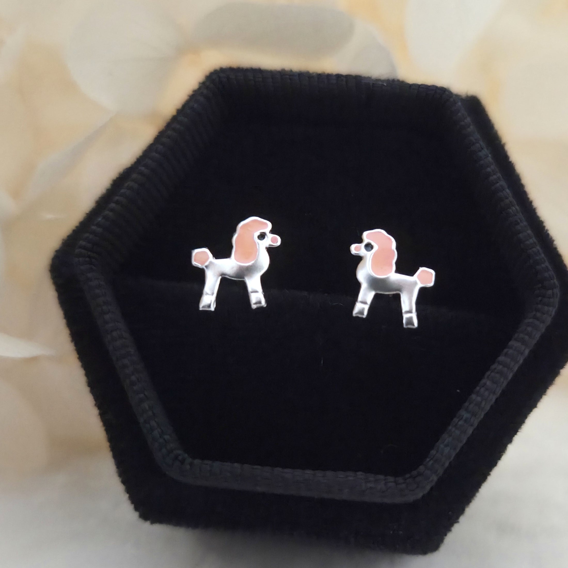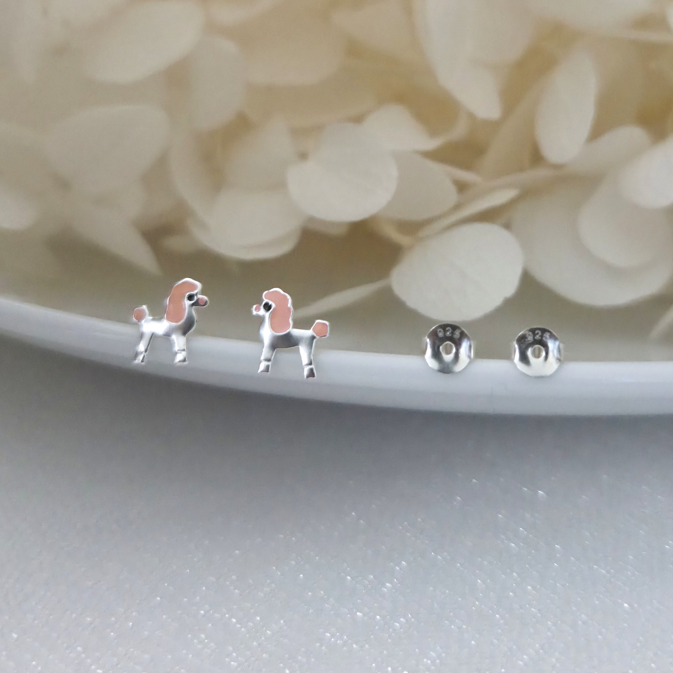 Charming poodle dog stud earrings in solid 925 sterling silver, detailed with pink enamel accents. A playful and elegant gift for dog lovers.