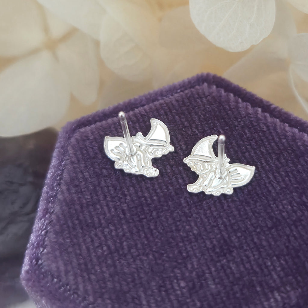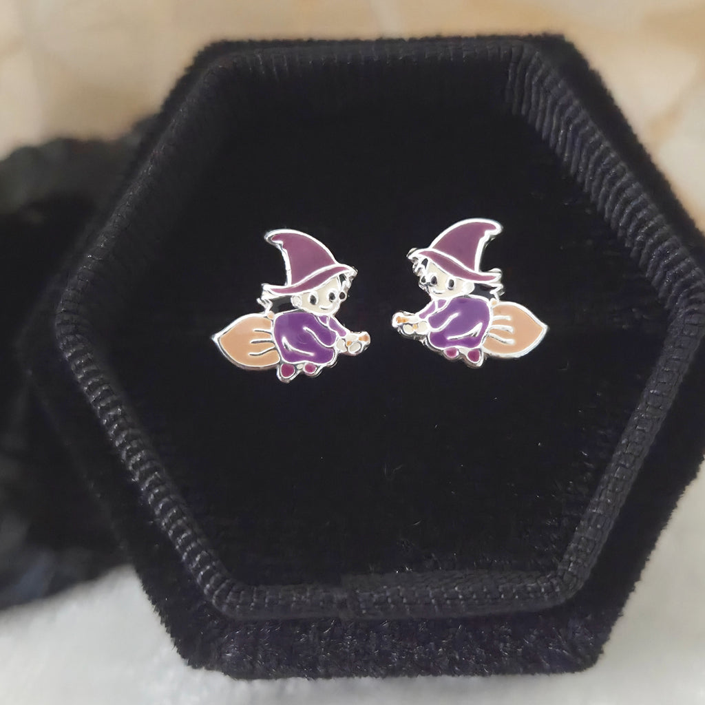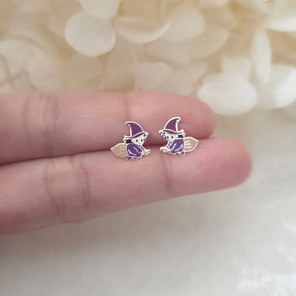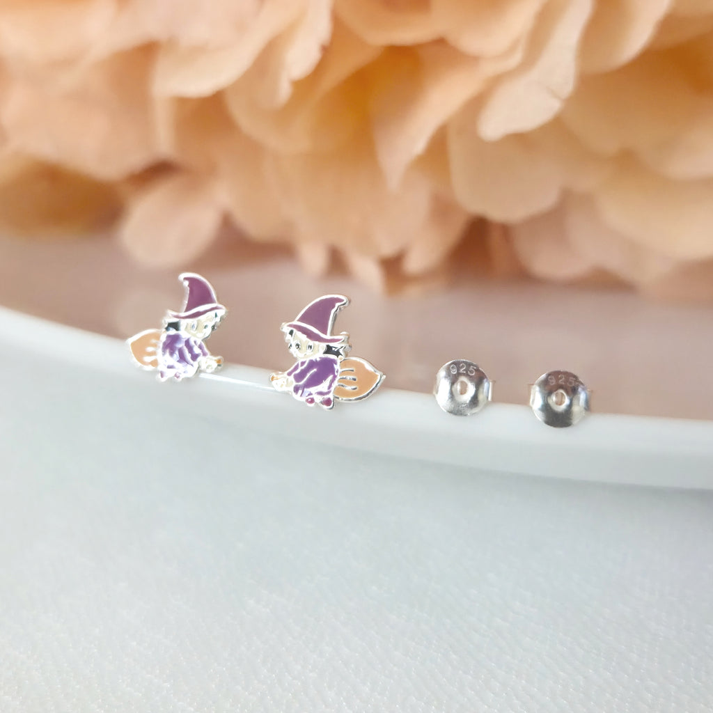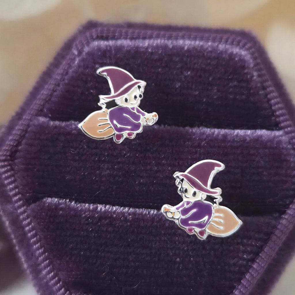 Purple Witch on Broom Stud Earrings in 925 Sterling Silver – Solid Silver Halloween Studs