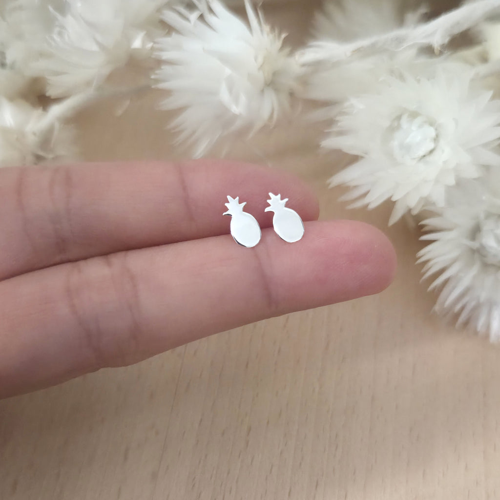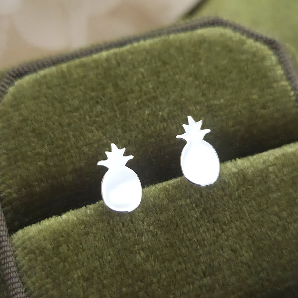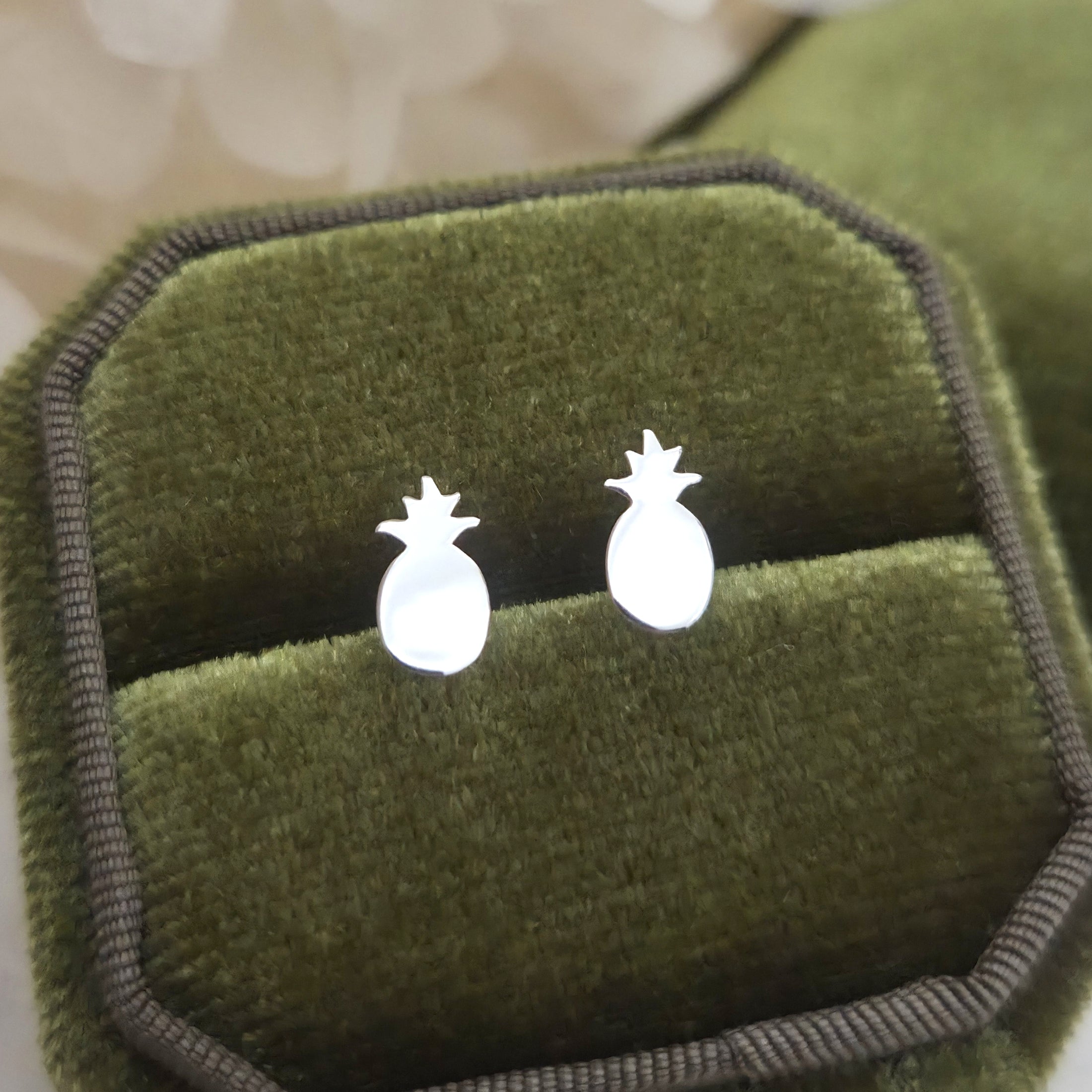 These small 925 sterling silver pineapple stud earrings feature a sleek, minimalist design. A perfect tropical gift for fruit lovers or summer beach jewelry fans.
