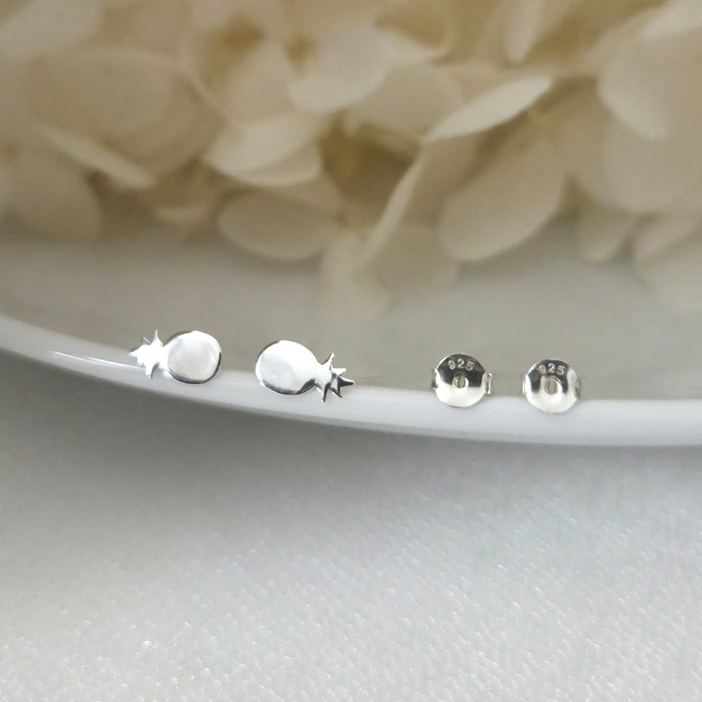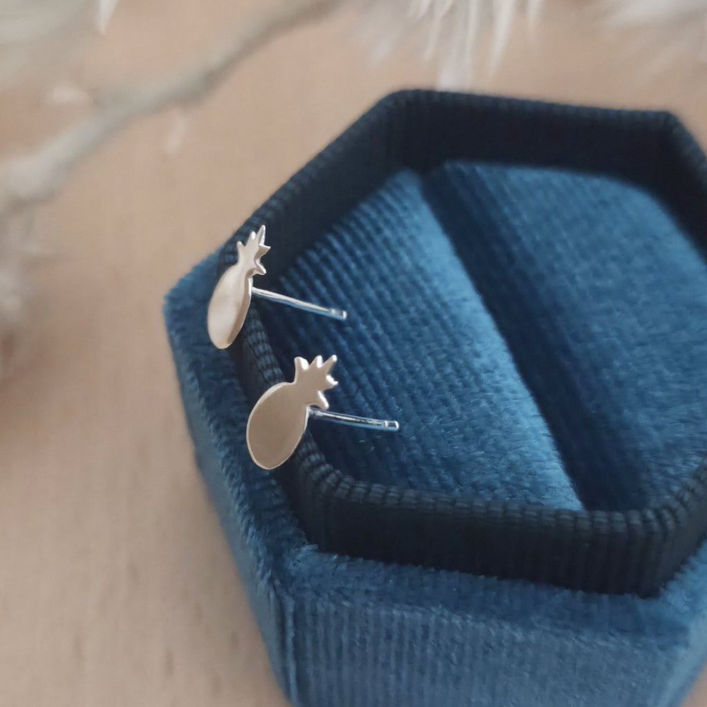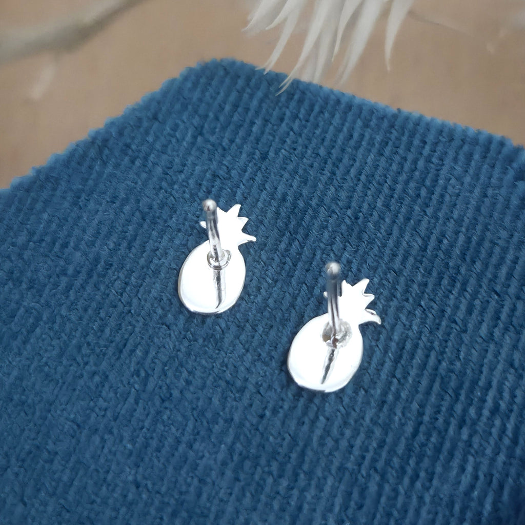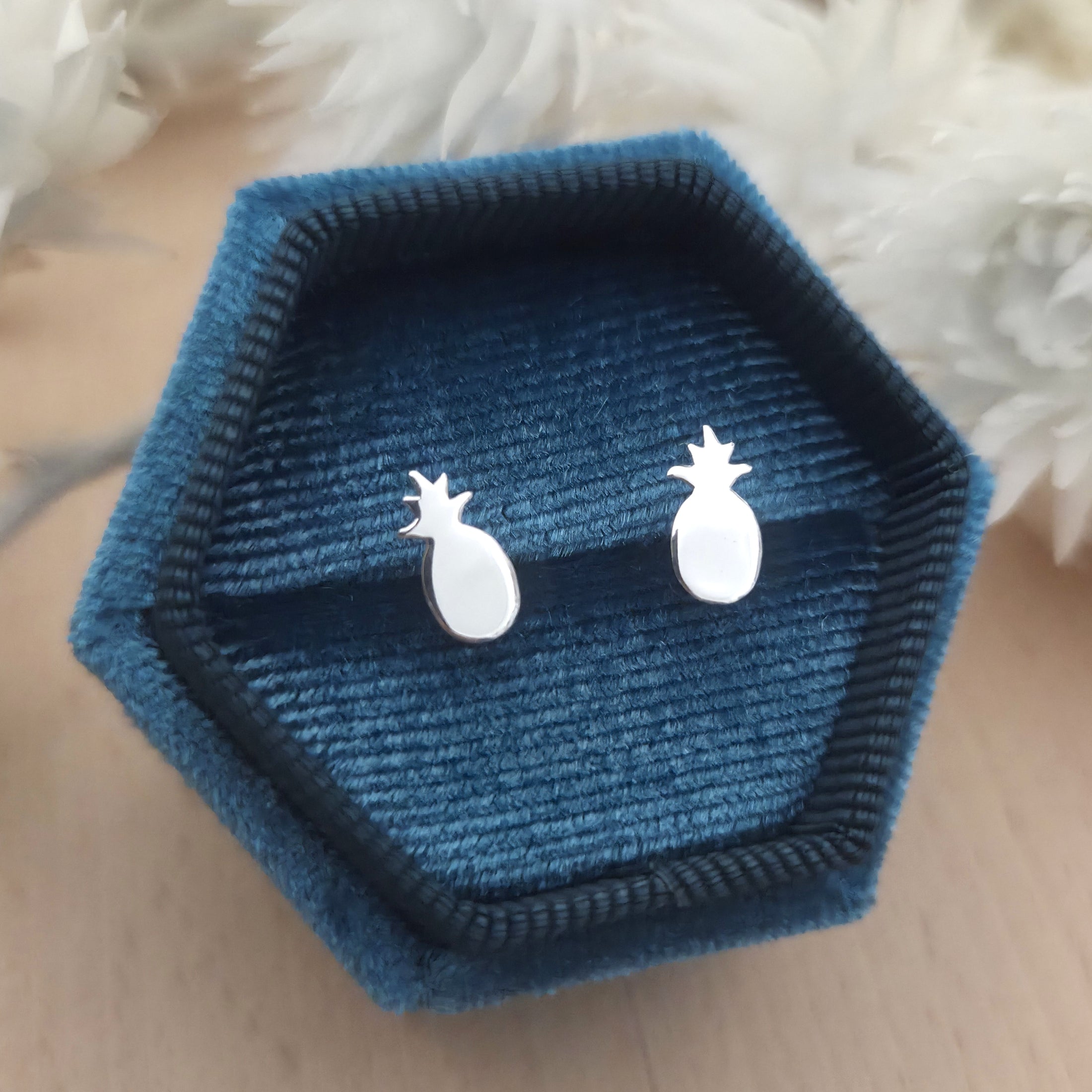These small 925 sterling silver pineapple stud earrings feature a sleek, minimalist design. A perfect tropical gift for fruit lovers or summer beach jewelry fans.