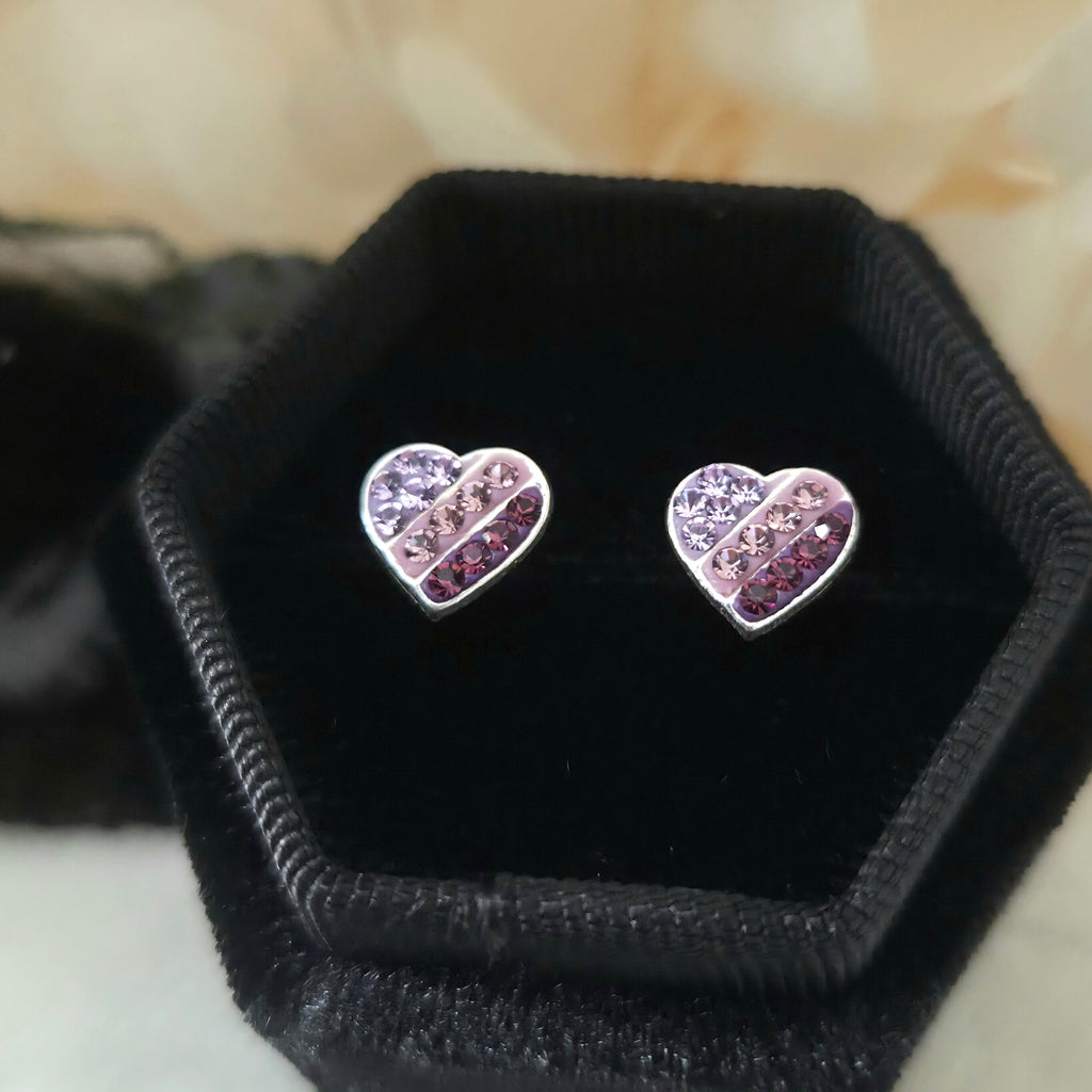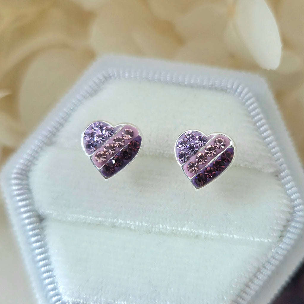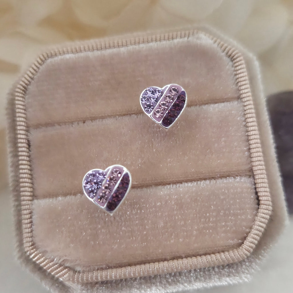 Striped Purple Gradient Heart Stud Earrings in 925 Sterling Silver – Solid Silver Valentine’s Love Studs with Crystals