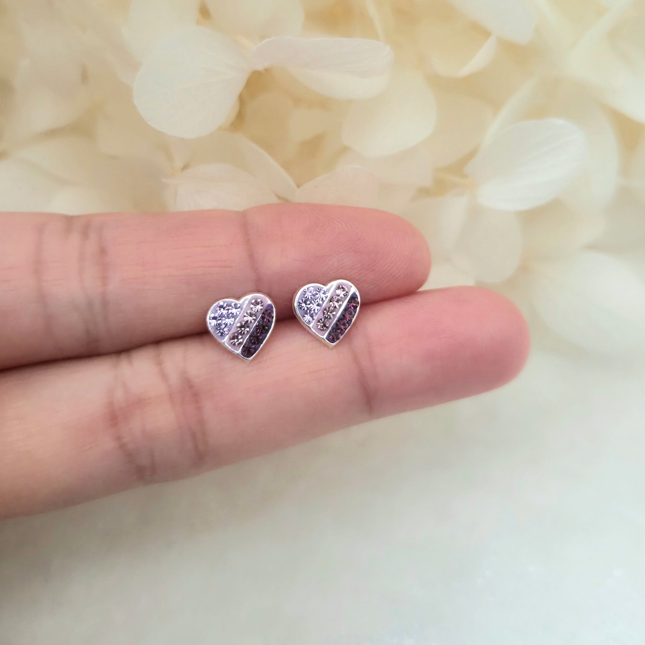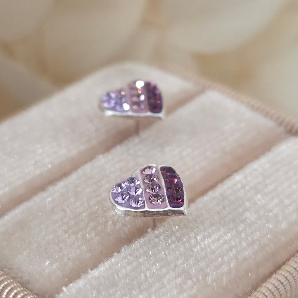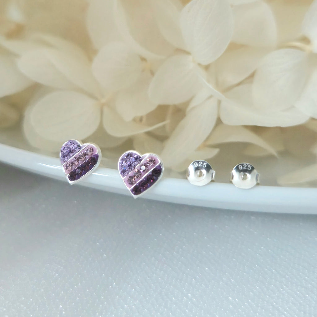 Striped Purple Gradient Heart Stud Earrings in 925 Sterling Silver – Solid Silver Valentine’s Love Studs with Crystals