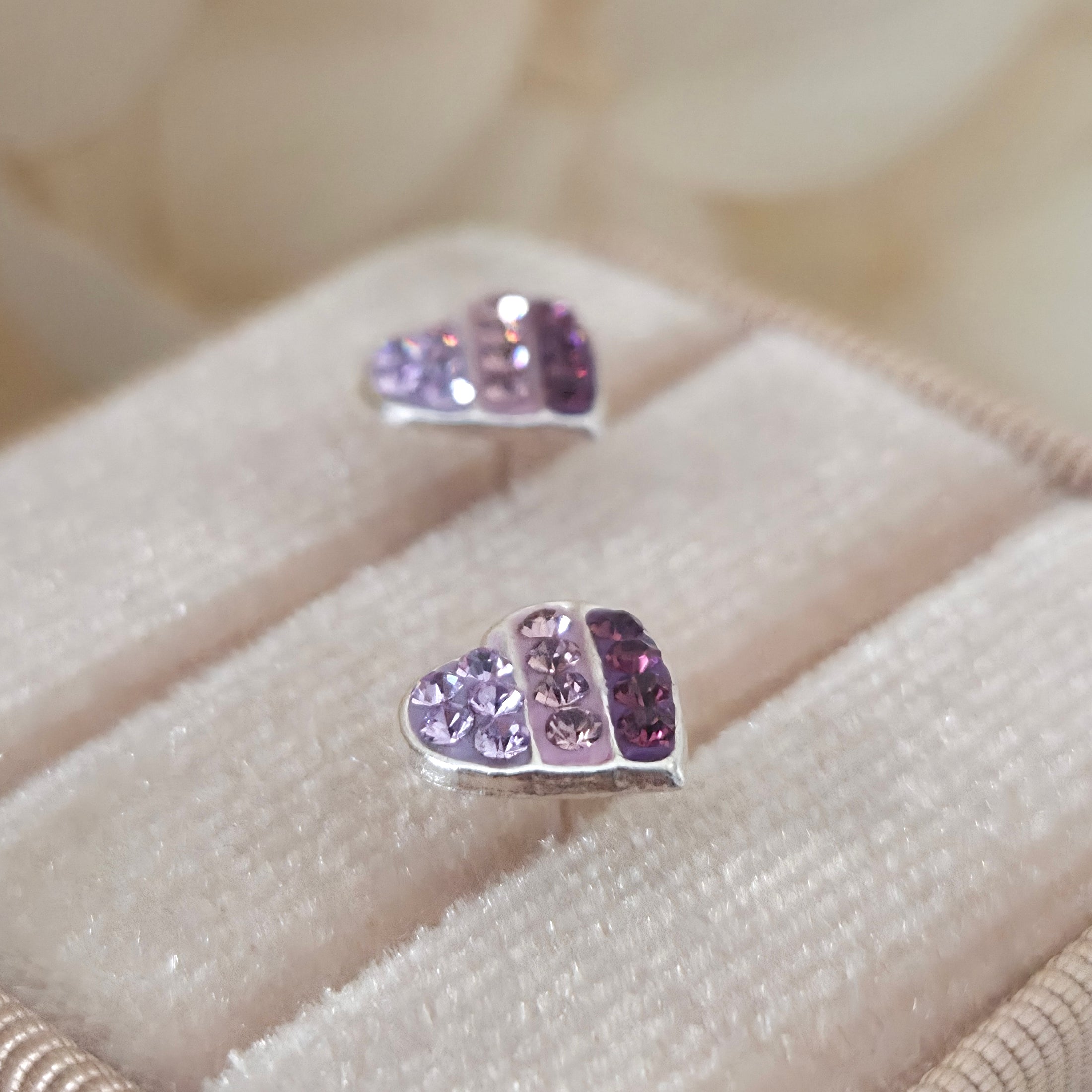 Elegant and sparkling, these striped purple gradient heart stud earrings are crafted in solid 925 sterling silver. Featuring rows of crystals in soft lilac, amethyst, and deep plum tones, they create a chic ombre effect that catches the light beautifully. A perfect accessory for Valentine’s Day, anniversaries, or simply to add a romantic touch to your everyday style.
