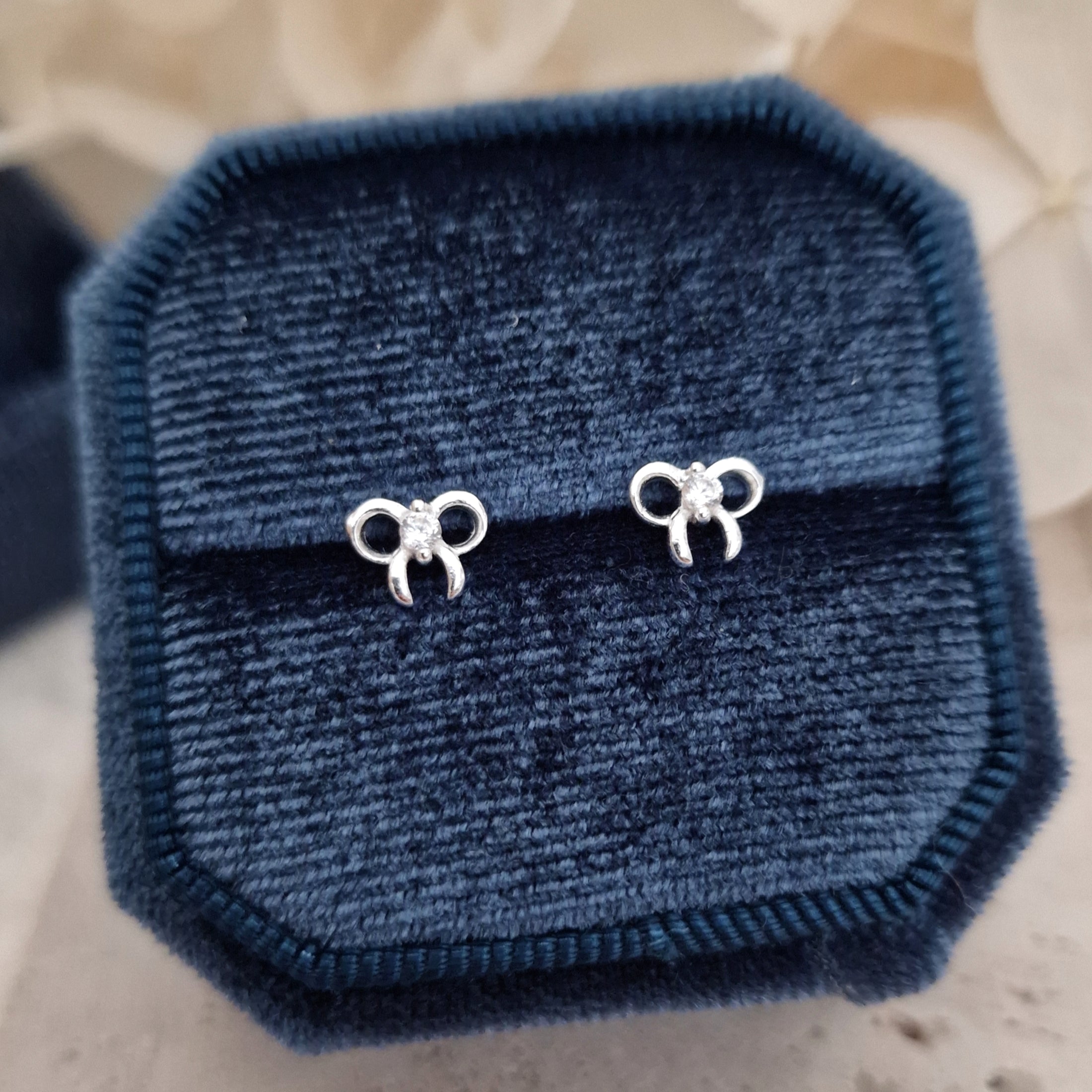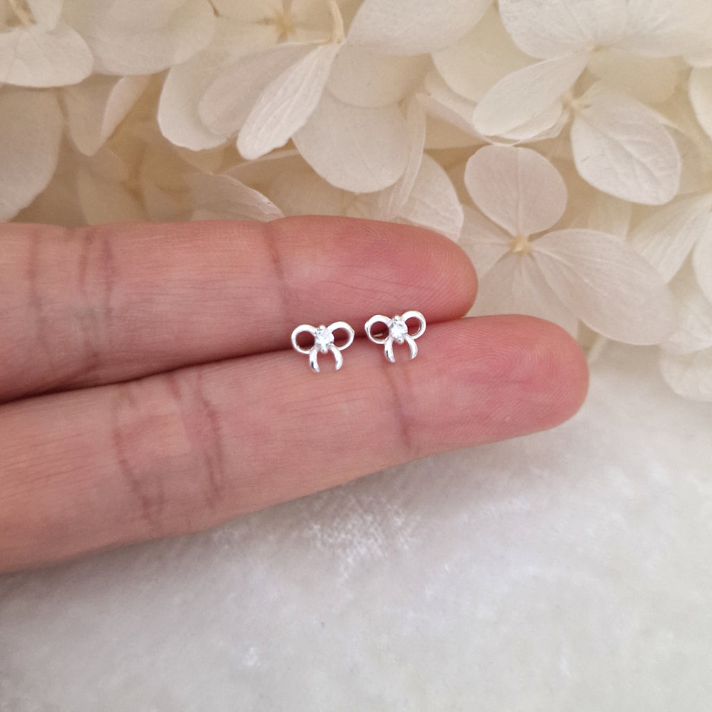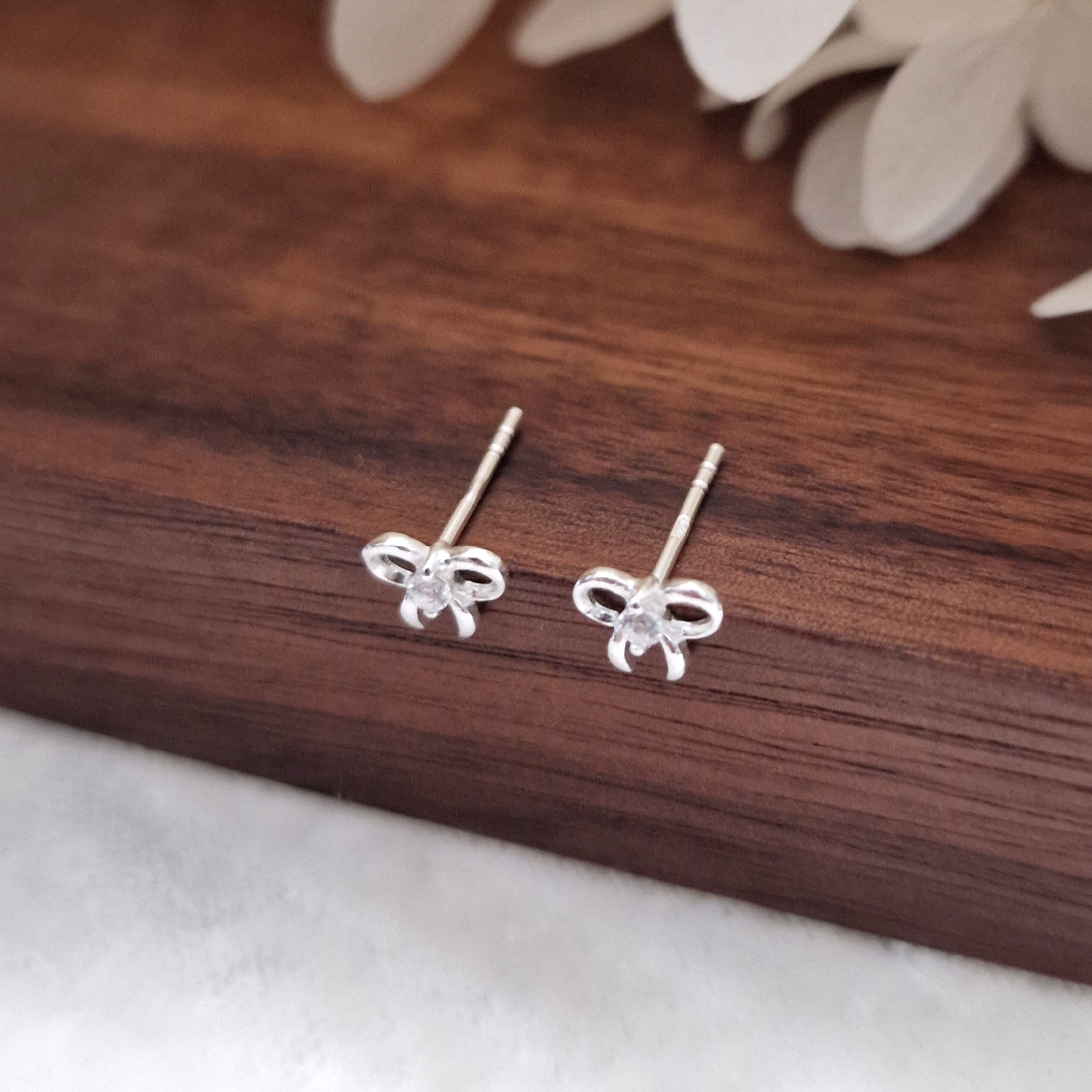 Tiny 925 Sterling Silver Bow Stud Earrings – Ribbon Studs in Solid Silver with White CZ Cubic Zirconia