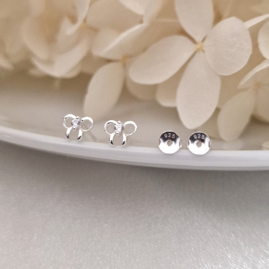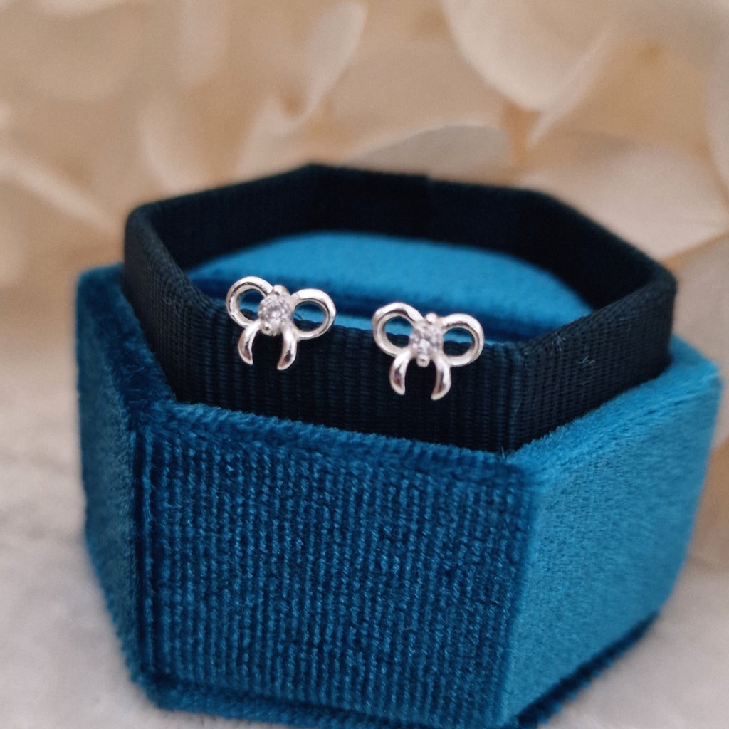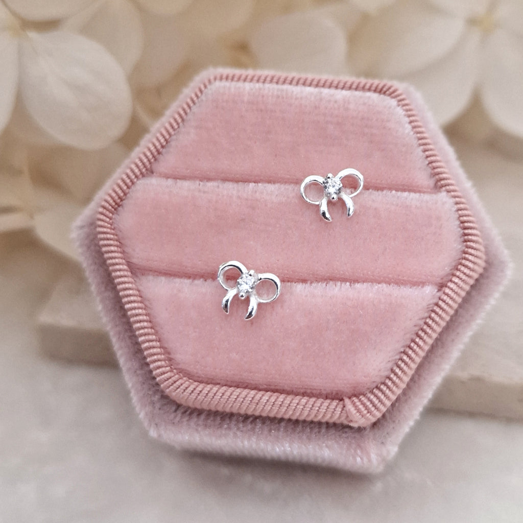Tiny 925 Sterling Silver Bow Stud Earrings – Ribbon Studs in Solid Silver with White CZ Cubic Zirconia