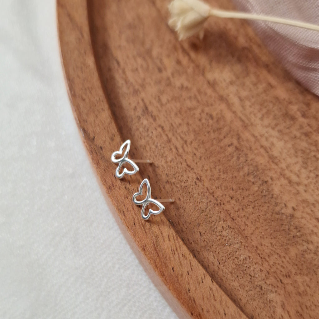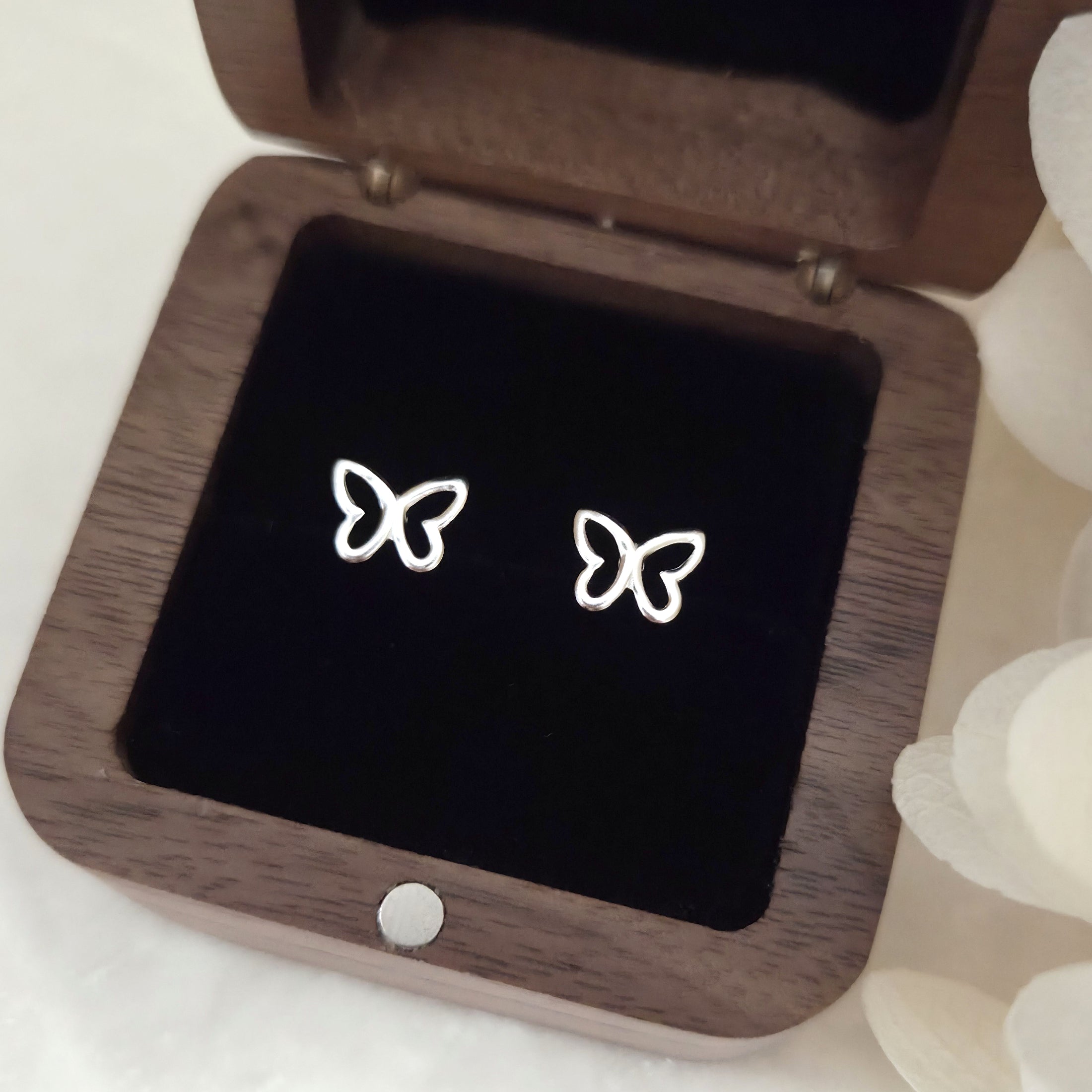 Delicate and airy, these tiny butterfly stud earrings are crafted in solid 925 sterling silver with a minimalist openwork design. Perfect for everyday wear or as a subtle nature-inspired gift. Lightweight and comfortable, they add a soft, graceful touch to any outfit.