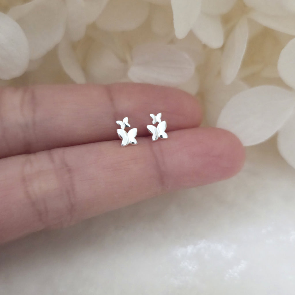 Tiny 925 Sterling Silver Double Butterfly Stud Earrings – Minimalist Solid Silver Studs – Cute Gift for Her – Dainty Nature Jewelry