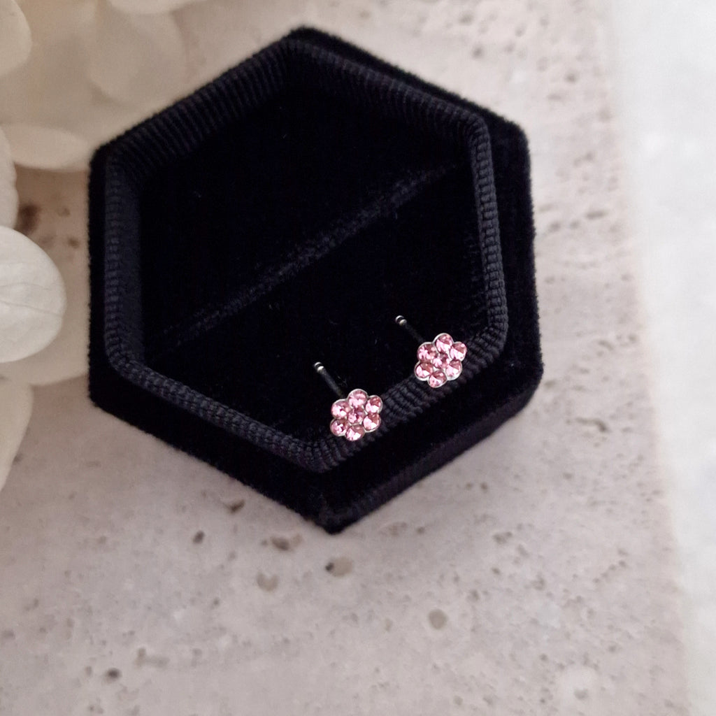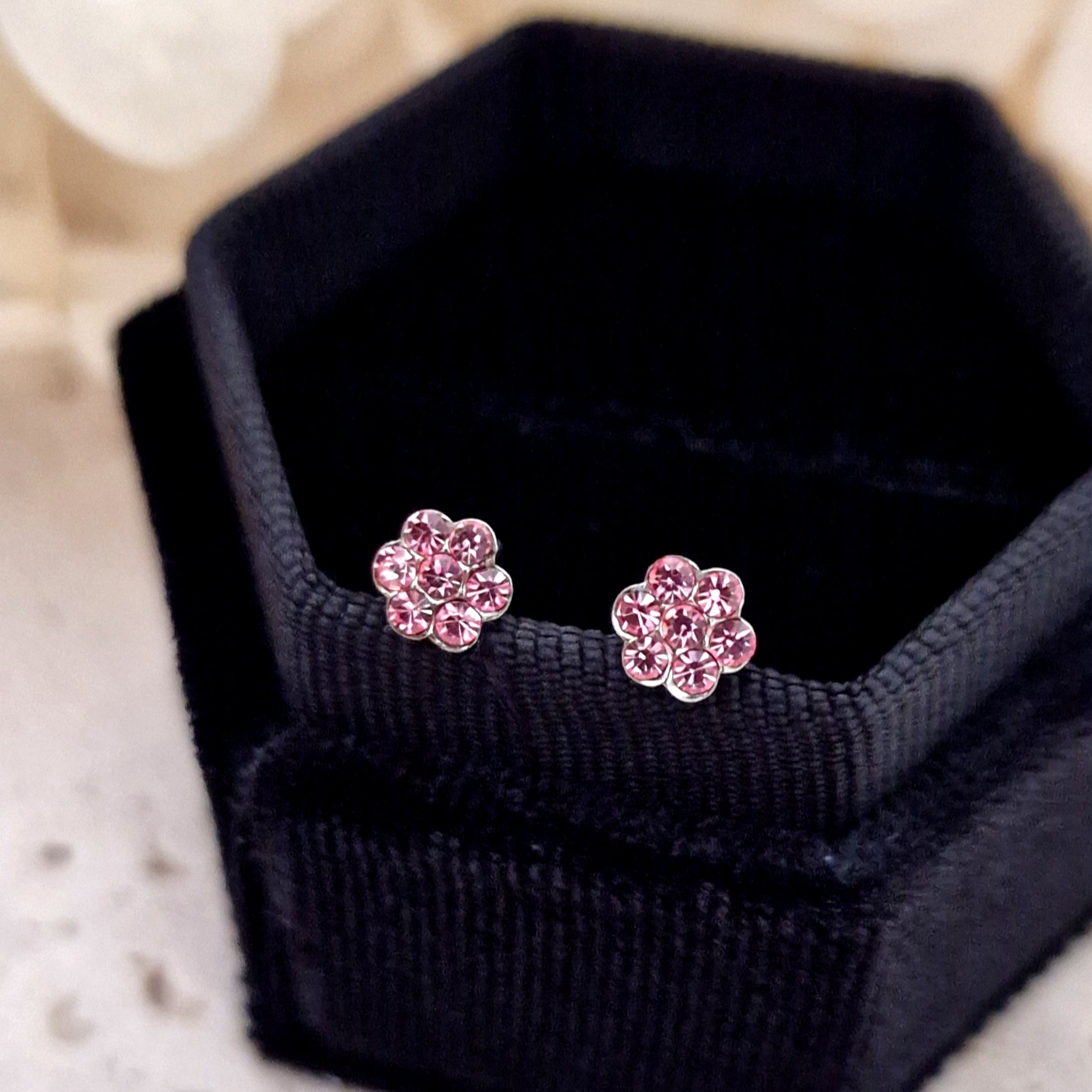 Delicate and feminine, these tiny flower stud earrings are crafted from solid 925 sterling silver and finished with a sleek rhodium layer for lasting shine. Each petal is adorned with light rose pink crystals, creating a soft and elegant sparkle. A perfect everyday accessory or a sweet gift for someone special.