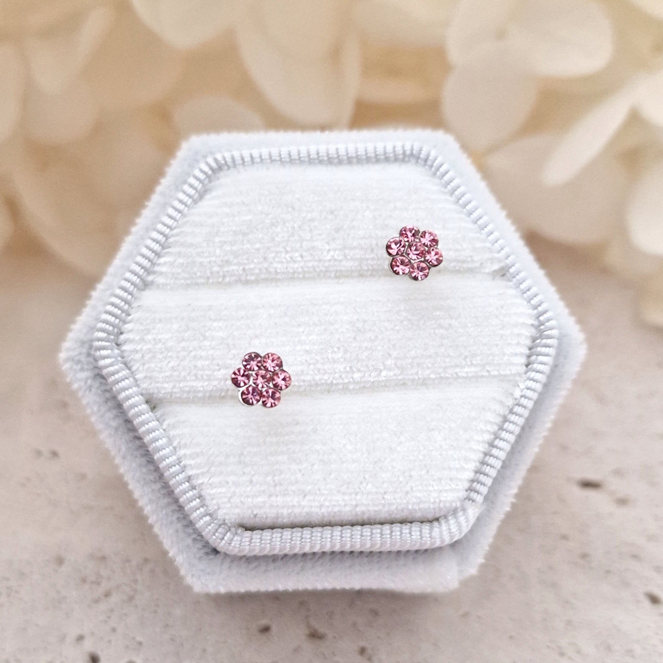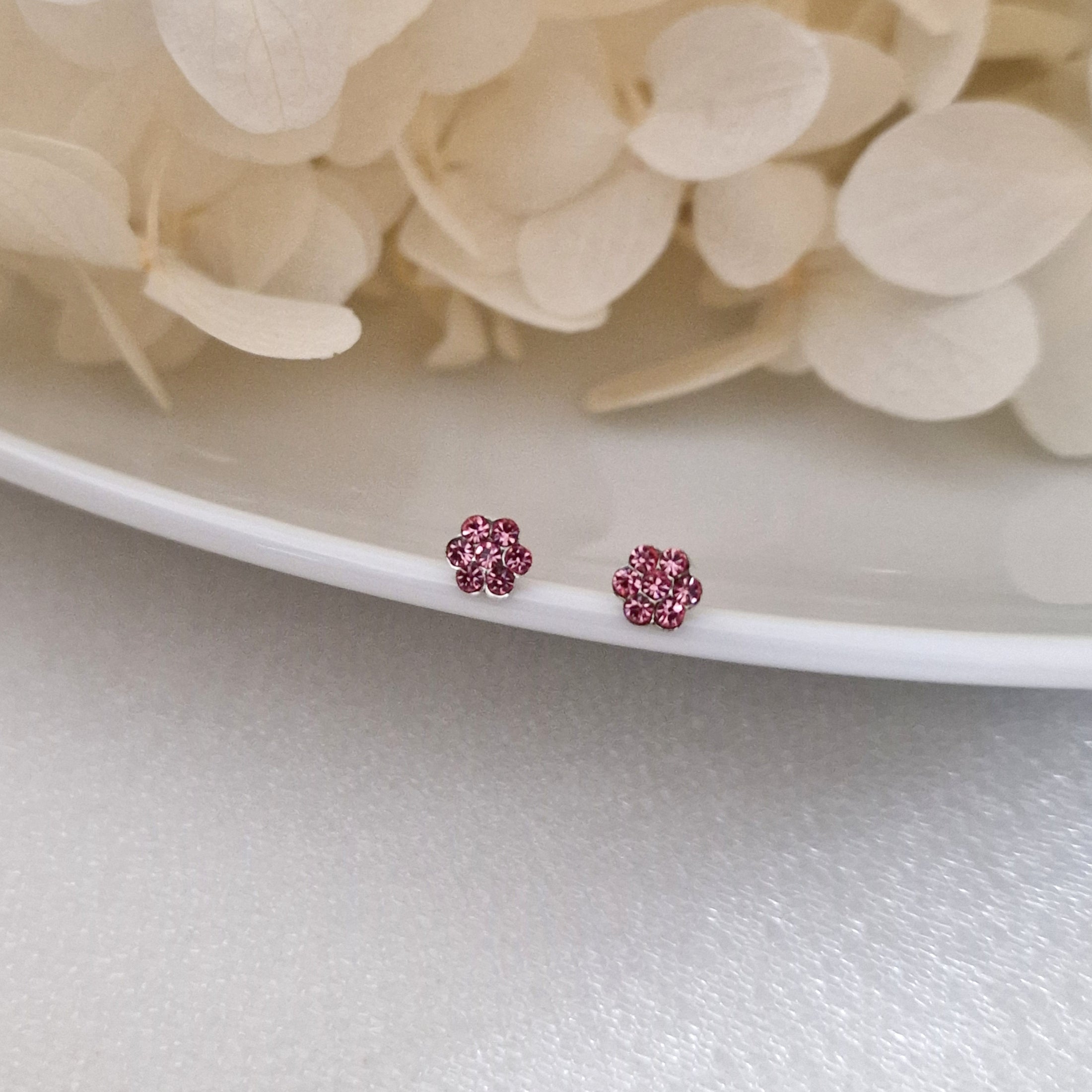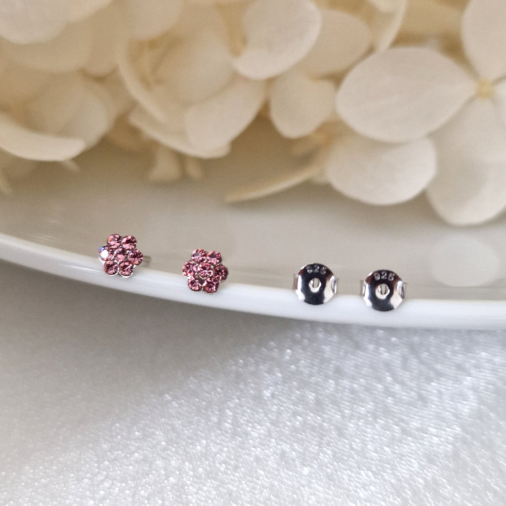 Tiny 925 Sterling Silver Flower Stud Earrings – Flower Studs with Light Rose Pink Crystals – Cute Gift for Her