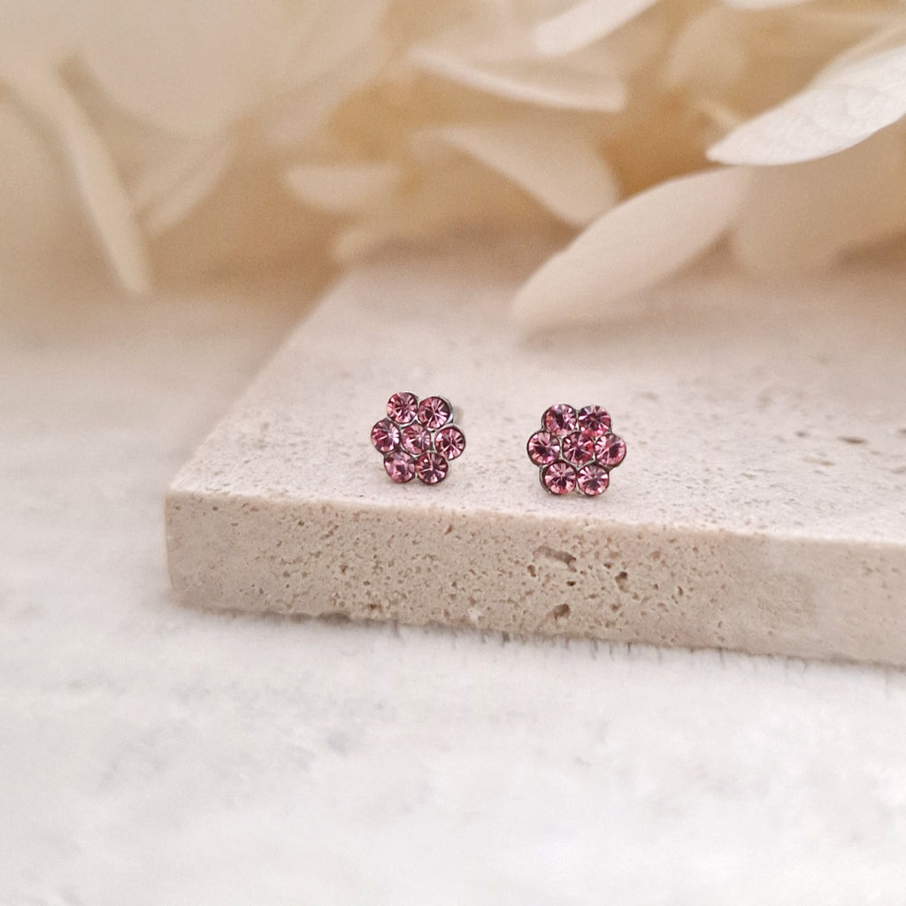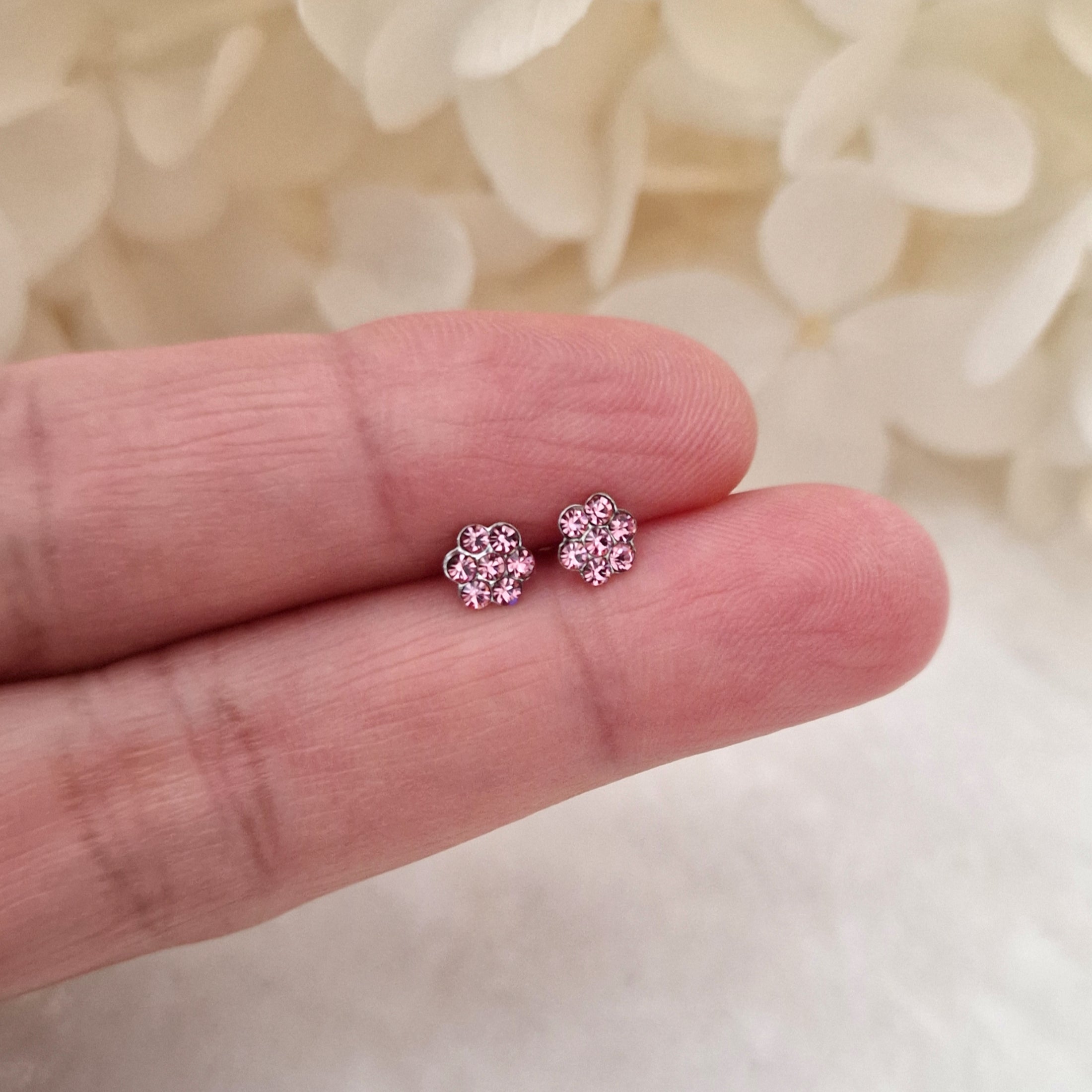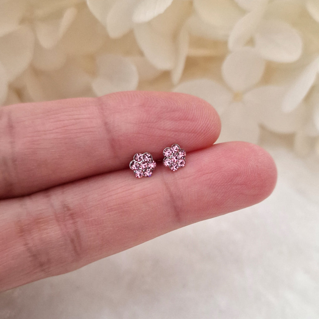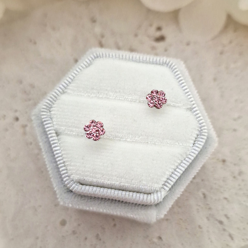 Tiny 925 Sterling Silver Flower Stud Earrings – Flower Studs with Light Rose Pink Crystals – Cute Gift for Her