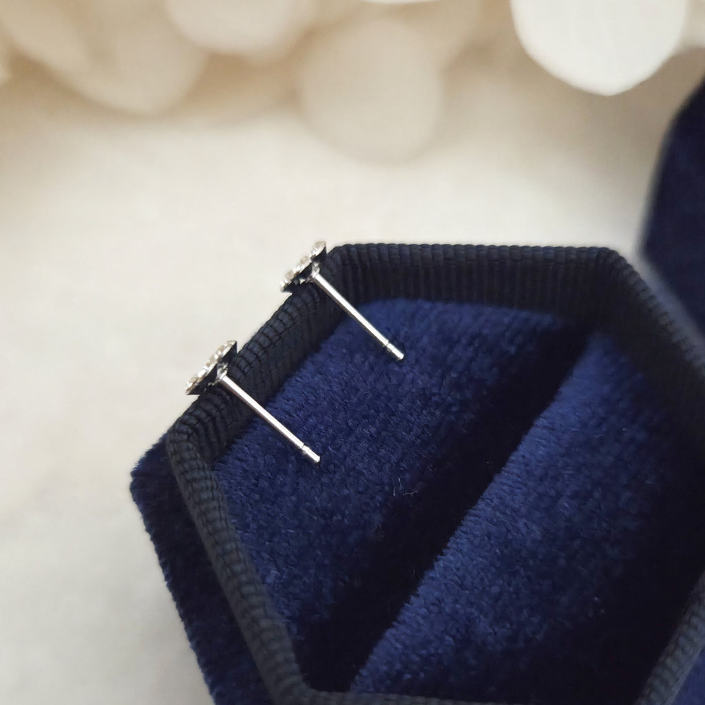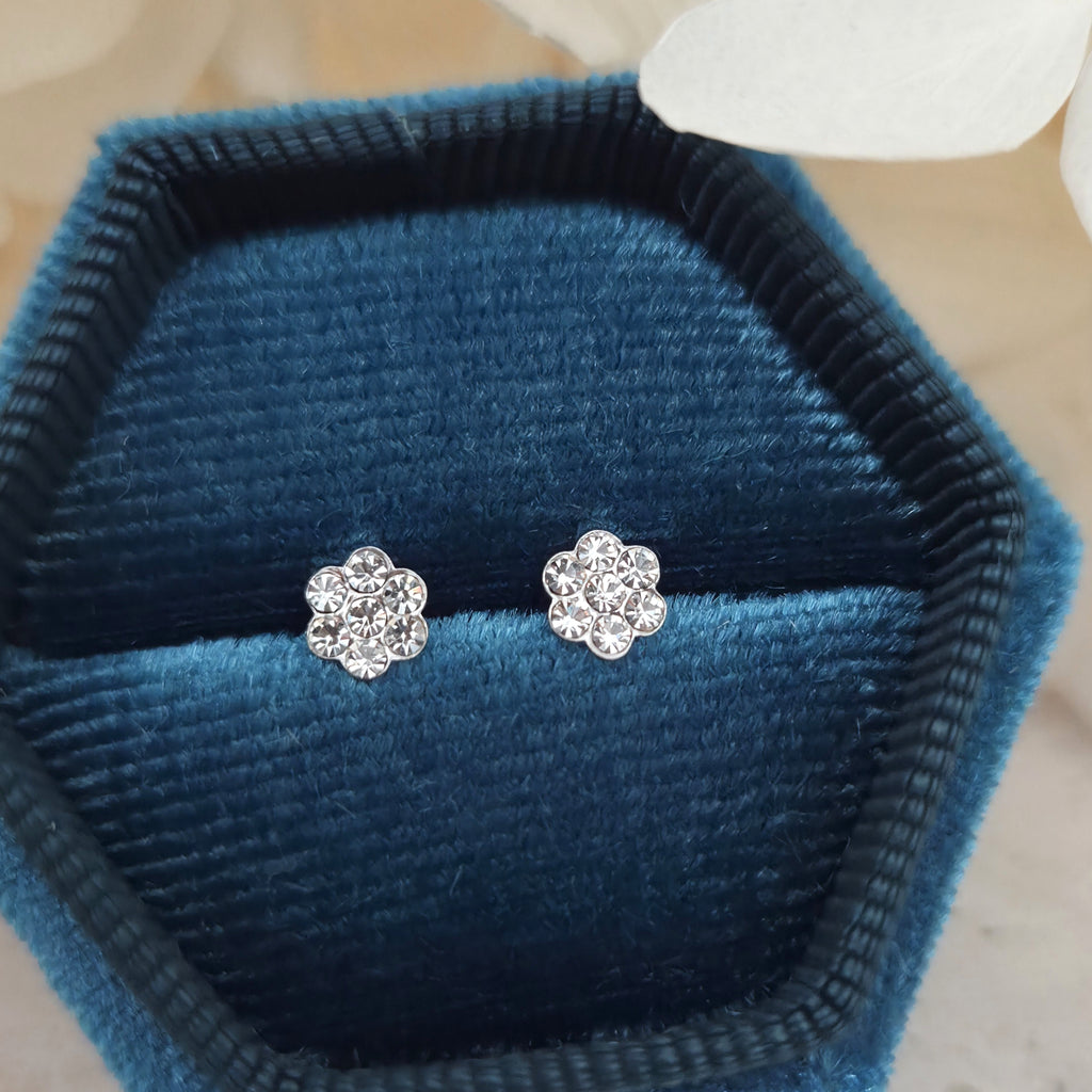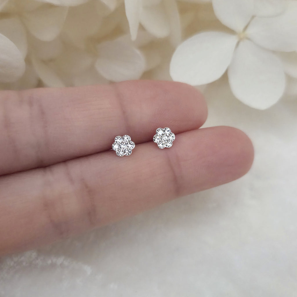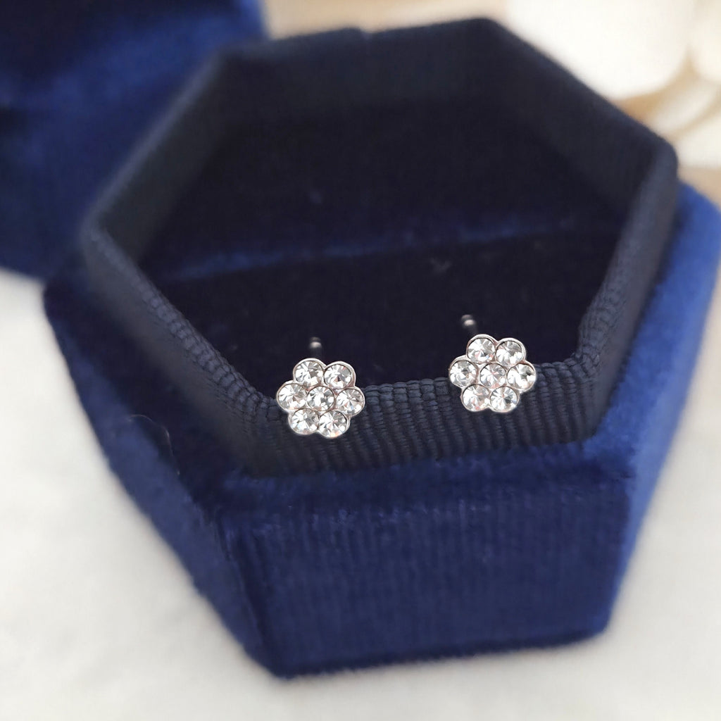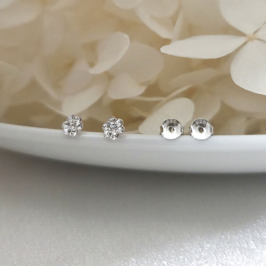 Tiny 925 Sterling Silver Flower Stud Earrings – Flower Studs with White Crystals – Cute Gift for Her
