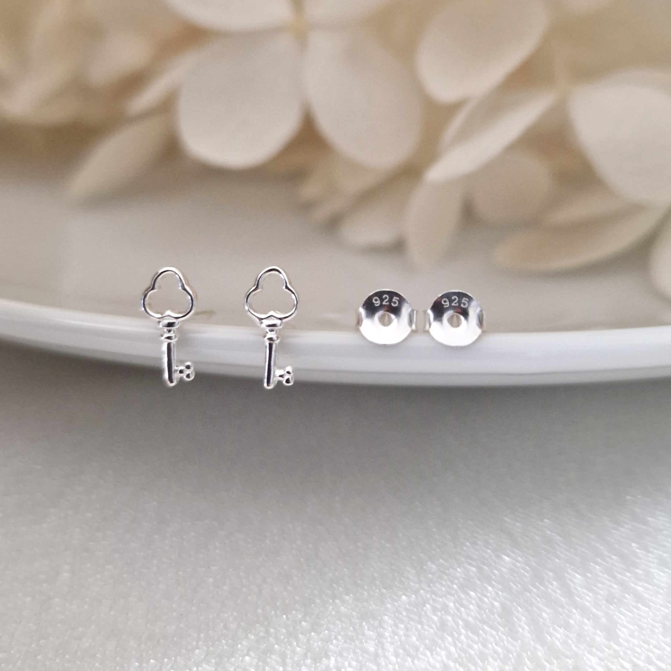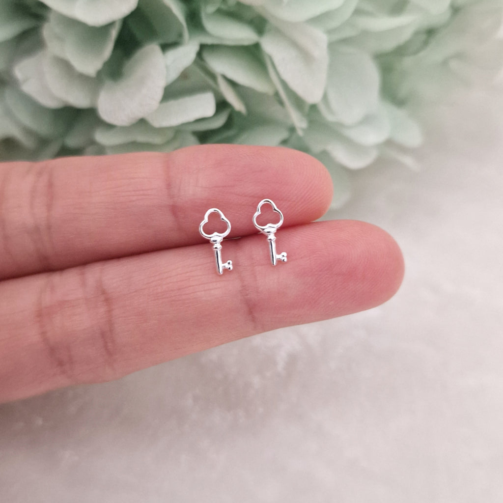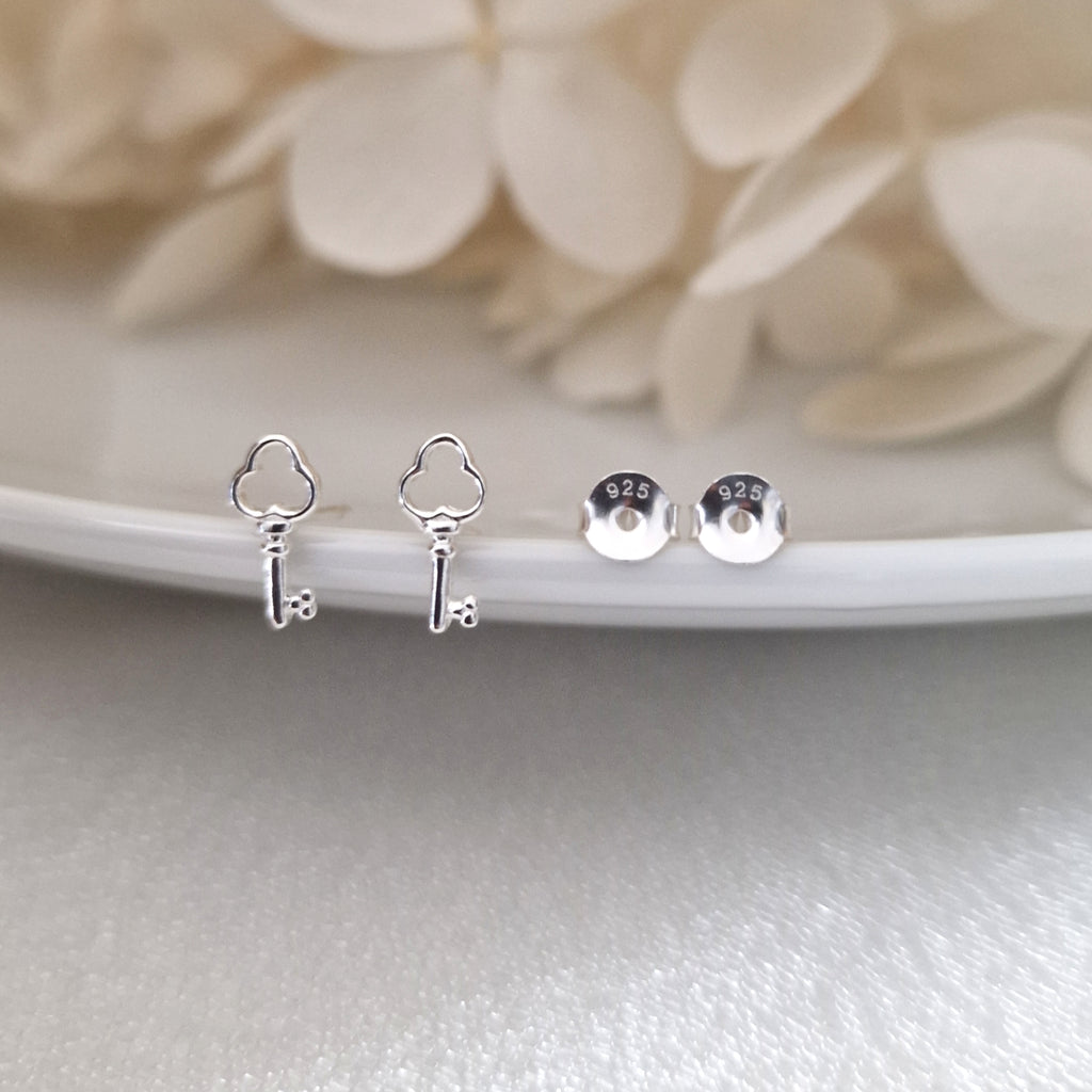 Tiny 925 Sterling Silver Key Stud Earrings – Minimalist Key Design Studs in Solid Silver – Timeless Everyday Jewelry