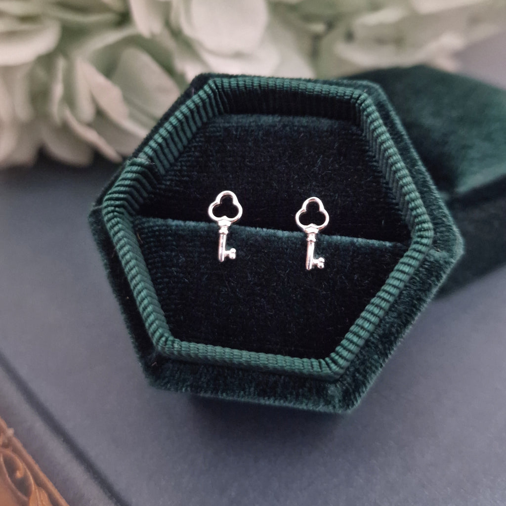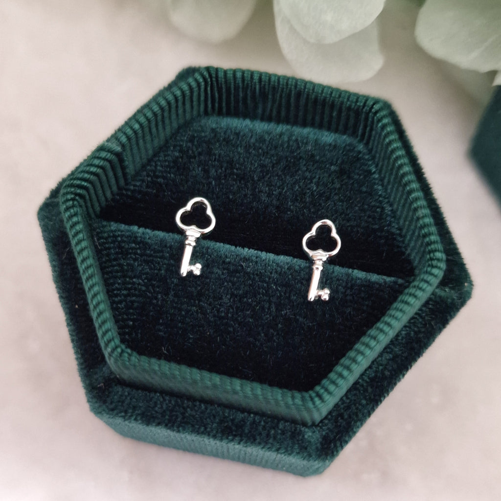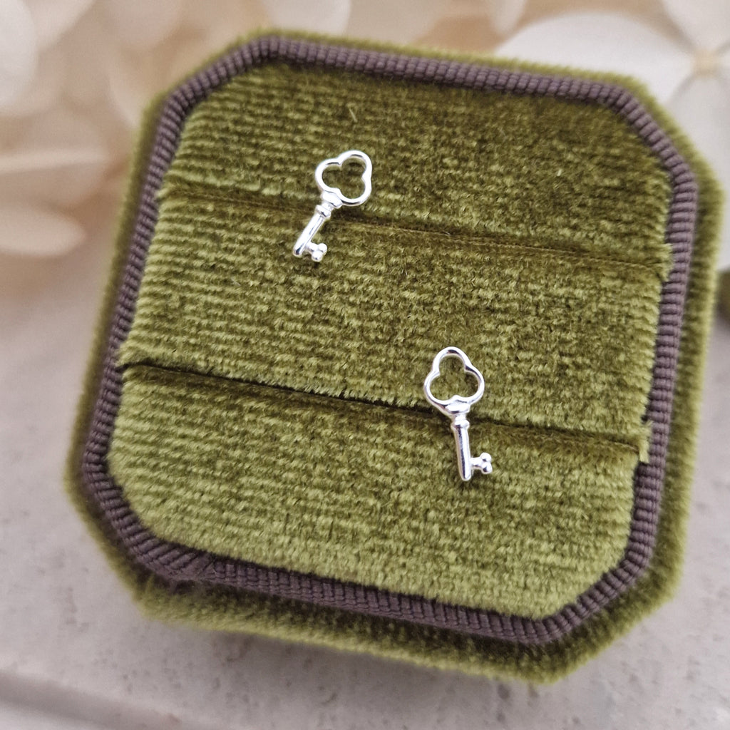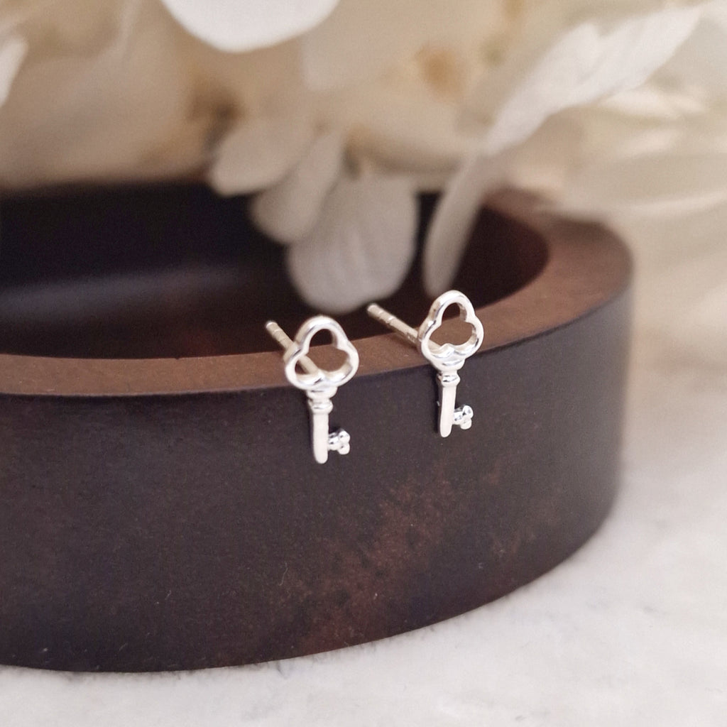 Tiny 925 Sterling Silver Key Stud Earrings – Minimalist Key Design Studs in Solid Silver – Timeless Everyday Jewelry