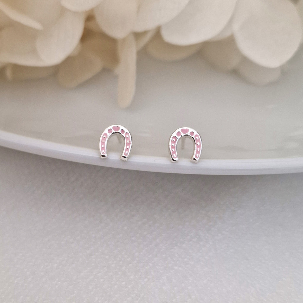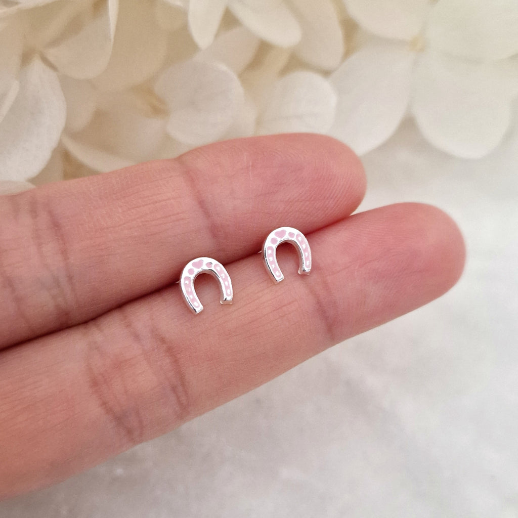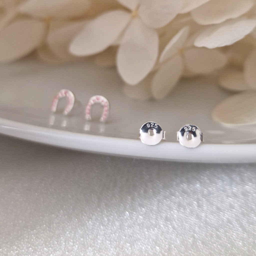 Tiny 925 Sterling Silver Pink Horseshoe Stud Earrings – Solid Silver Studs with Pink Enamel – Playful and Lucky Charm Jewelry