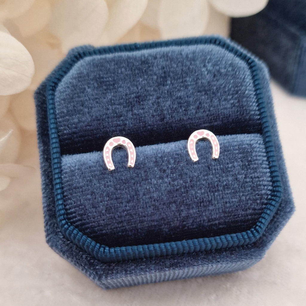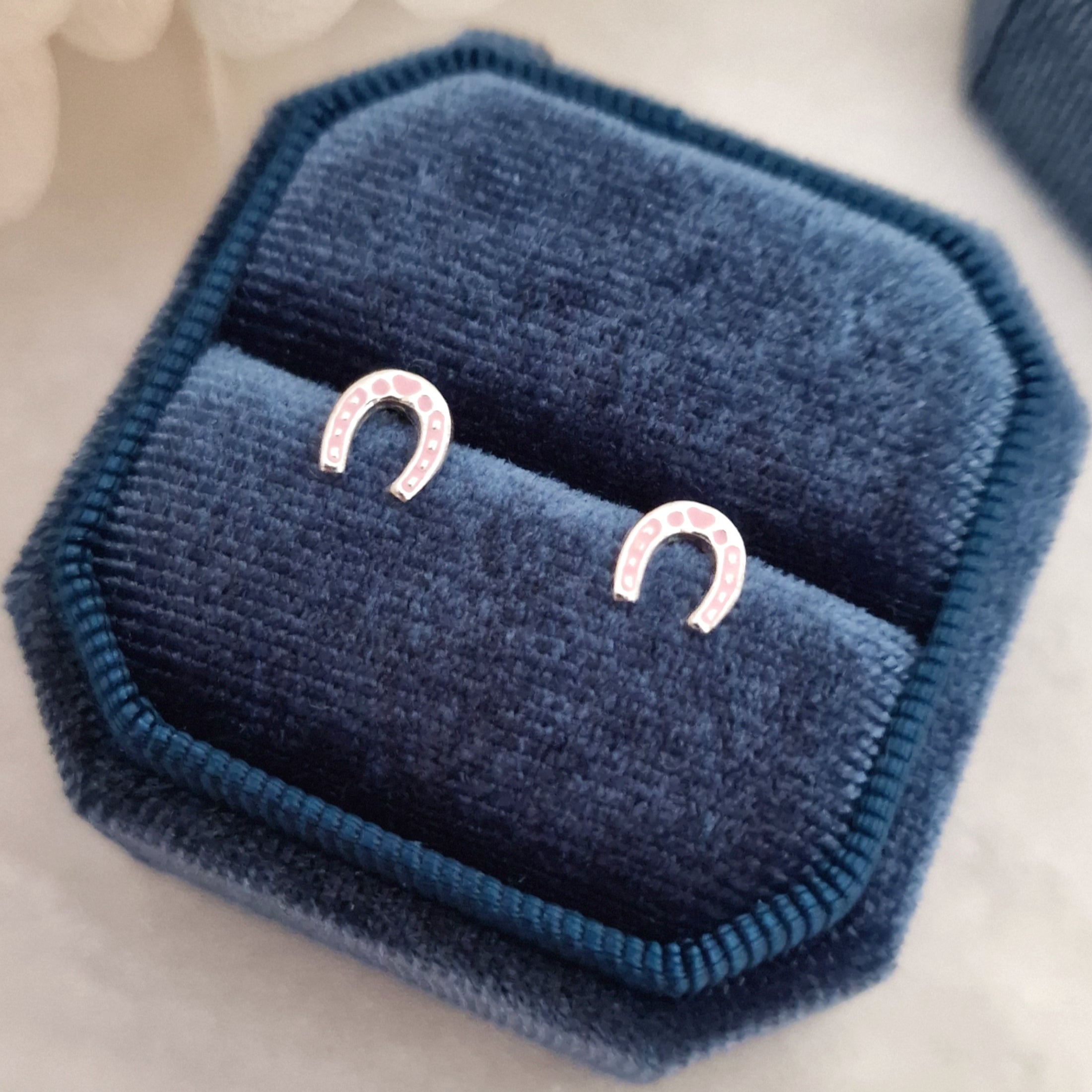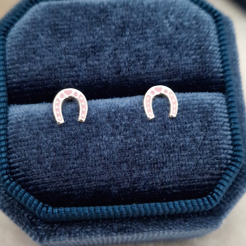 Tiny 925 Sterling Silver Pink Horseshoe Stud Earrings – Solid Silver Studs with Pink Enamel – Playful and Lucky Charm Jewelry