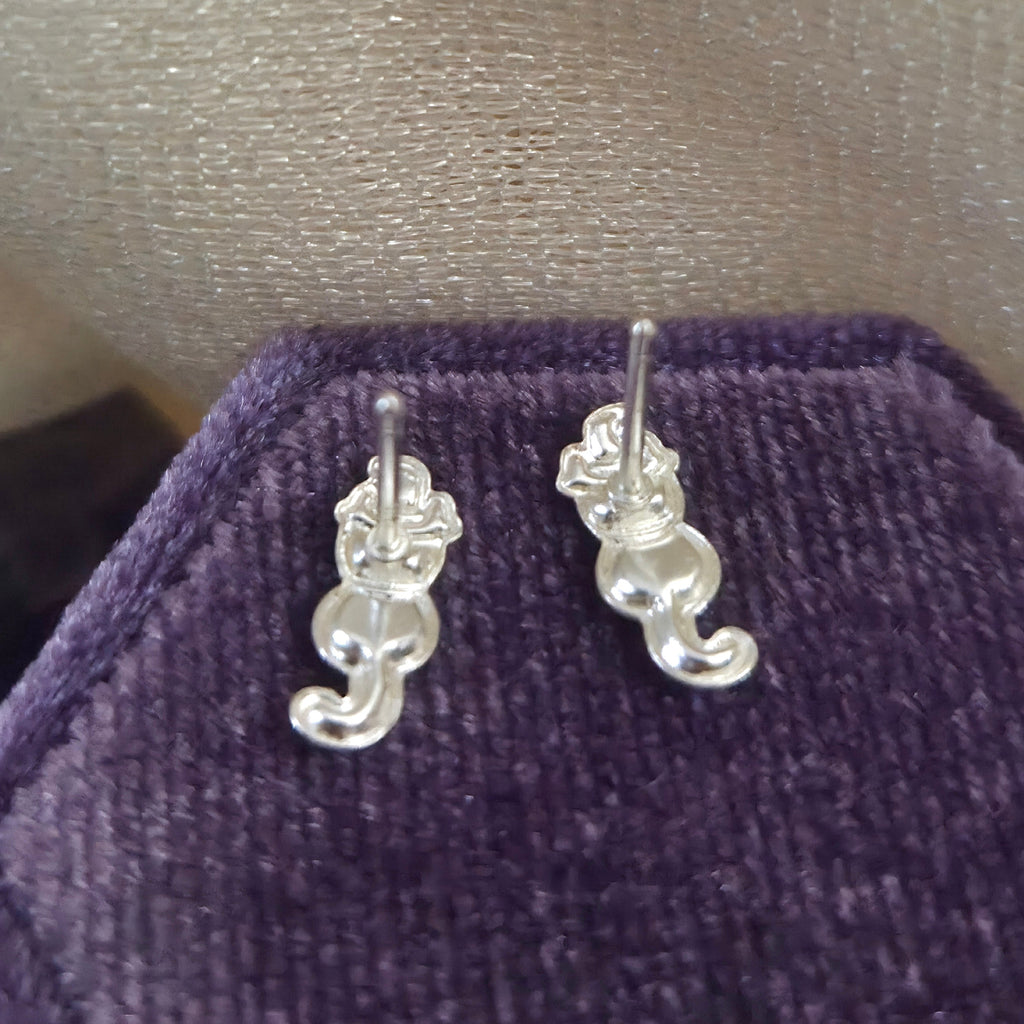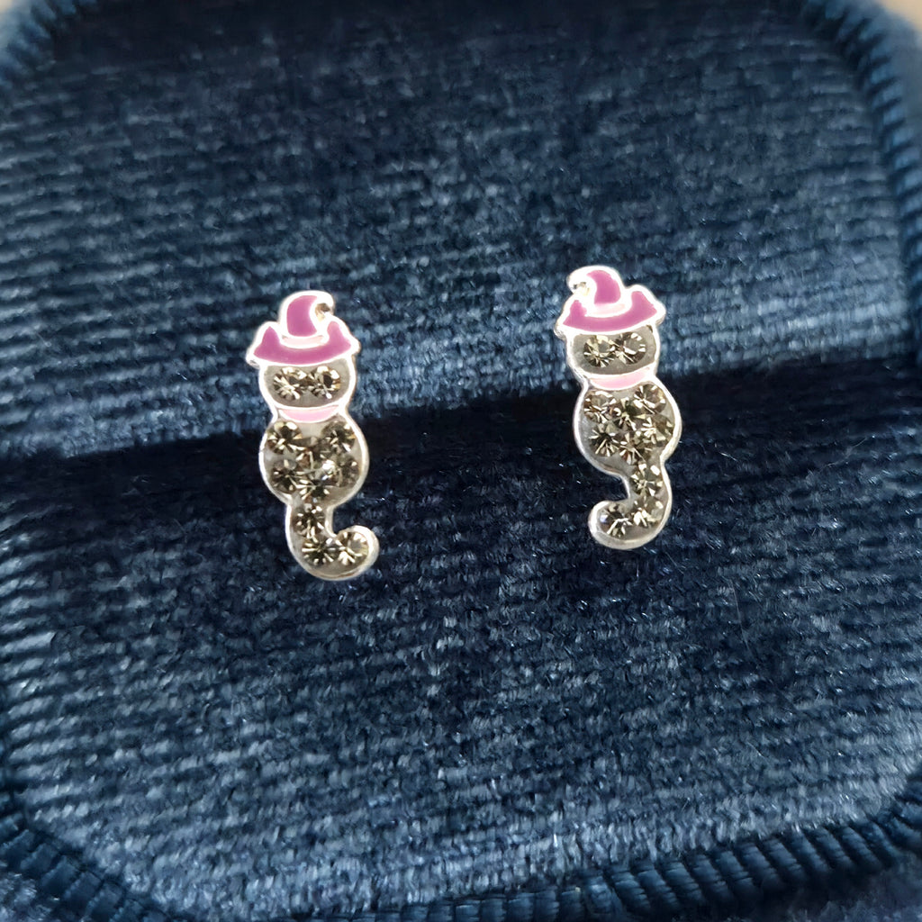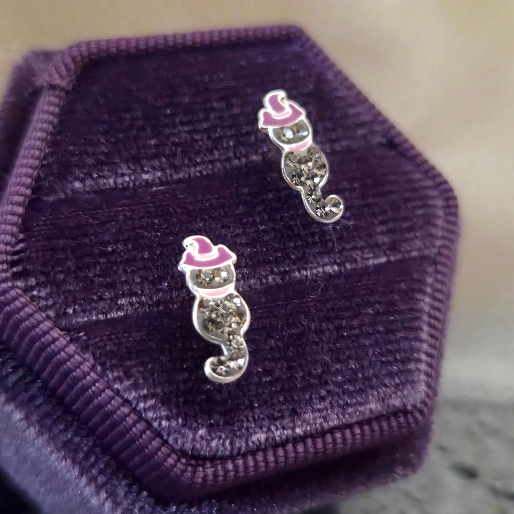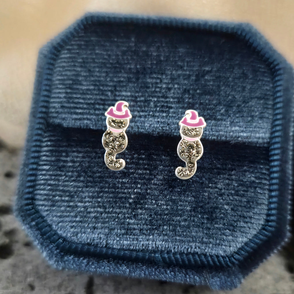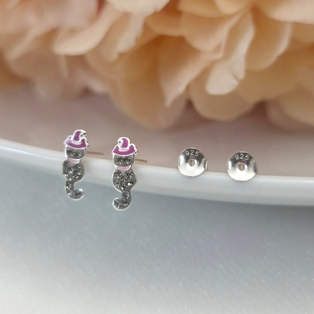 Tiny Grey Cat with Purple Witch Hat Stud Earrings in 925 Sterling Silver – Solid Silver Halloween Studs with Crystals
