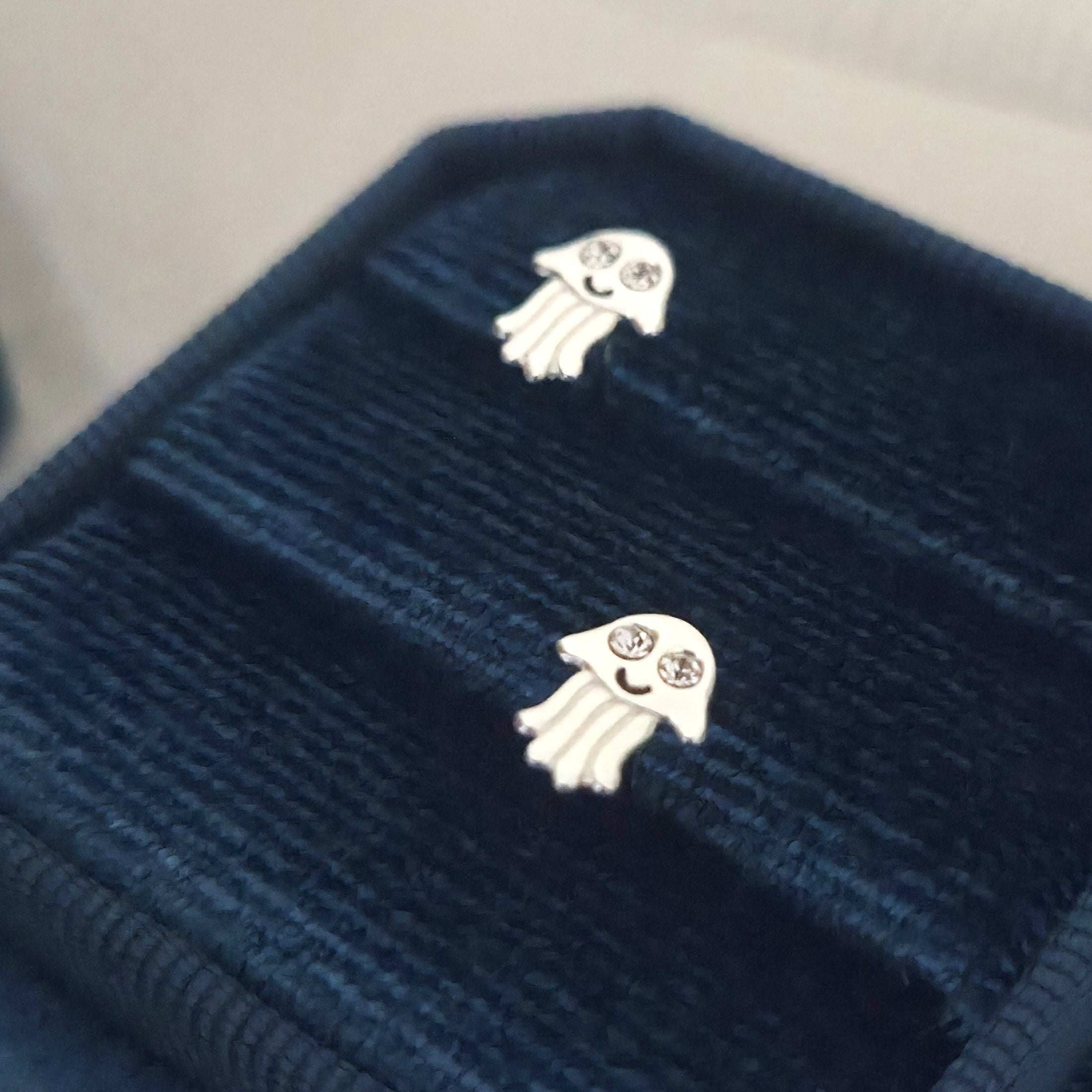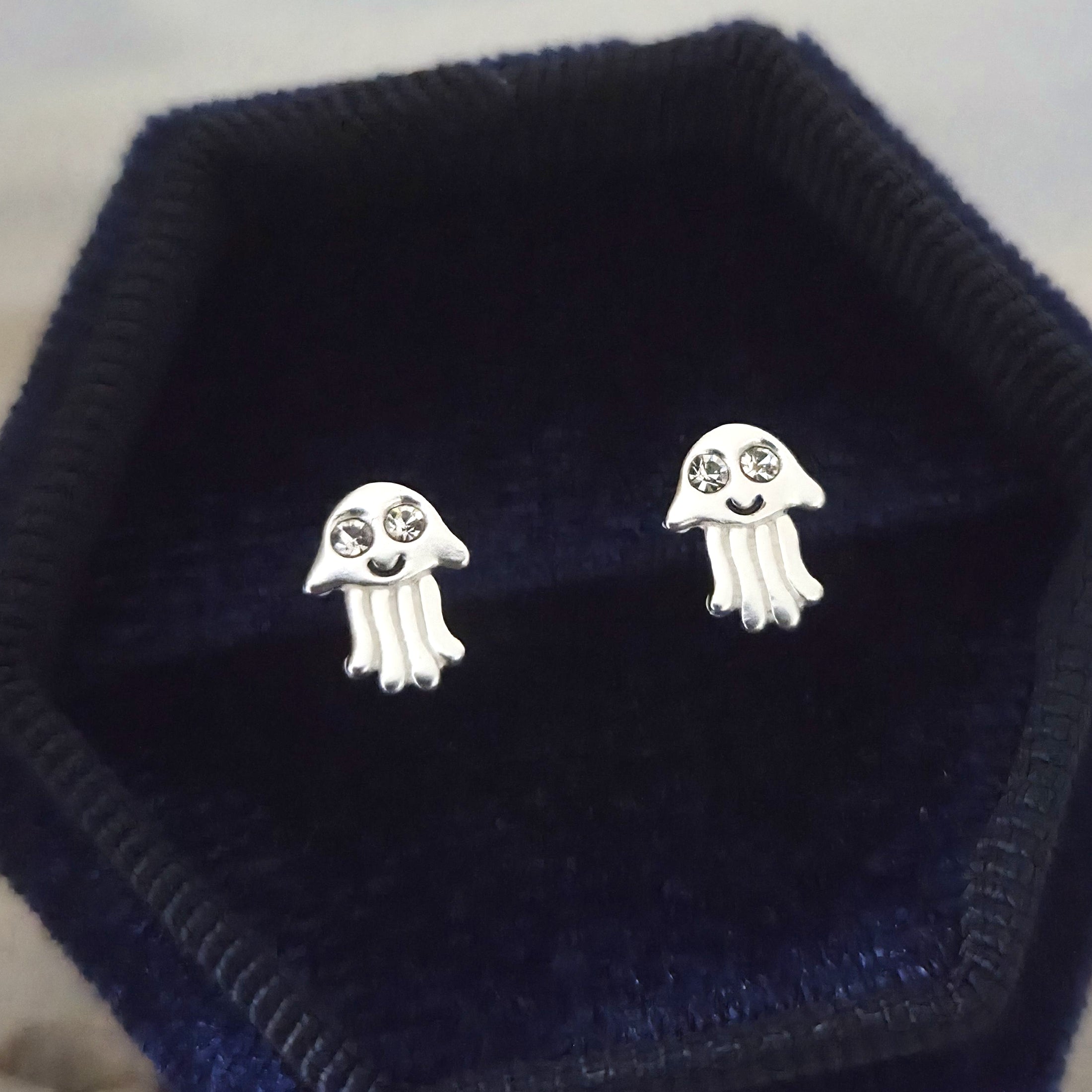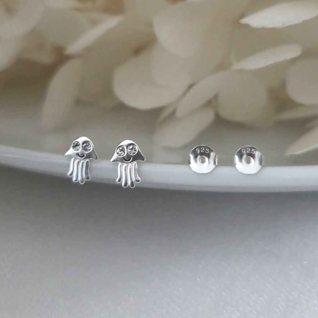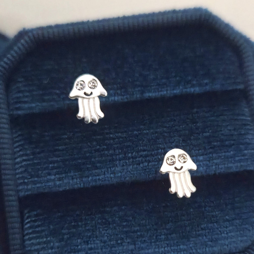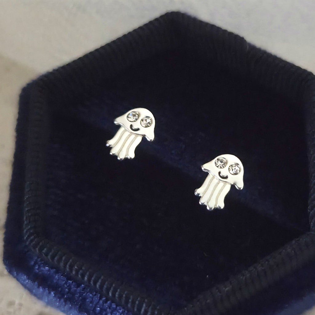 Tiny Jellyfish Stud Earrings in 925 Sterling Silver – Solid Silver Sea Animal Studs with Crystals – Cute Ocean Summer Beach Jewelry