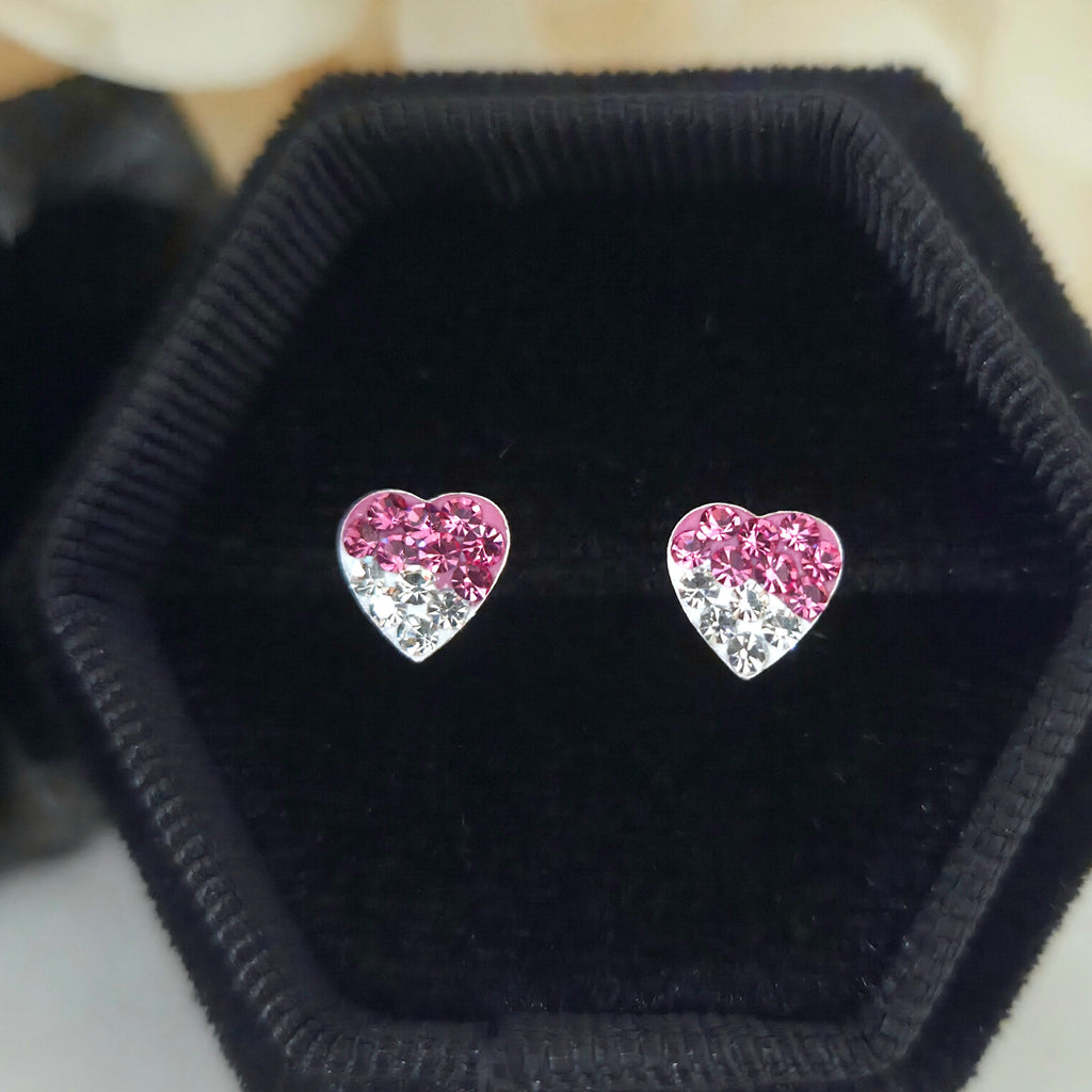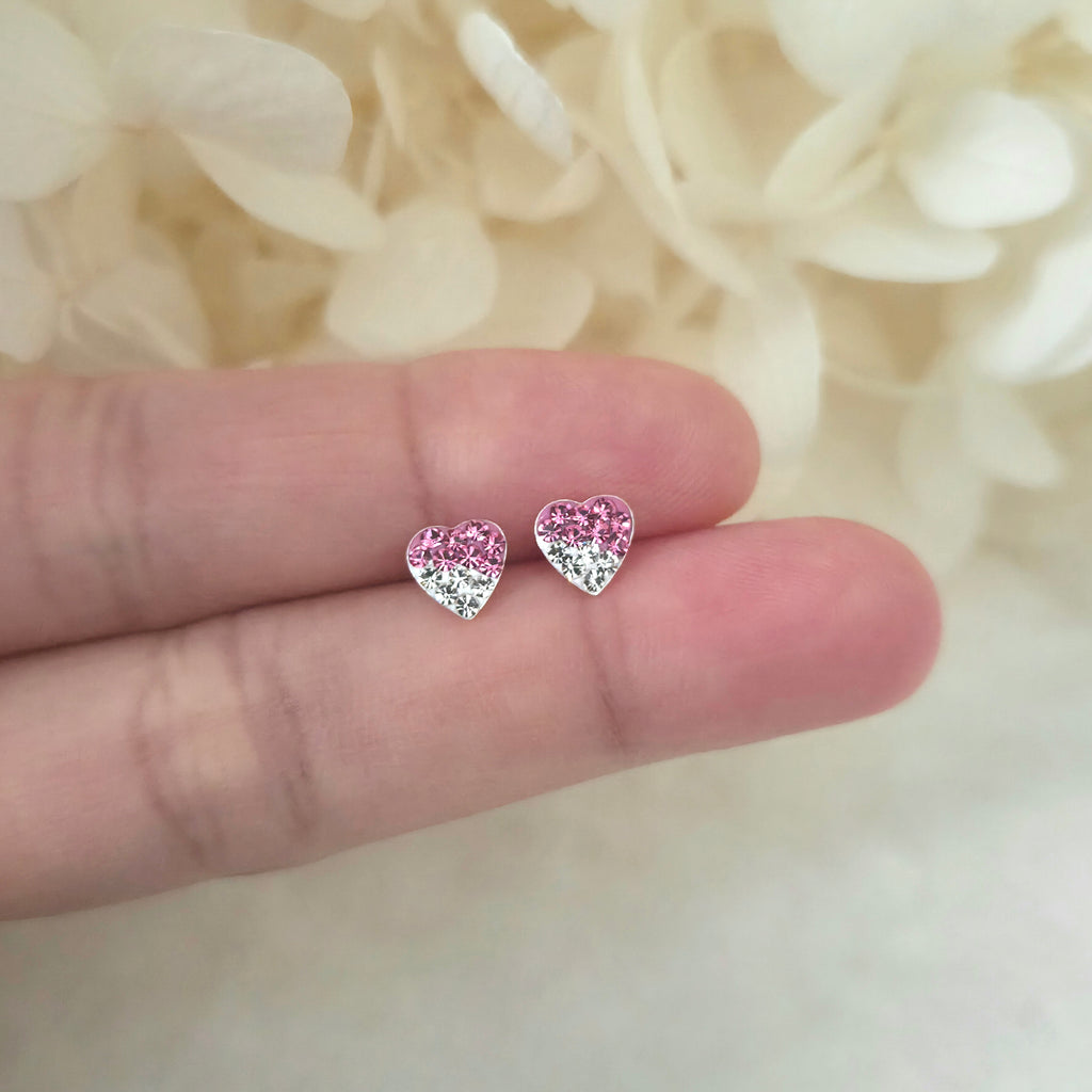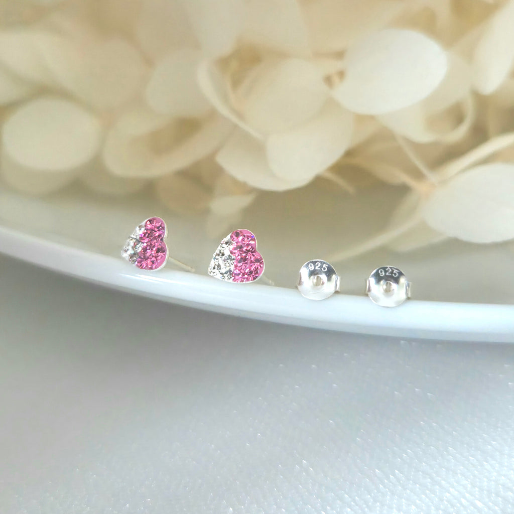 Tiny Pink & White Heart Stud Earrings in 925 Sterling Silver – Solid Silver Valentine’s Love Studs with Crystals