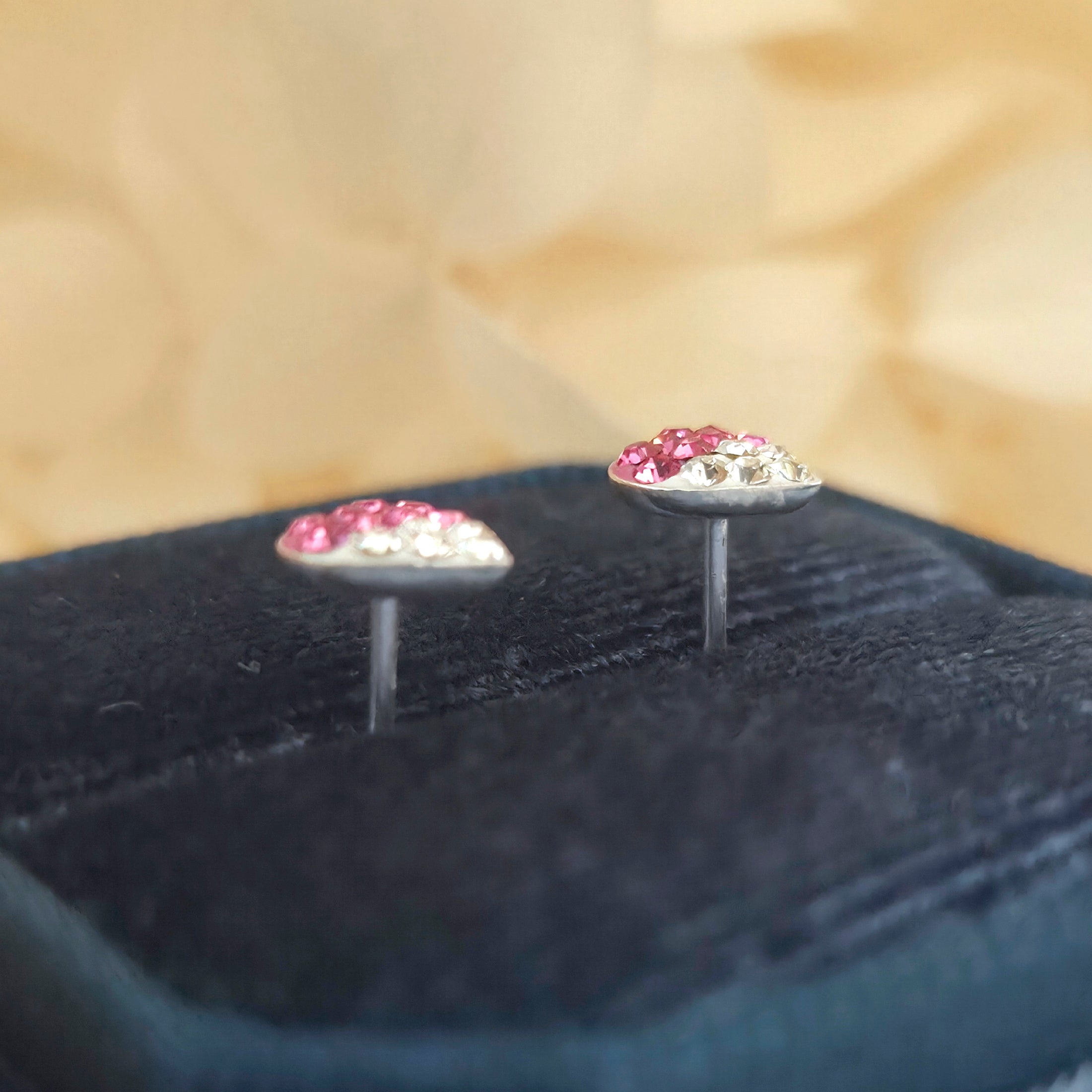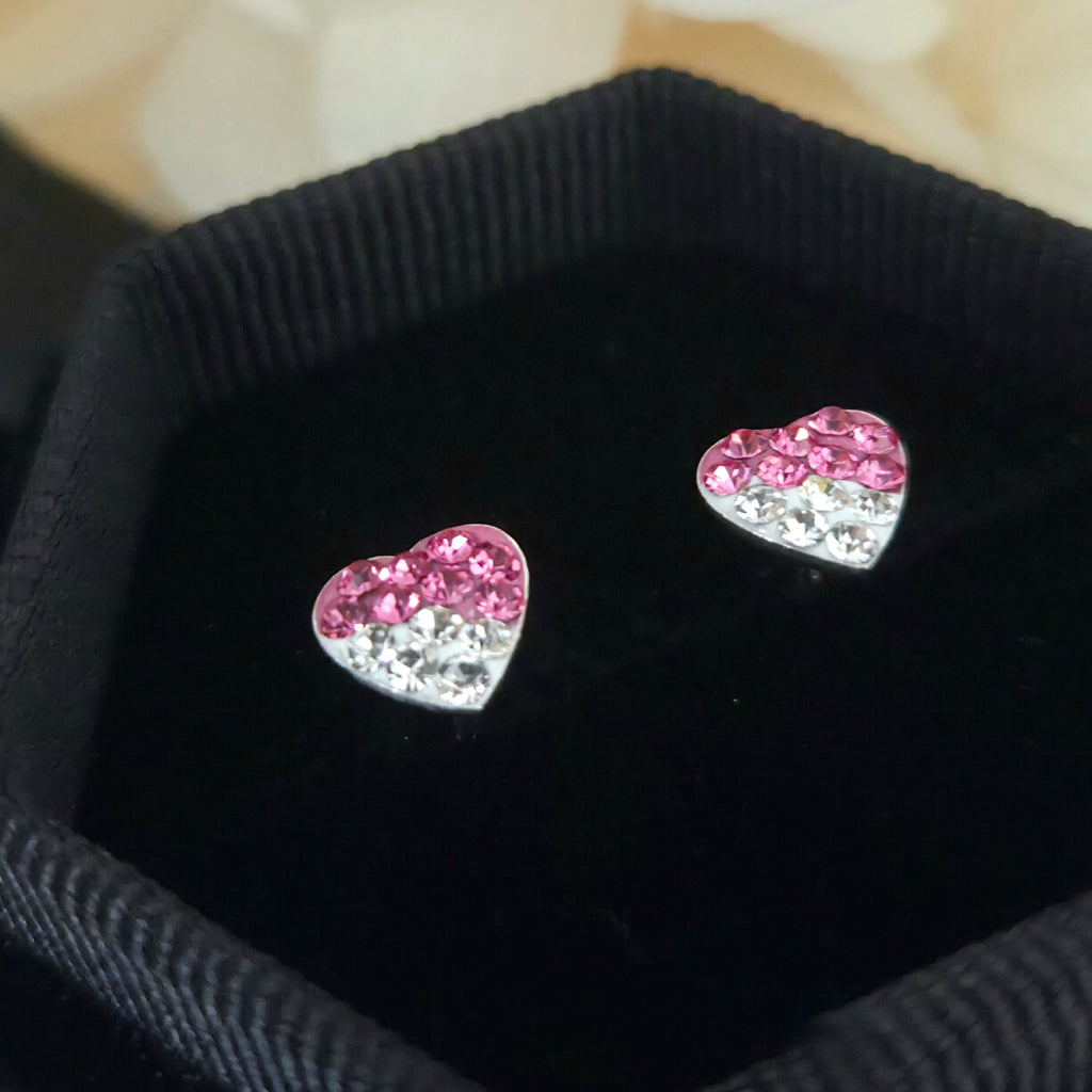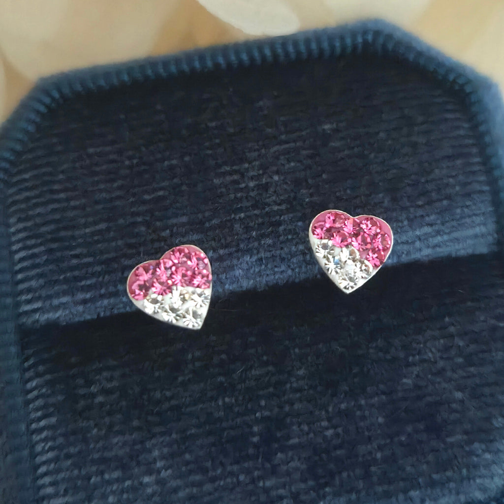 Tiny Pink & White Heart Stud Earrings in 925 Sterling Silver – Solid Silver Valentine’s Love Studs with Crystals