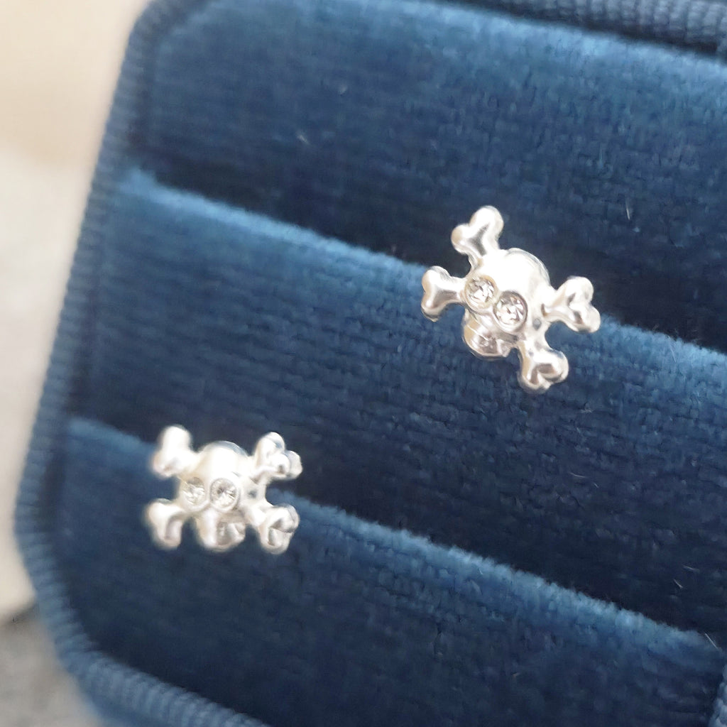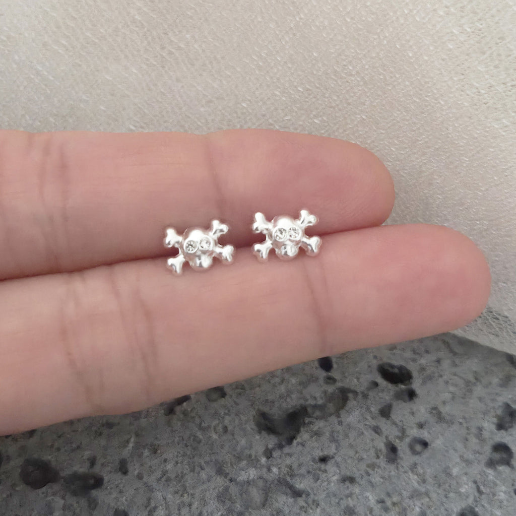 Tiny skull stud earrings in solid 925 sterling silver, accented with sparkling crystals for a bold yet elegant shine. Perfect as gothic jewelry, rock accessories, or a stylish touch for Halloween outfits. Lightweight and comfortable, these silver studs make a unique gift for skull lovers.