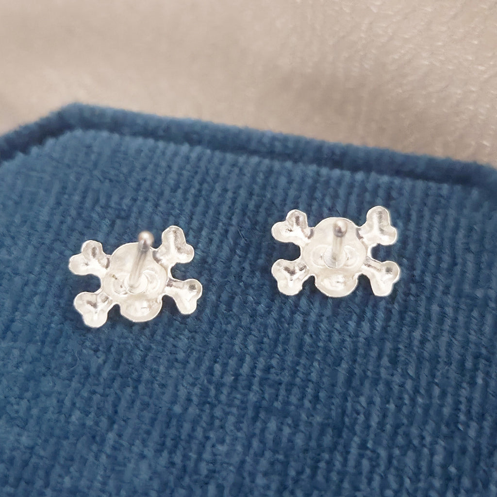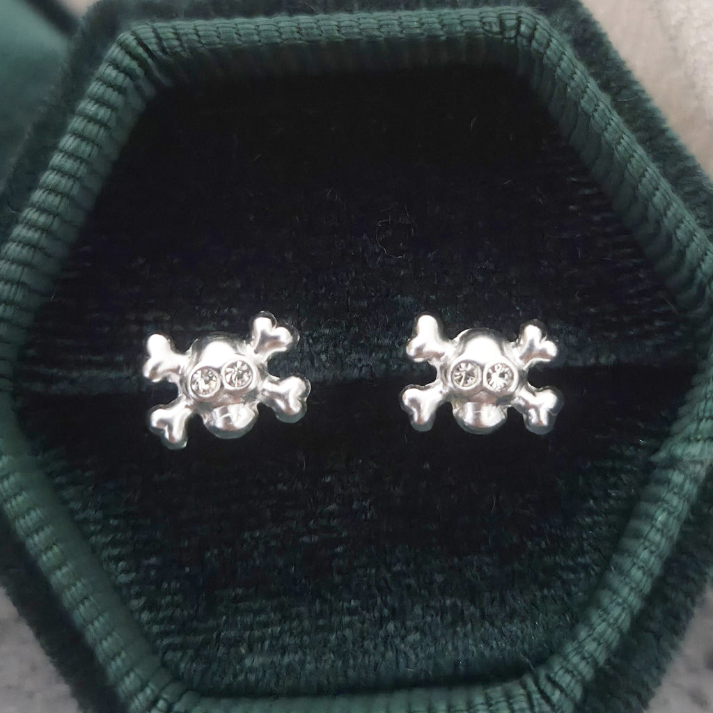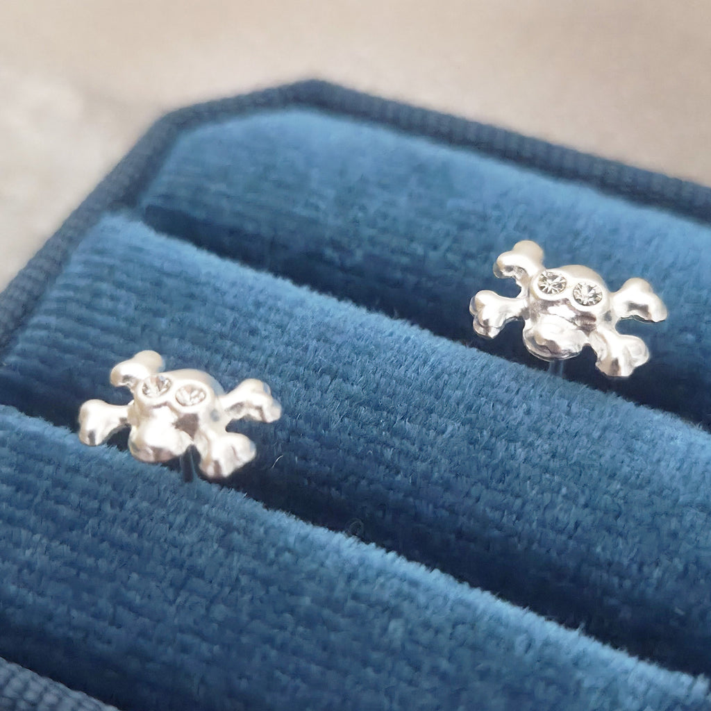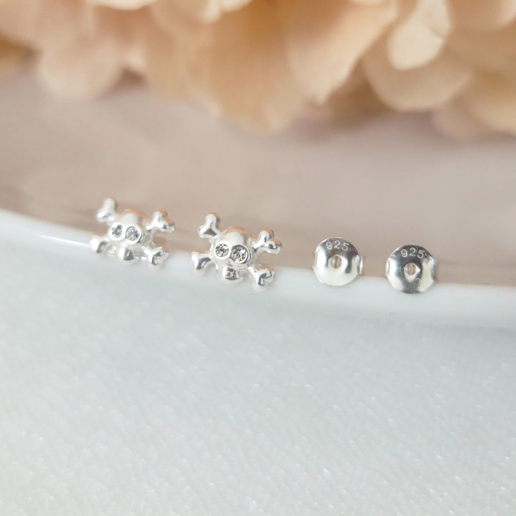 Tiny Skull Stud Earrings in 925 Sterling Silver – Solid Silver Halloween Studs with Crystals
