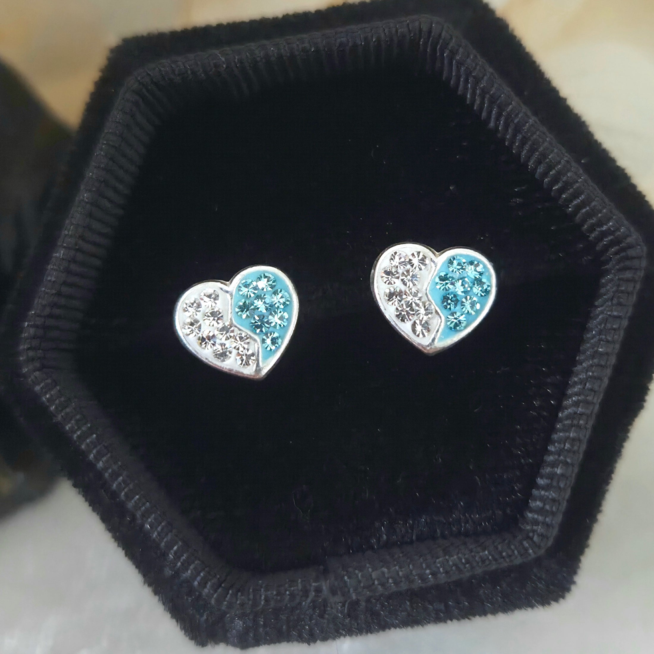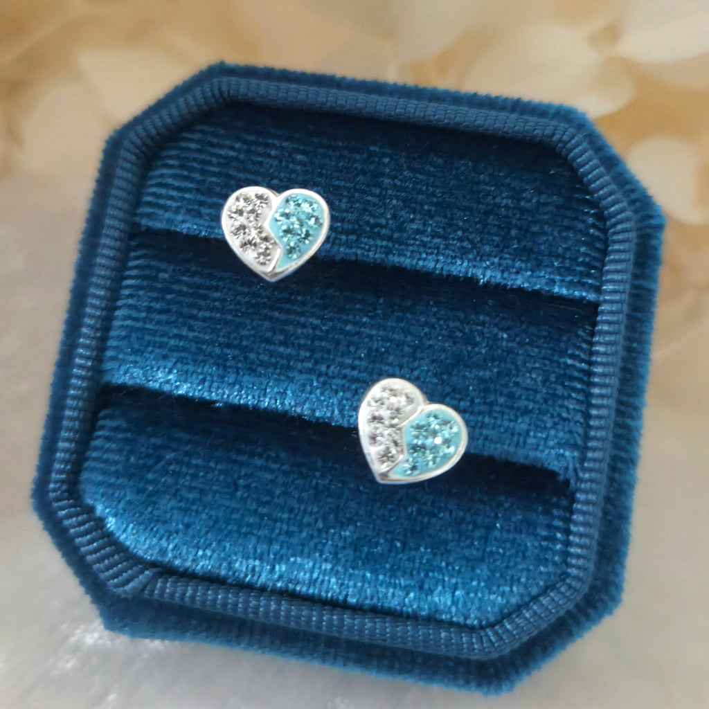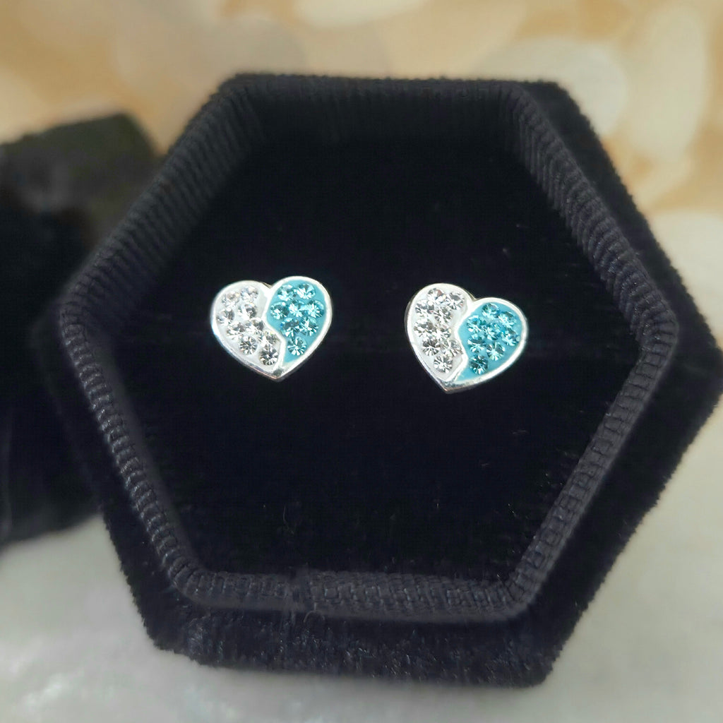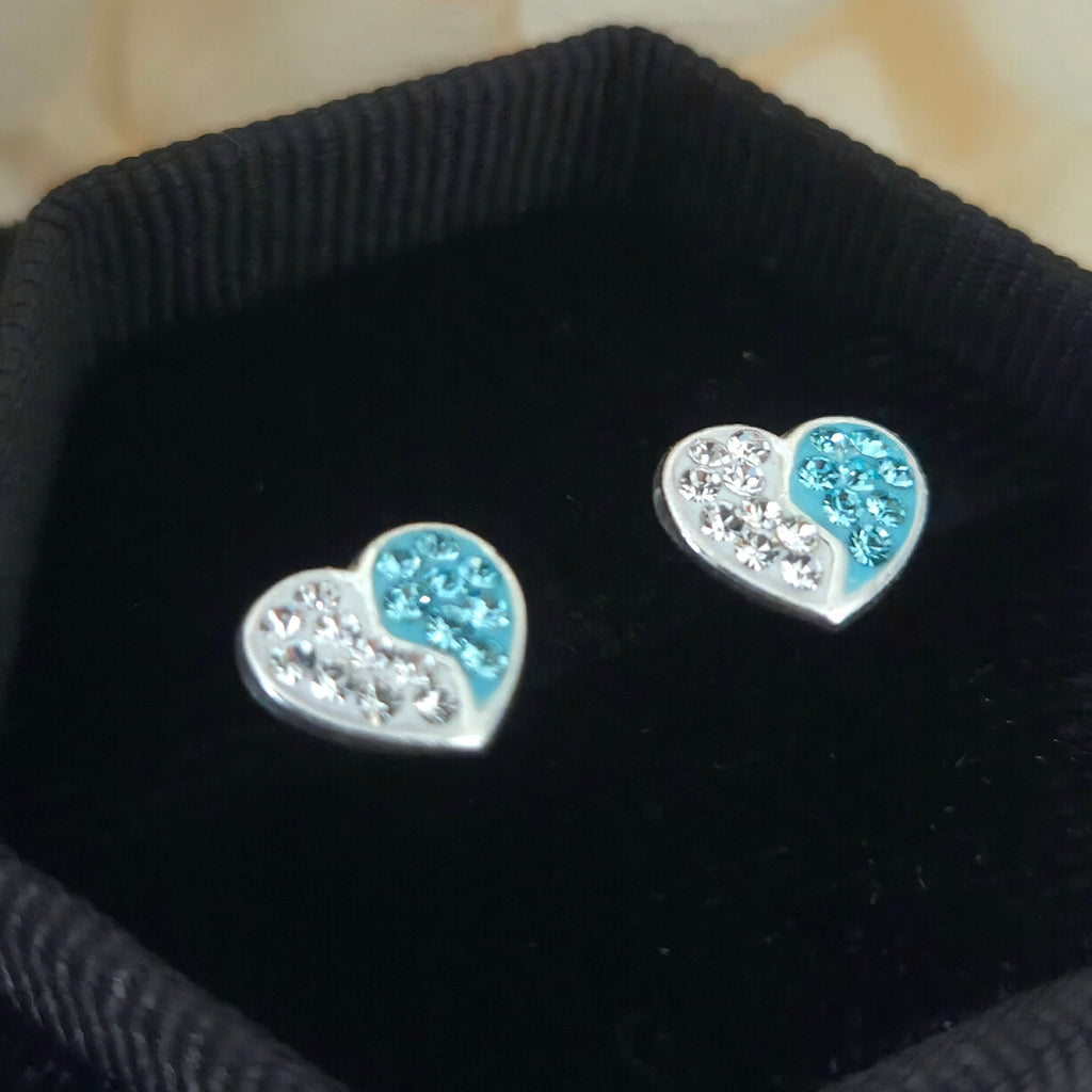 Elegant white and blue heart stud earrings crafted in solid 925 sterling silver, adorned with sparkling crystals. A romantic and versatile accessory, perfect as a gift for Valentine’s Day, anniversaries, or to add a touch of love and sparkle to any outfit.