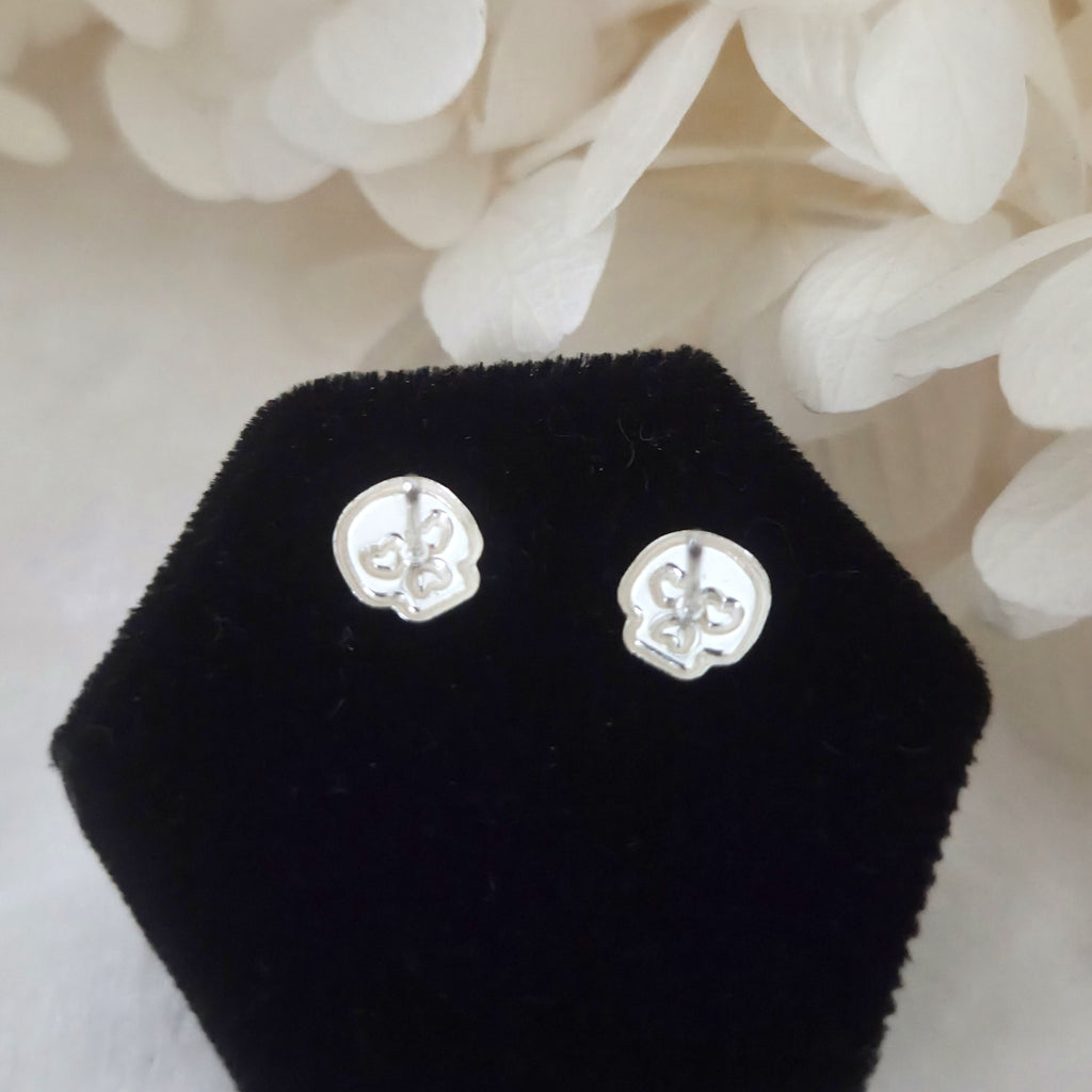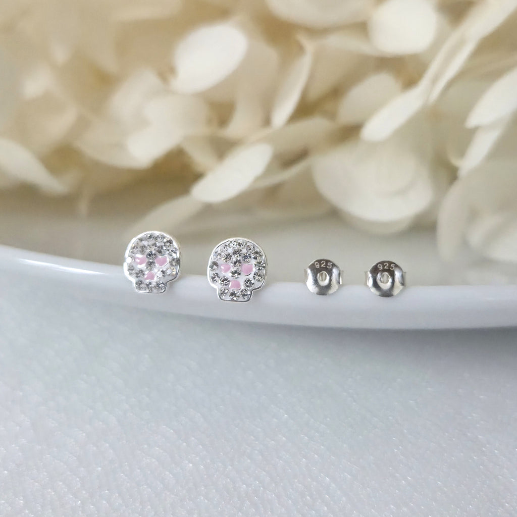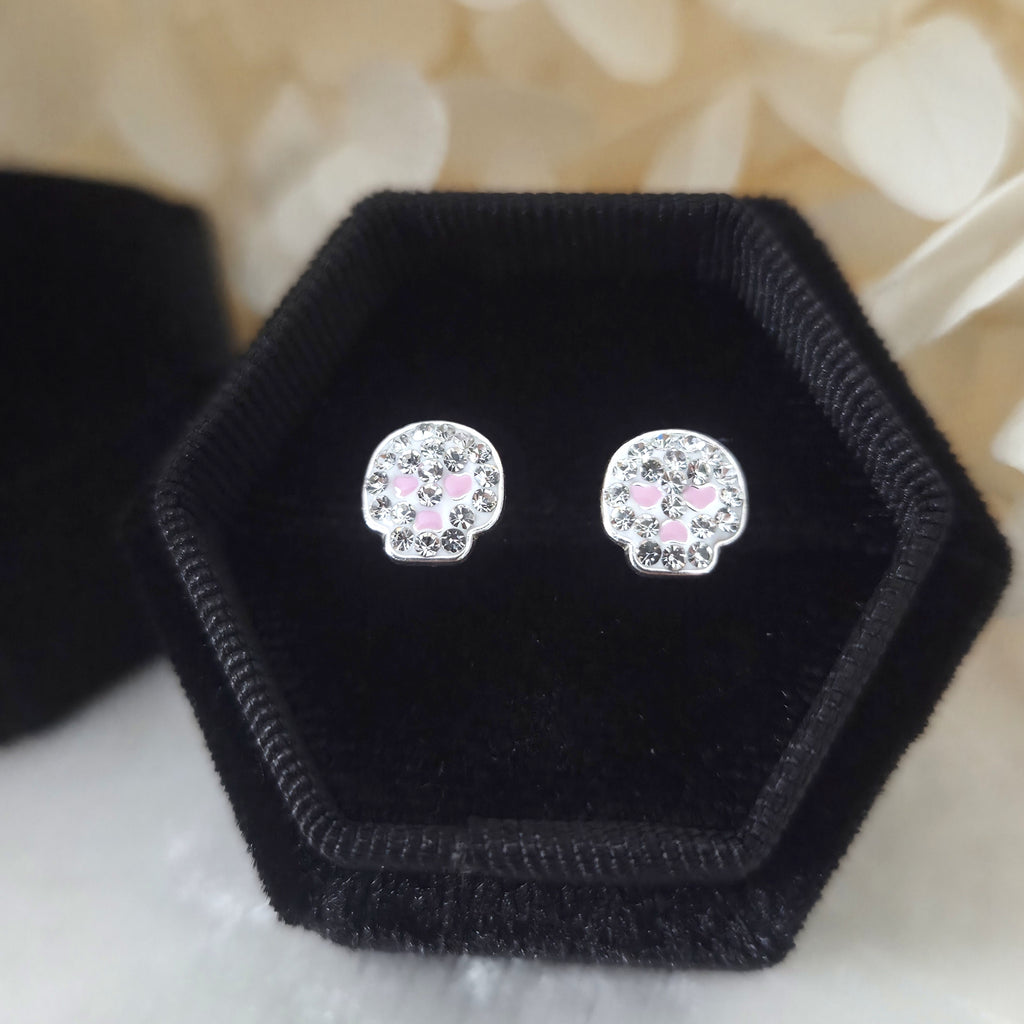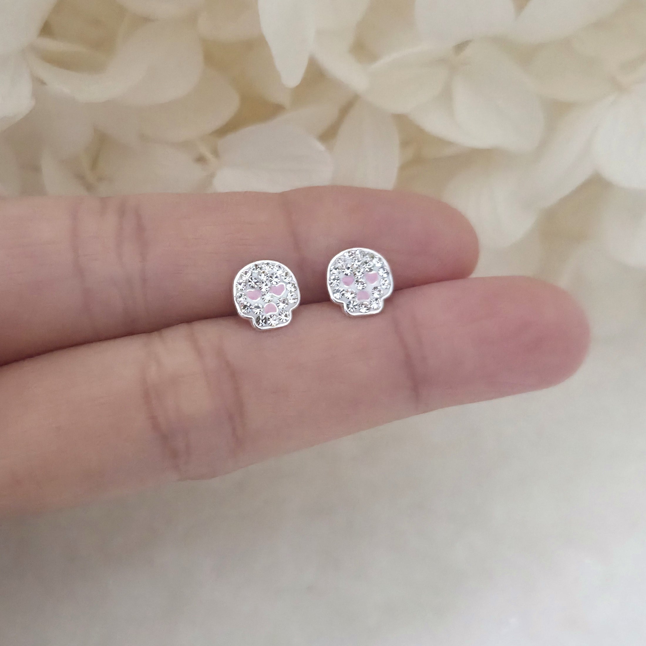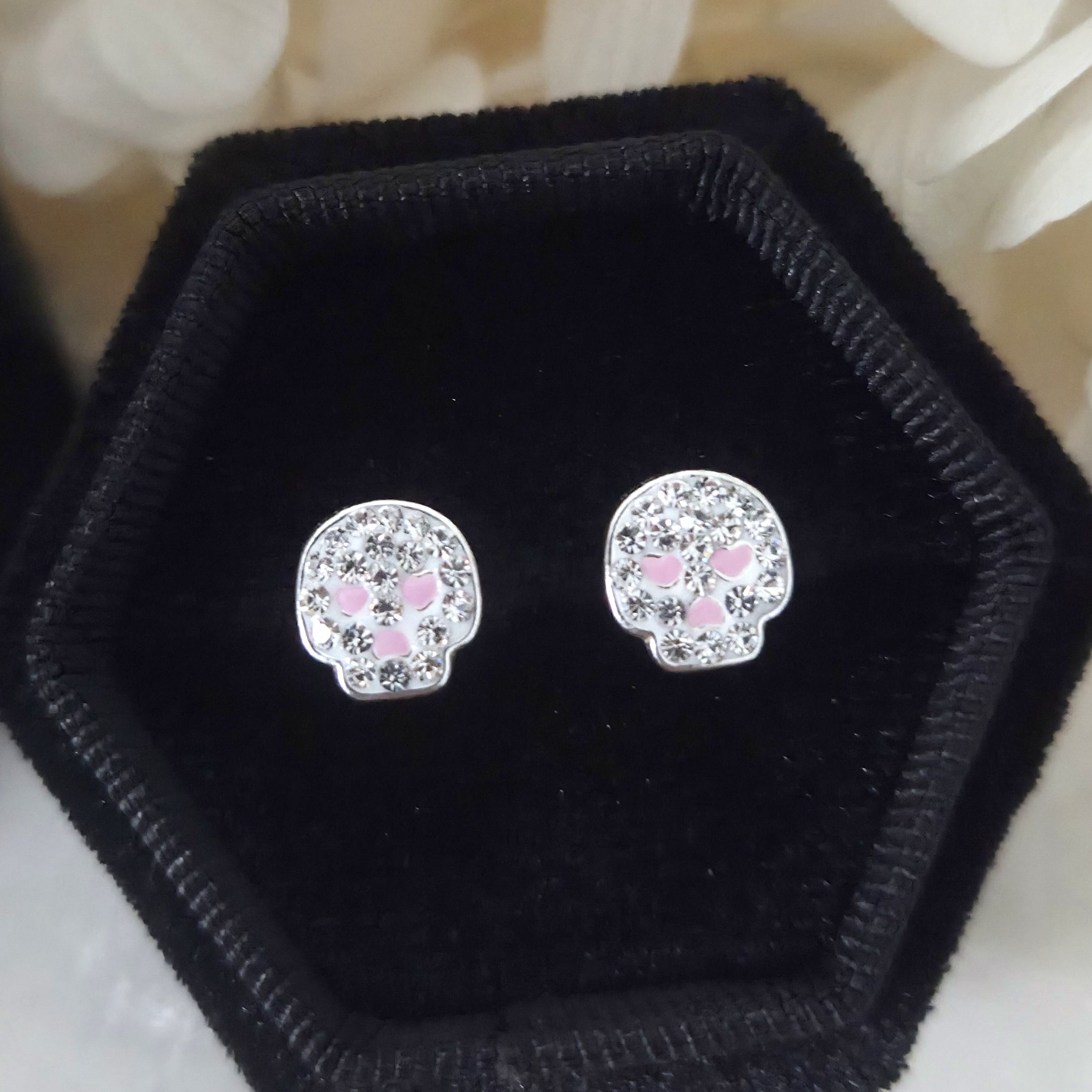 White and pink skull stud earrings in solid 925 sterling silver, accented with sparkling crystals. Perfect for gothic, bold, or Halloween style.