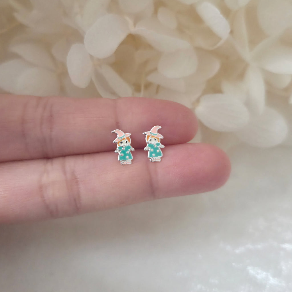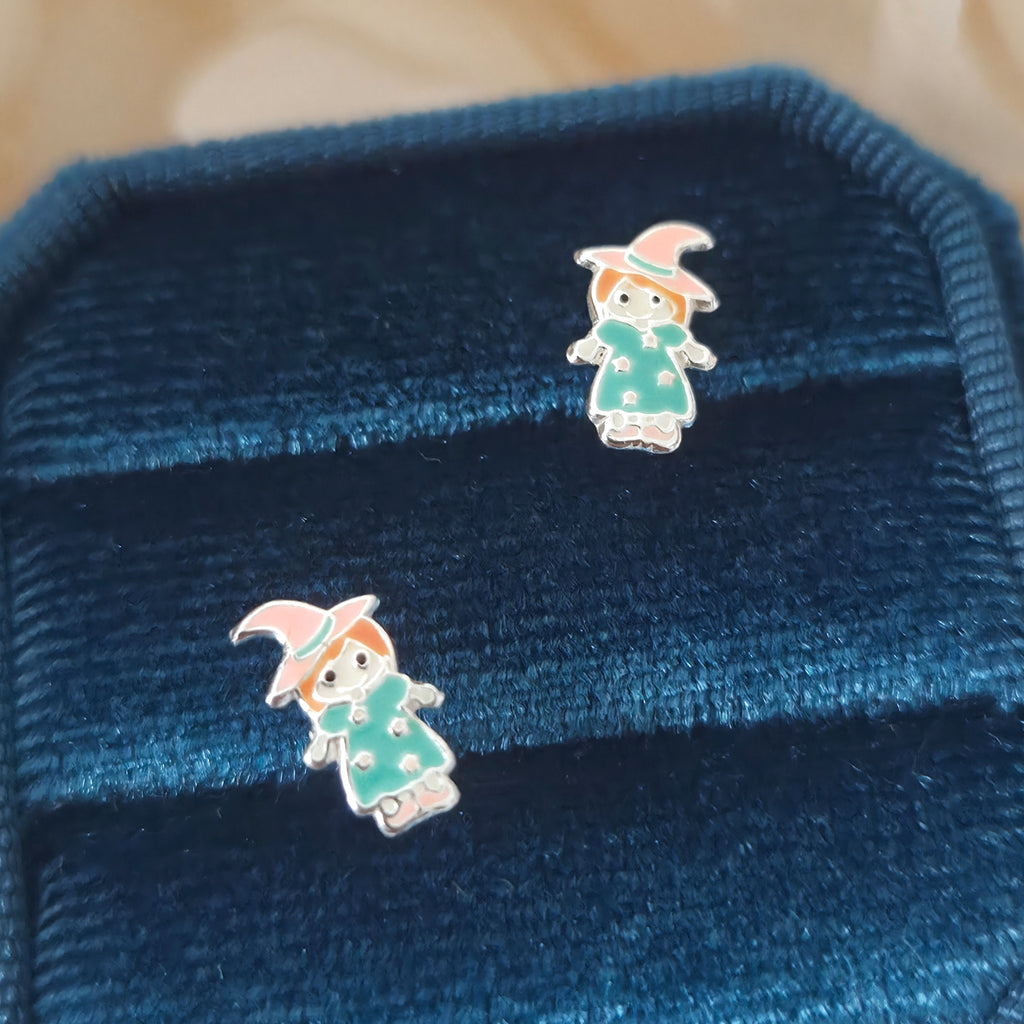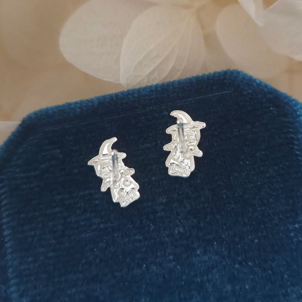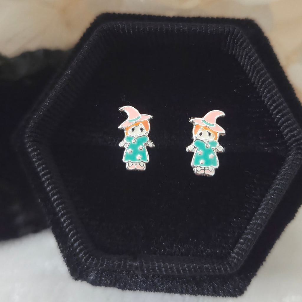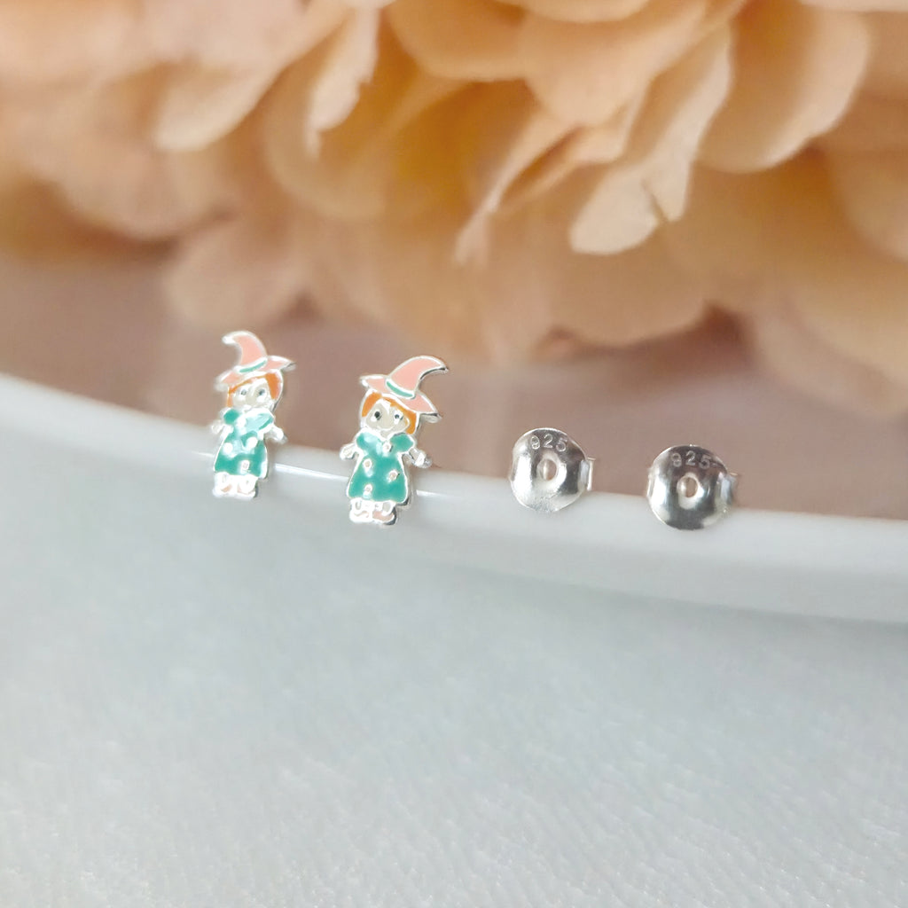 Witch in Green Dress Stud Earrings in 925 Sterling Silver – Solid Silver Halloween Studs