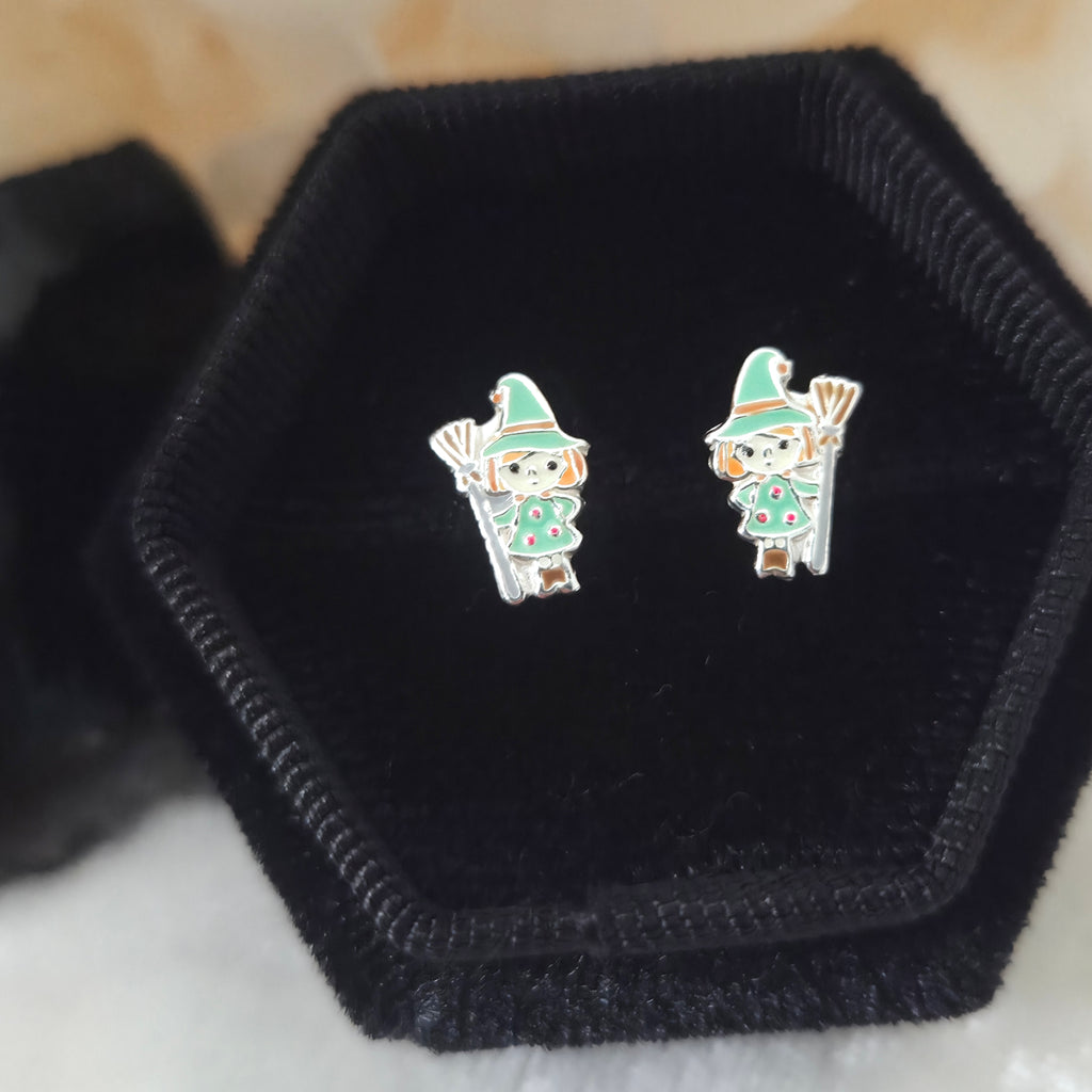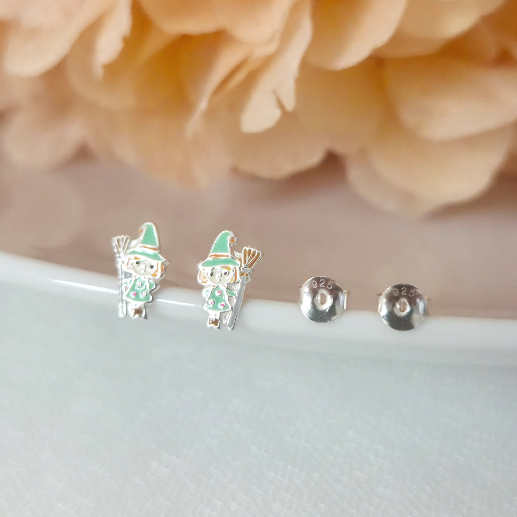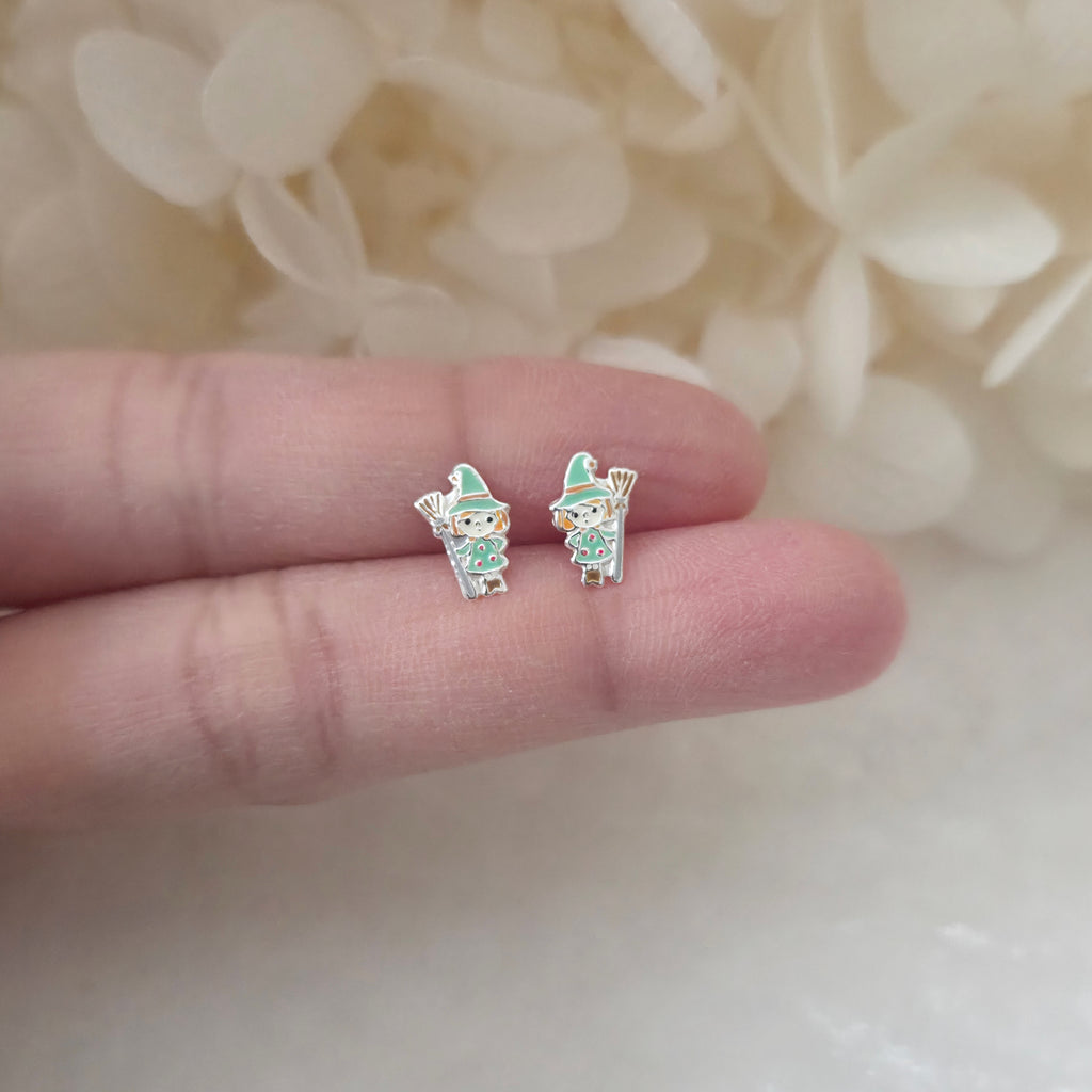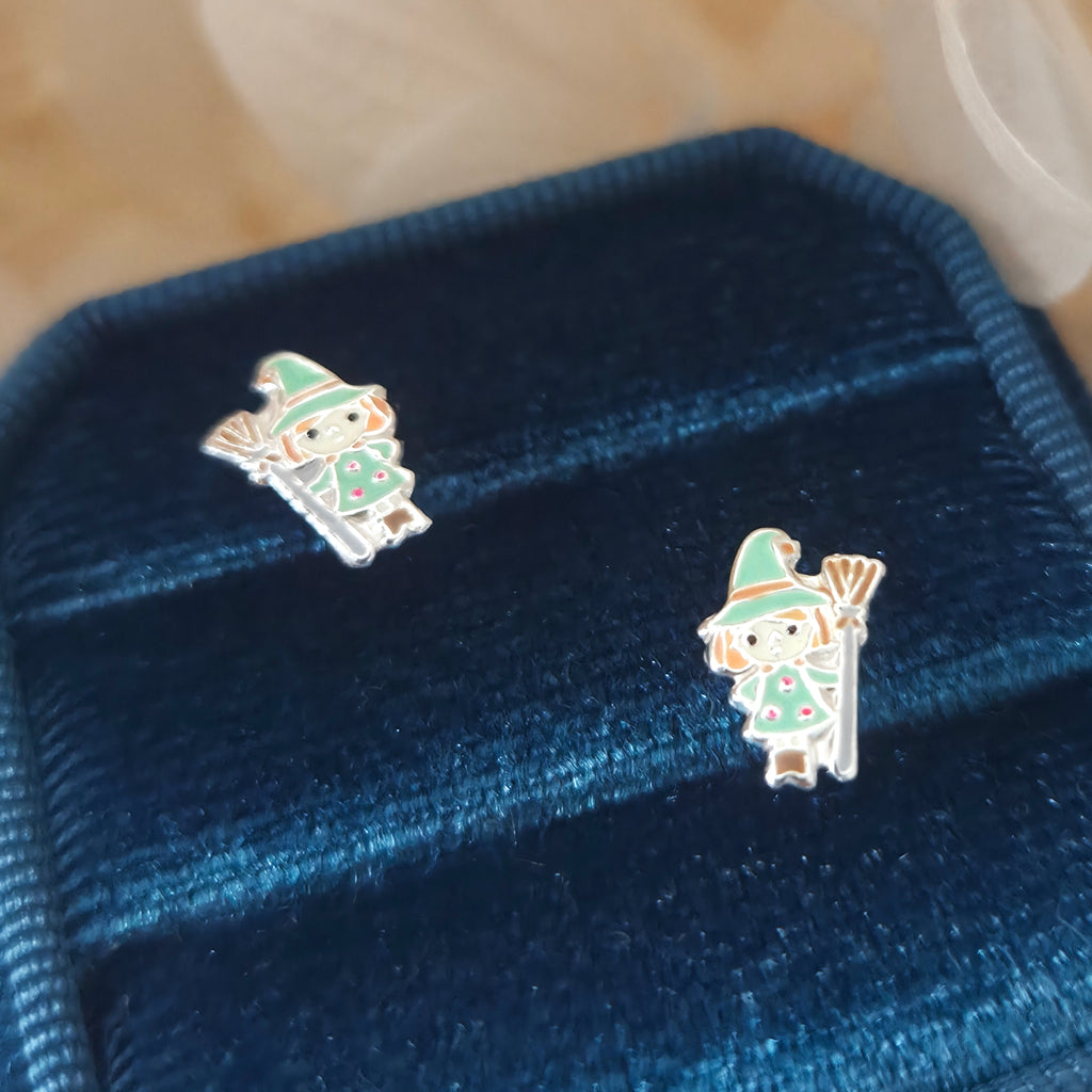 Witch in Green Dress with Broom Stud Earrings in 925 Sterling Silver – Solid Silver Halloween Studs