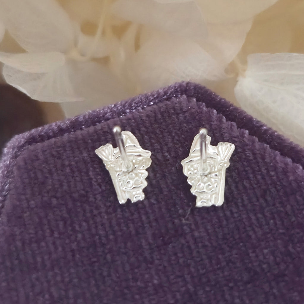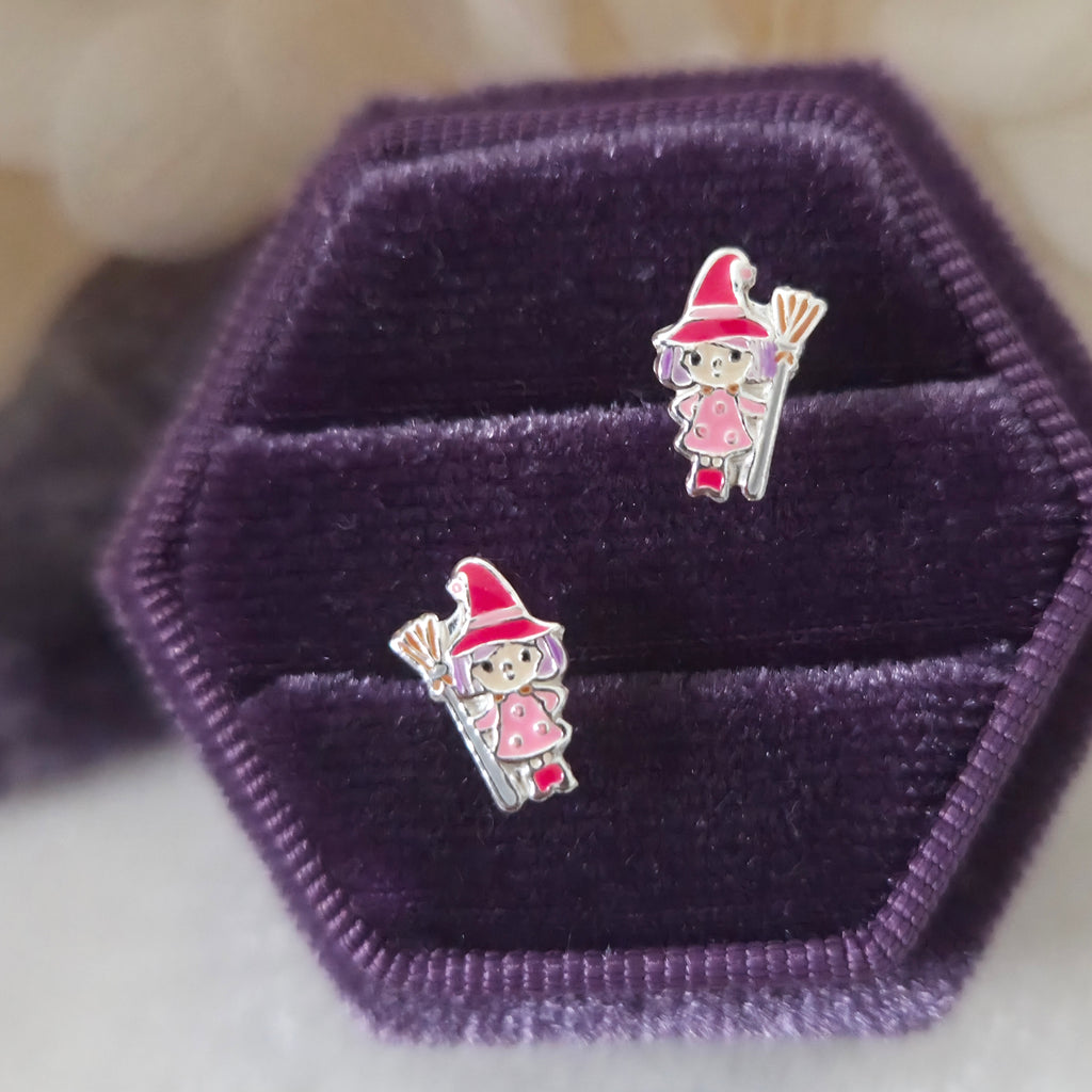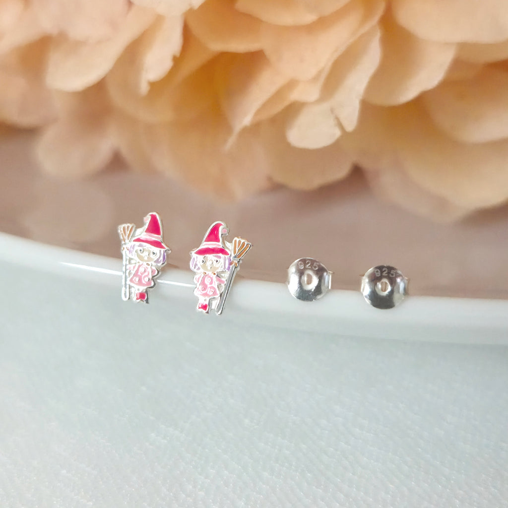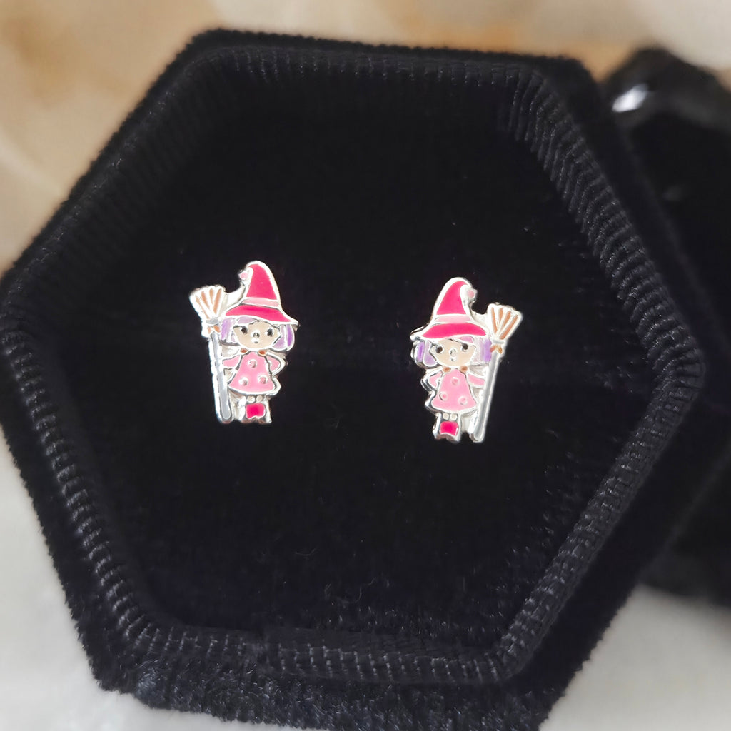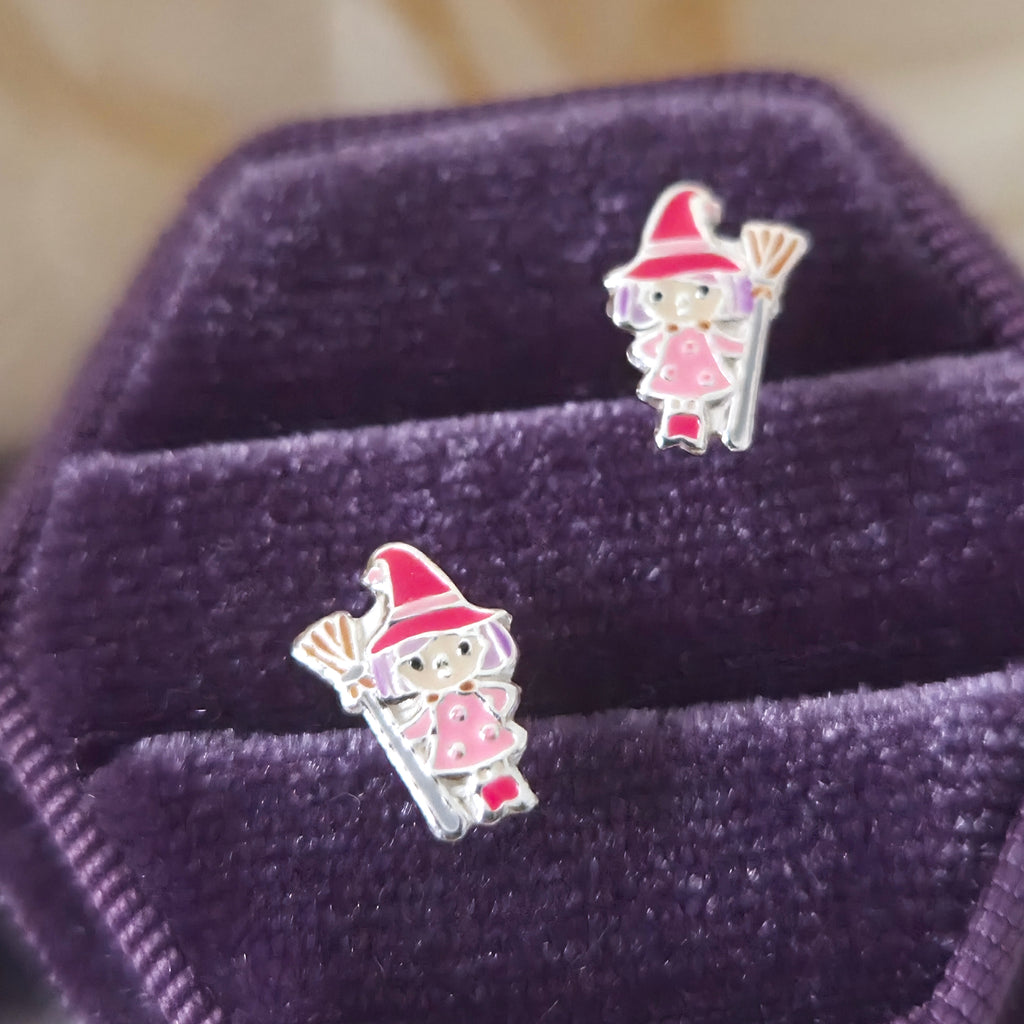 Witch in Pink Dress with Broom Stud Earrings in 925 Sterling Silver – Solid Silver Halloween Studs