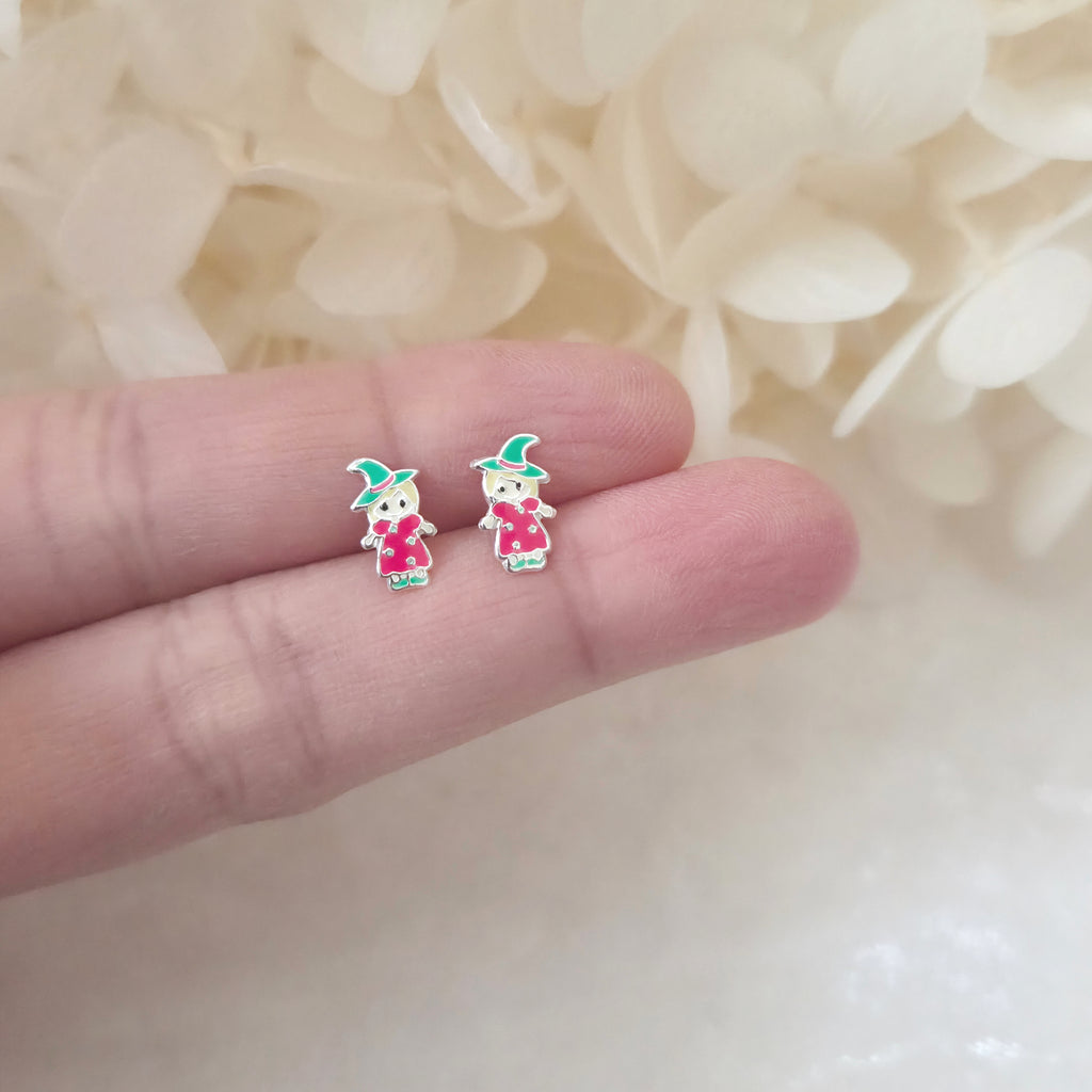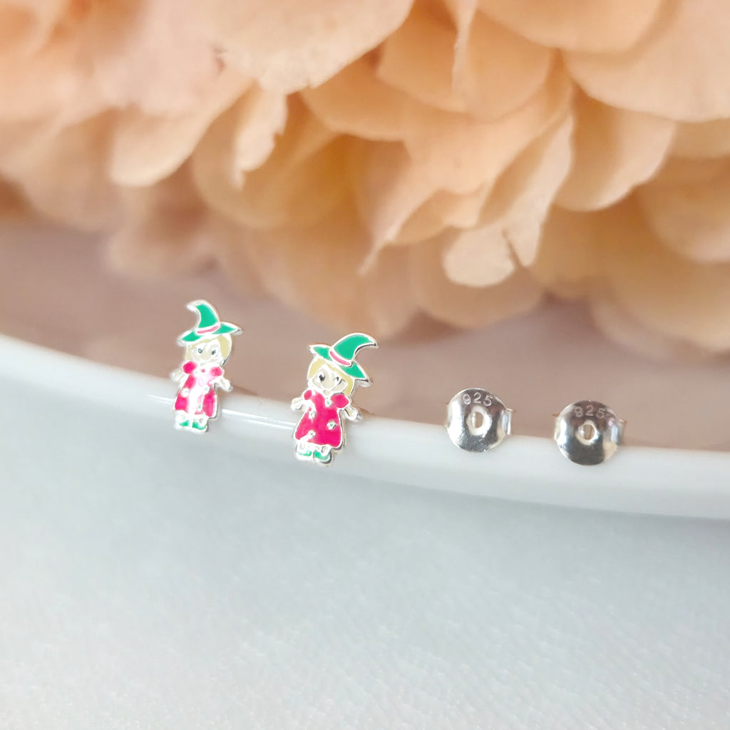 Witch in Red Dress Stud Earrings in 925 Sterling Silver – Solid Silver Halloween Studs