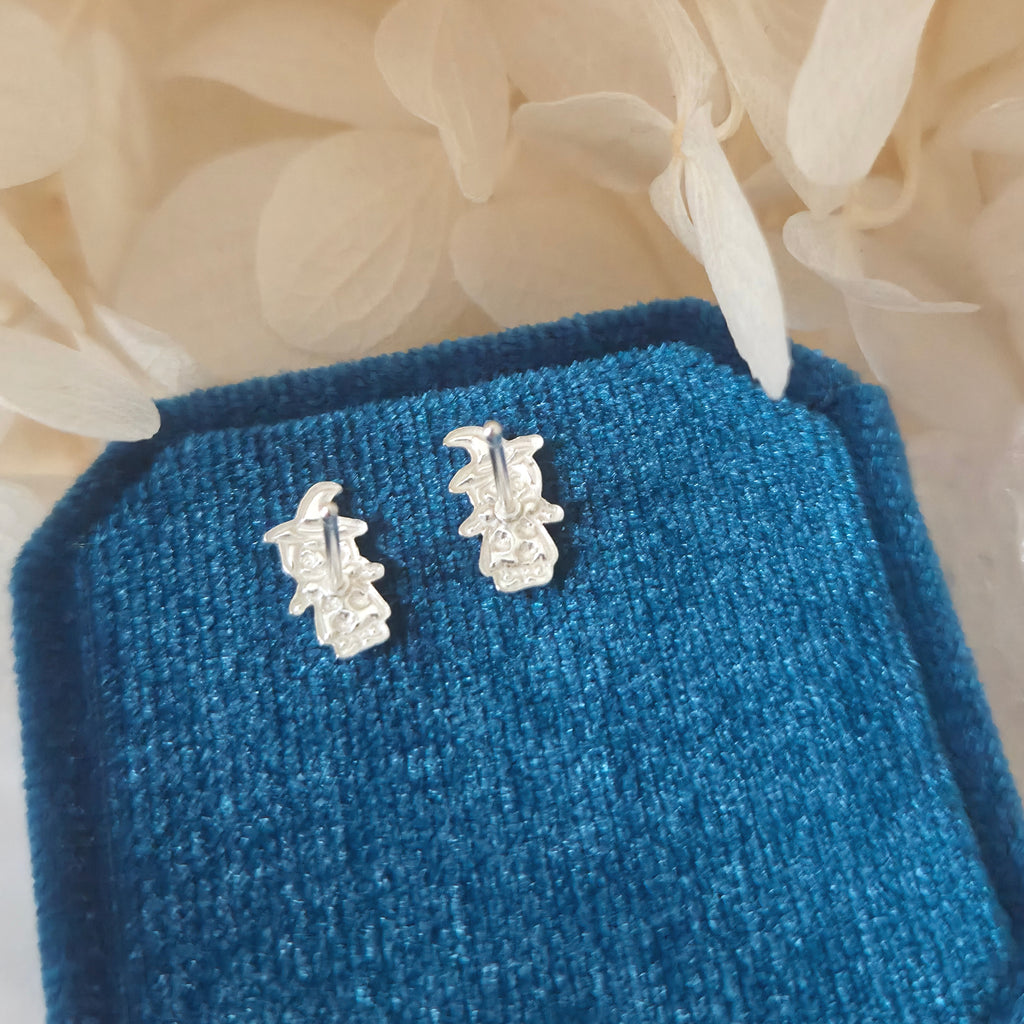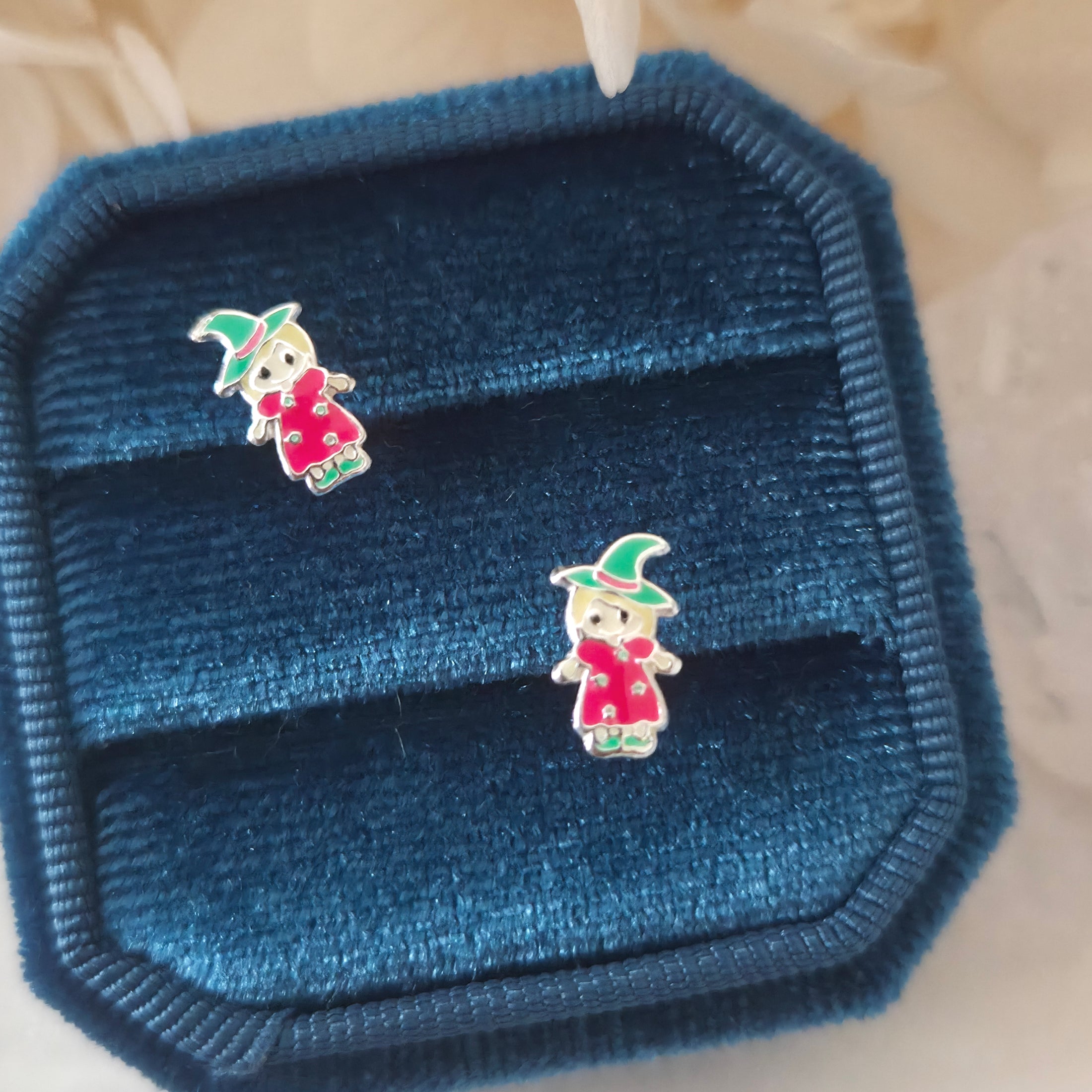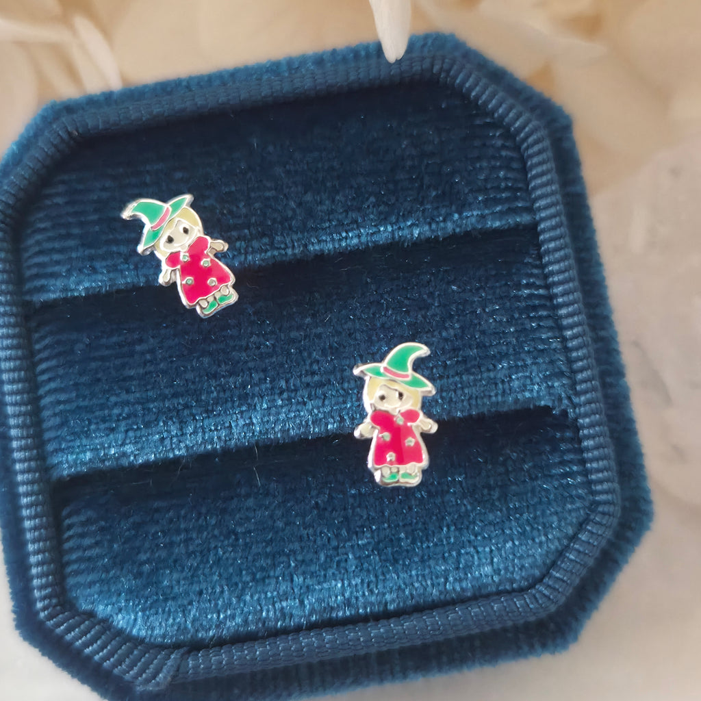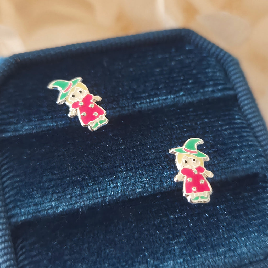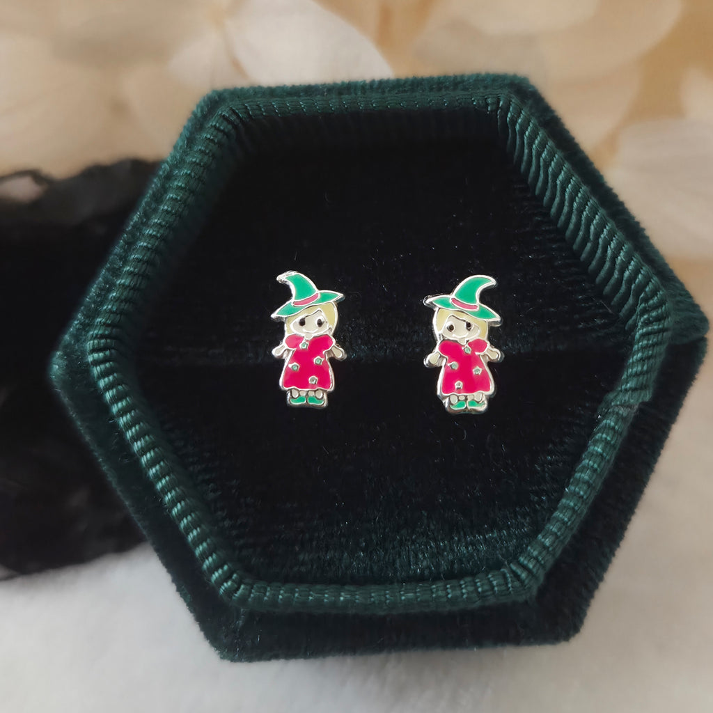 Playful and festive, these witch in red dress stud earrings are made from 925 sterling silver with colorful enamel accents. Perfect for adding a magical touch to your Halloween, Toussaint, or everyday style.