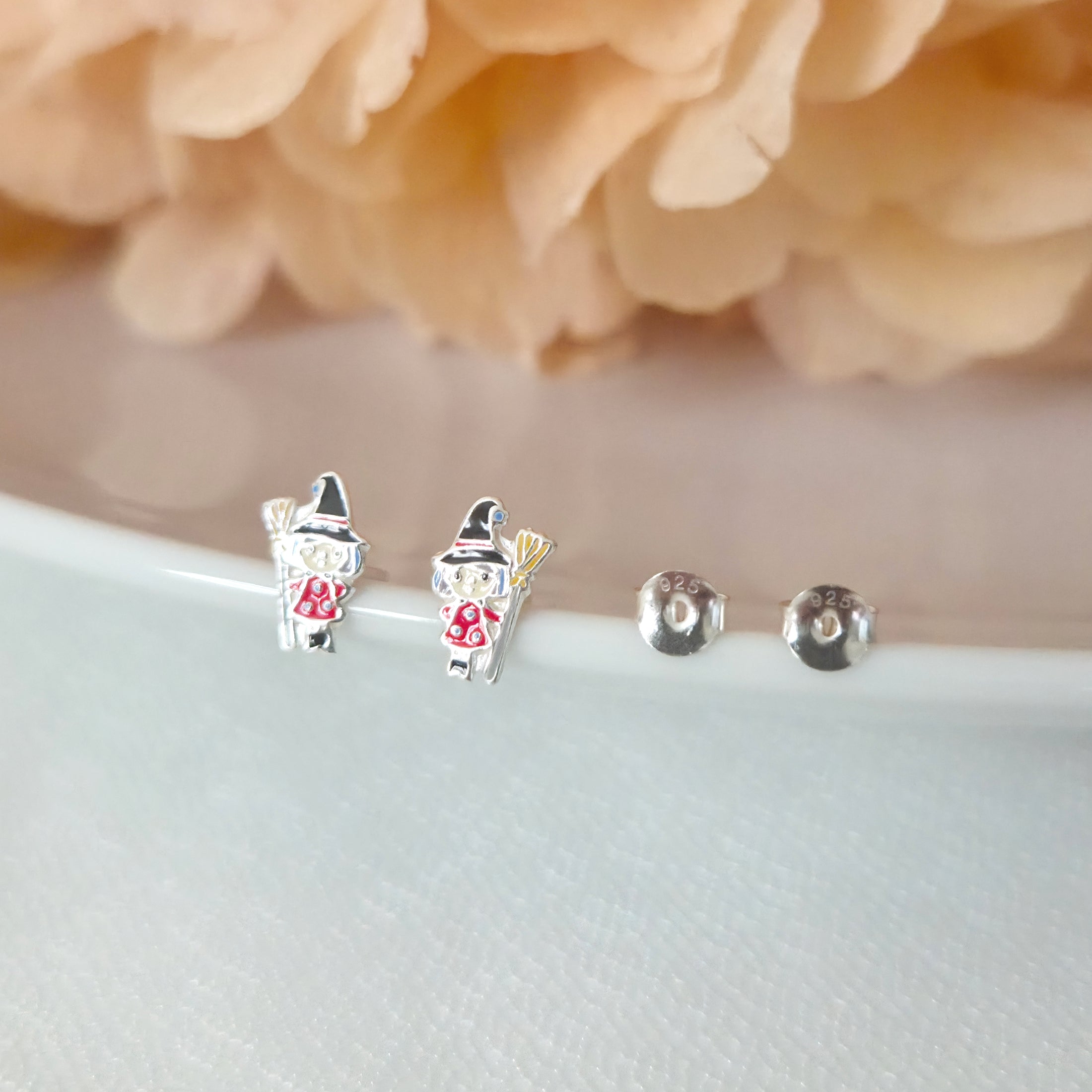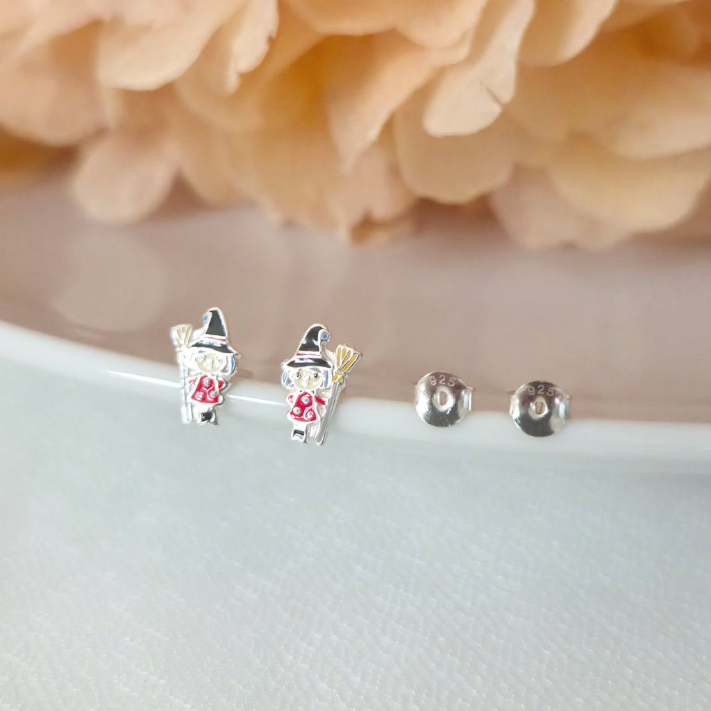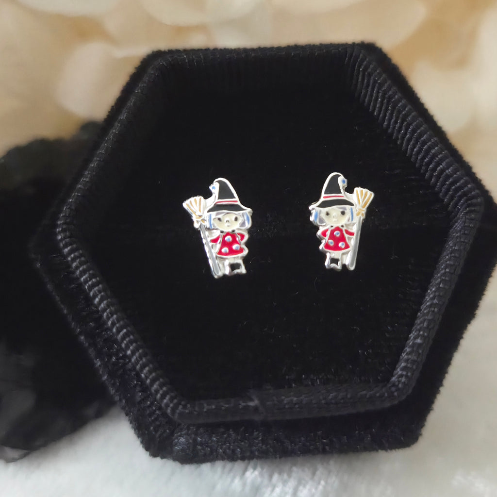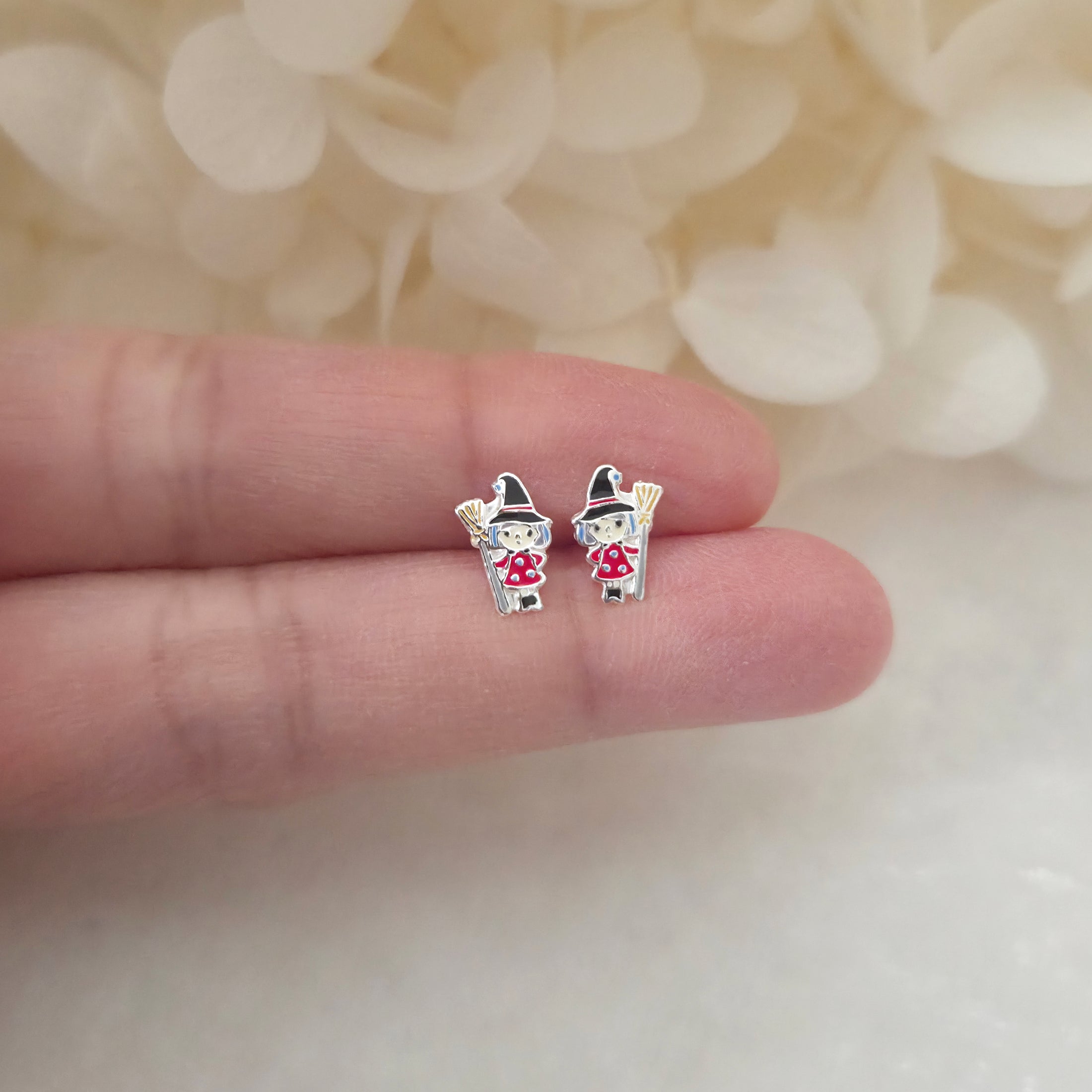 Witch in Red Dress with Broom Stud Earrings in 925 Sterling Silver – Solid Silver Halloween Studs
