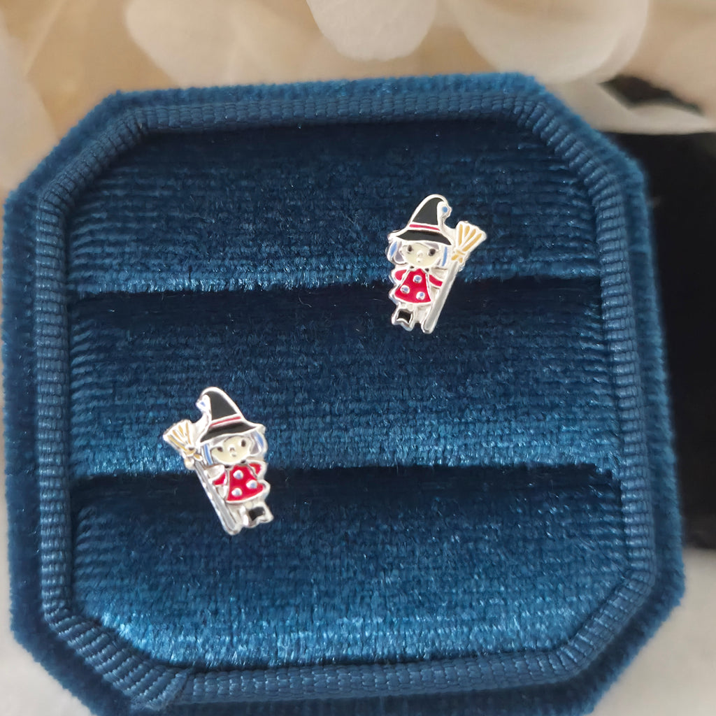 Charming and festive, these witch in red dress with broom stud earrings are crafted from 925 sterling silver with detailed enamel accents. A perfect accessory to celebrate Halloween, Toussaint, or to add a touch of fun magic to your everyday look.